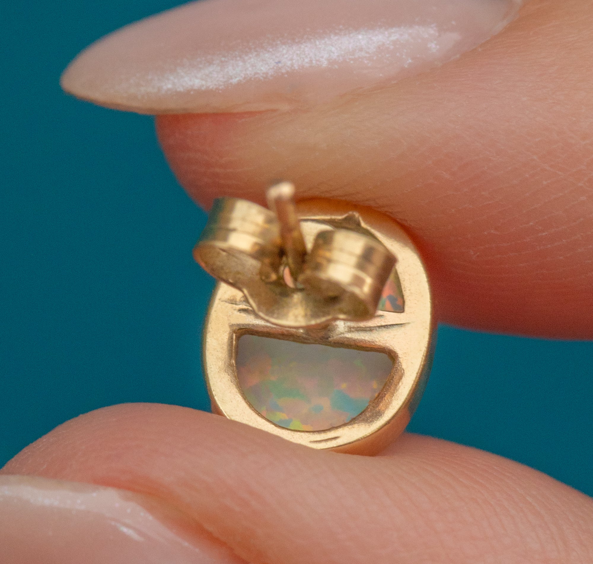 Each Opal glistens as it catches the light, revealing a dazzling spectrum of colours. Paired with comfortable posts and secure butterfly backs, these vintage Gold studs will rest snugly in your earlobes all day.