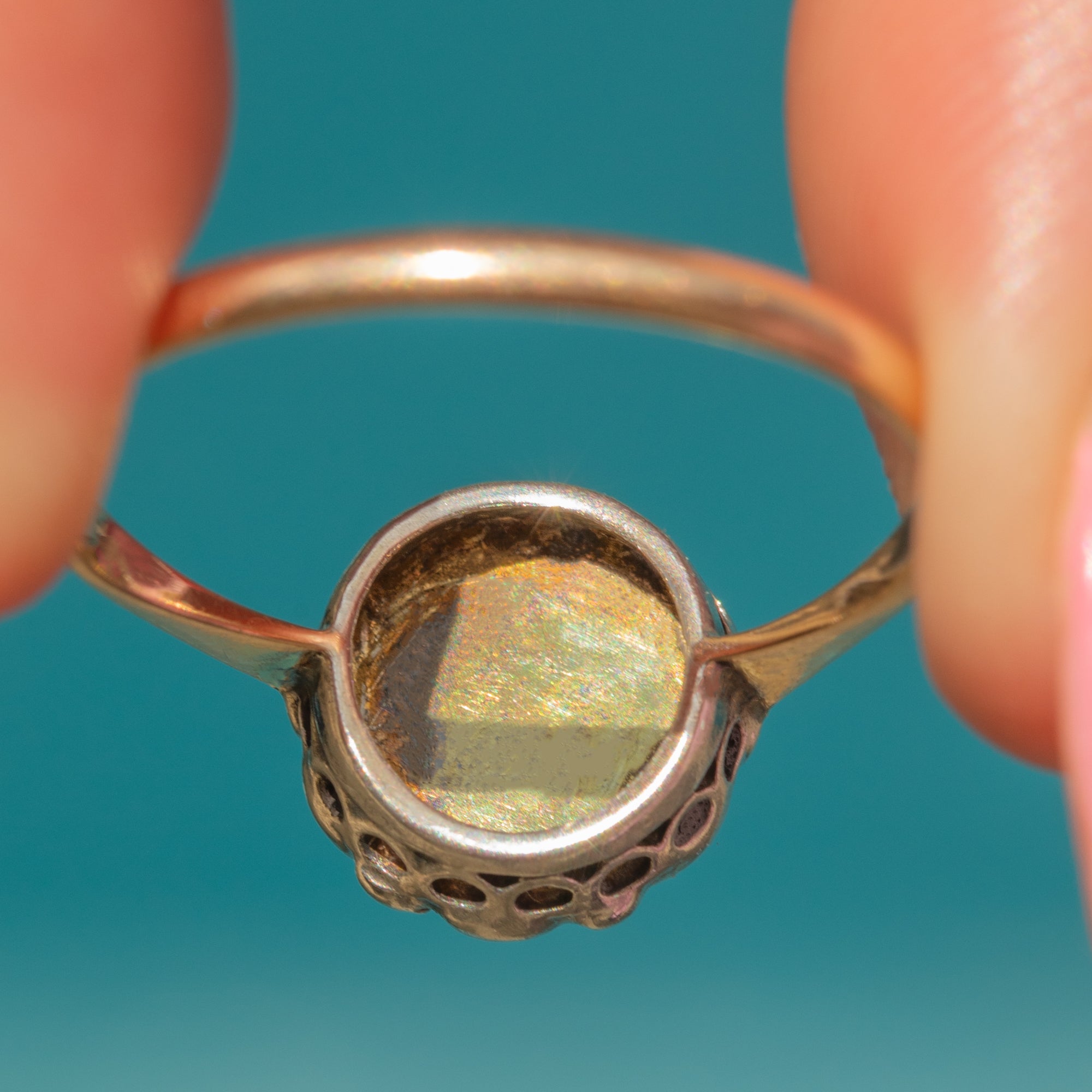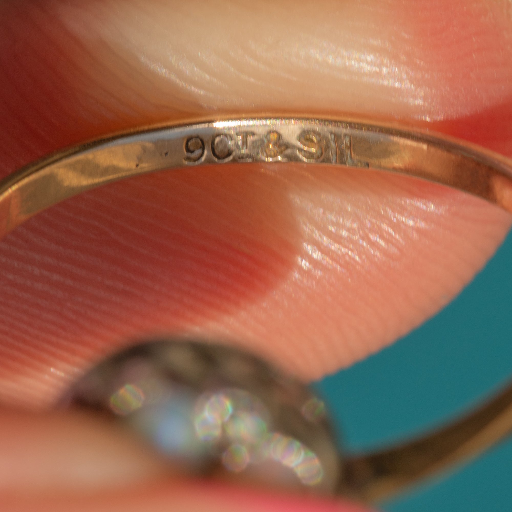 VERY GOOD: This vintage 9ct Gold Opal flower cluster ring is in very good condition. Each Opal is radiant and secure in its setting, and though there are some small fleabites, these are difficult to see without a jeweller's loupe. There are some significant signs of discolouration to the back of the ring face however, this cannot be seen when the ring is worn. A lovely piece, this cluster ring will make a sweet addition to your collection!