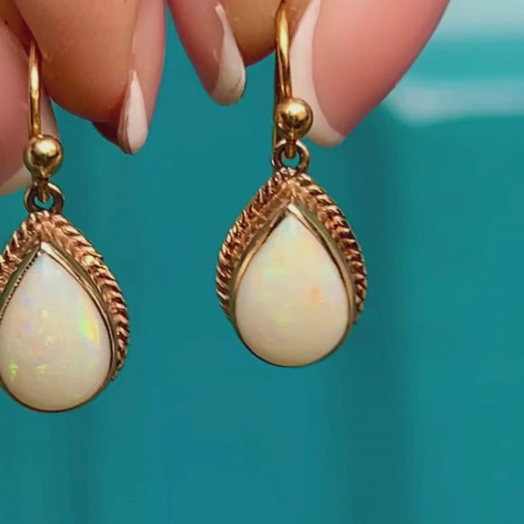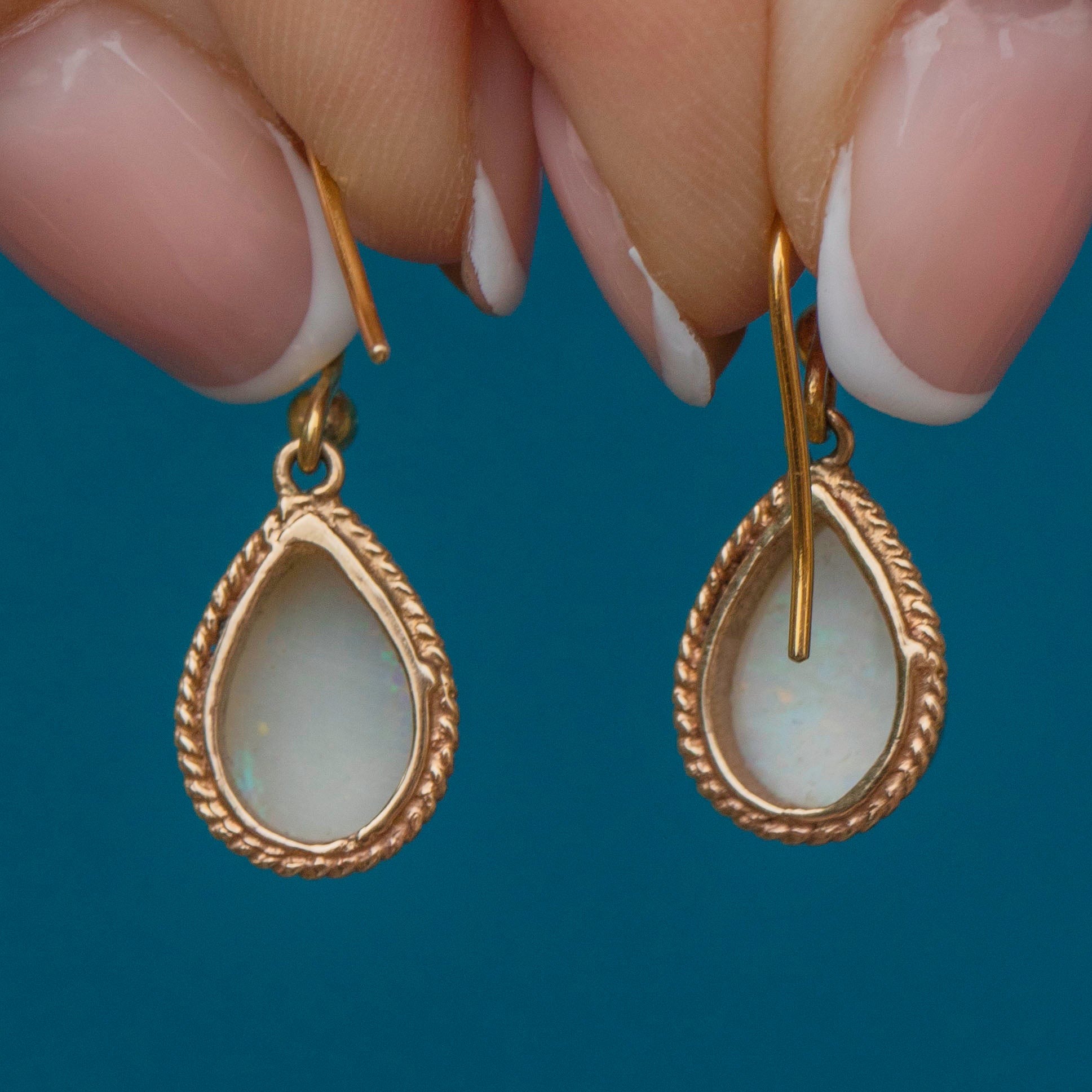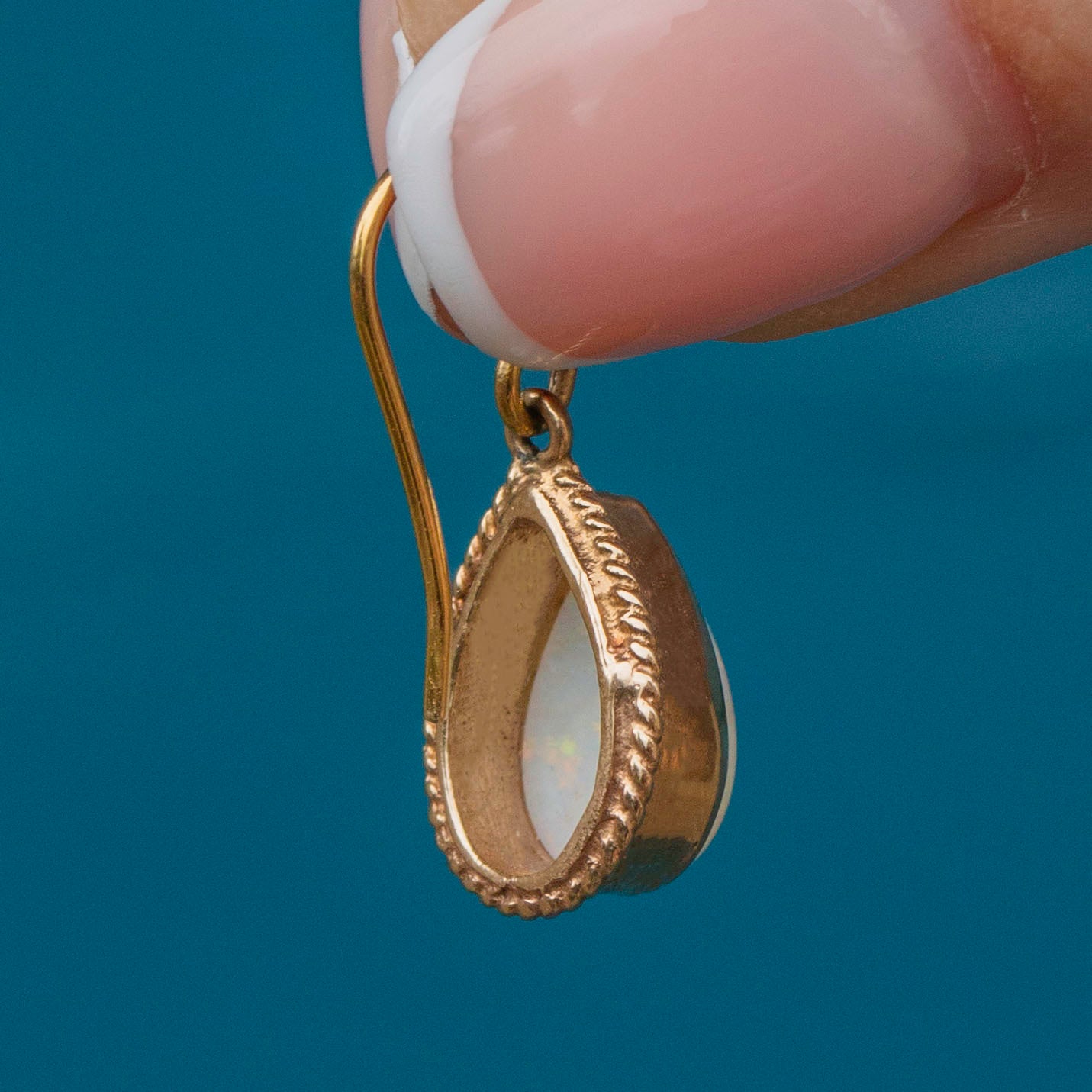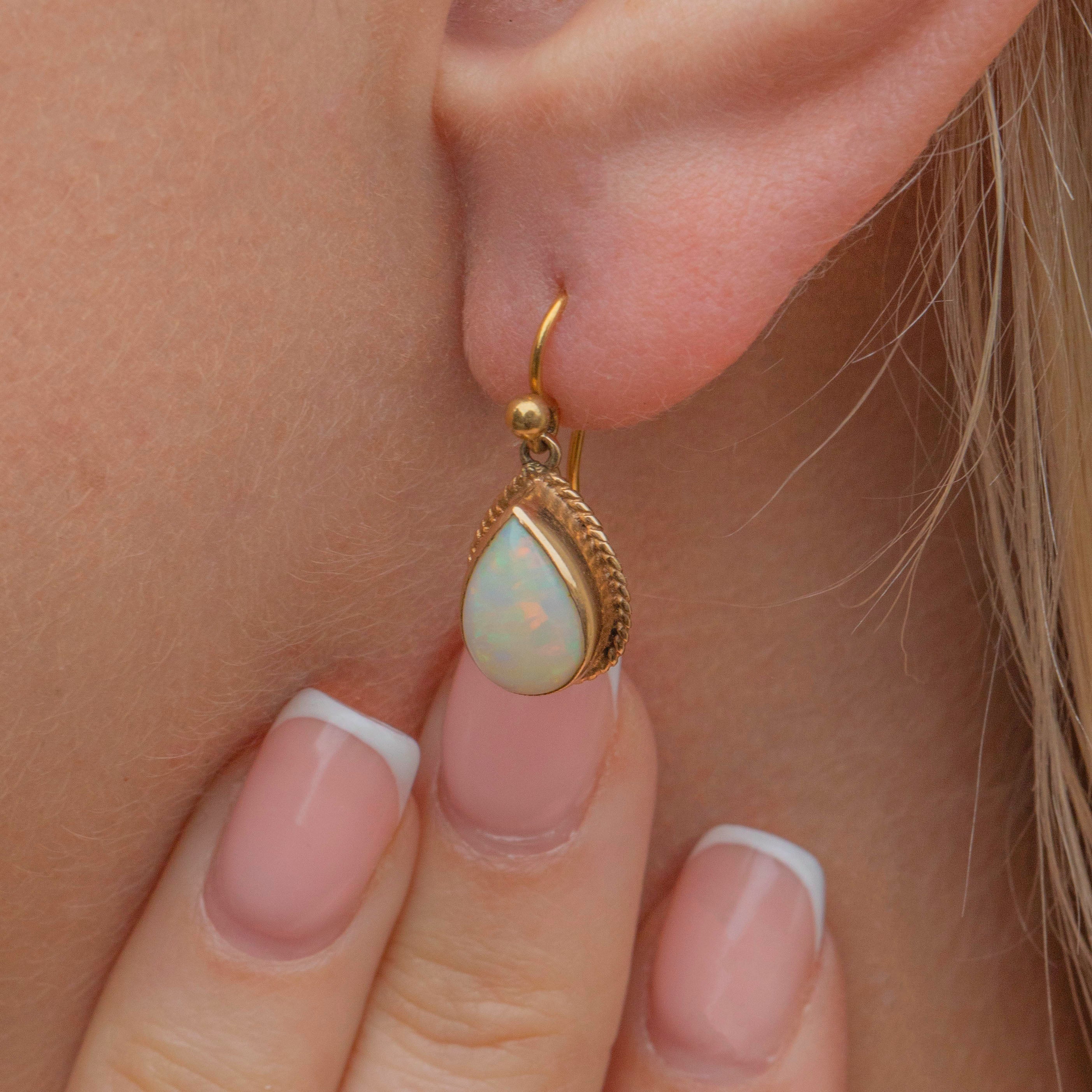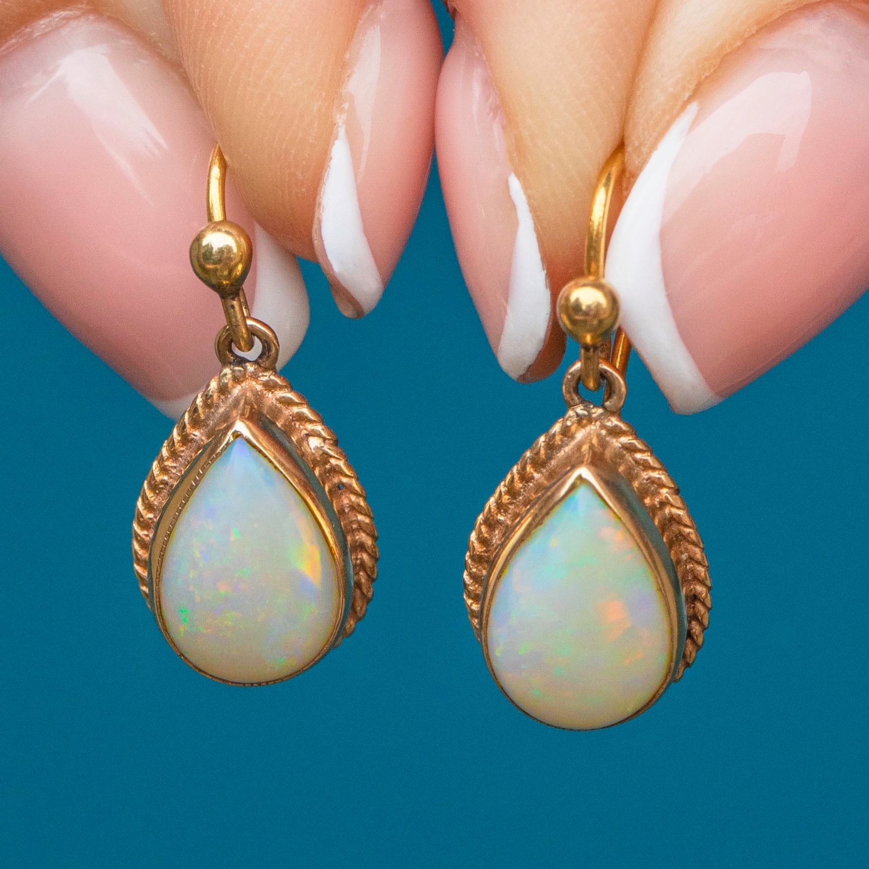 EXCELLENT. These 9ct Gold Opal pear drop earrings are in excellent condition! They boast beautiful, completely natural Opals with lively colours and are free from chips or scuffs. The Gold is buttery and the bezels robust, keeping the Opals securely in place. Complete with slender ear hooks, you can wear these delightful vintage Opal earrings comfortably for years to come!