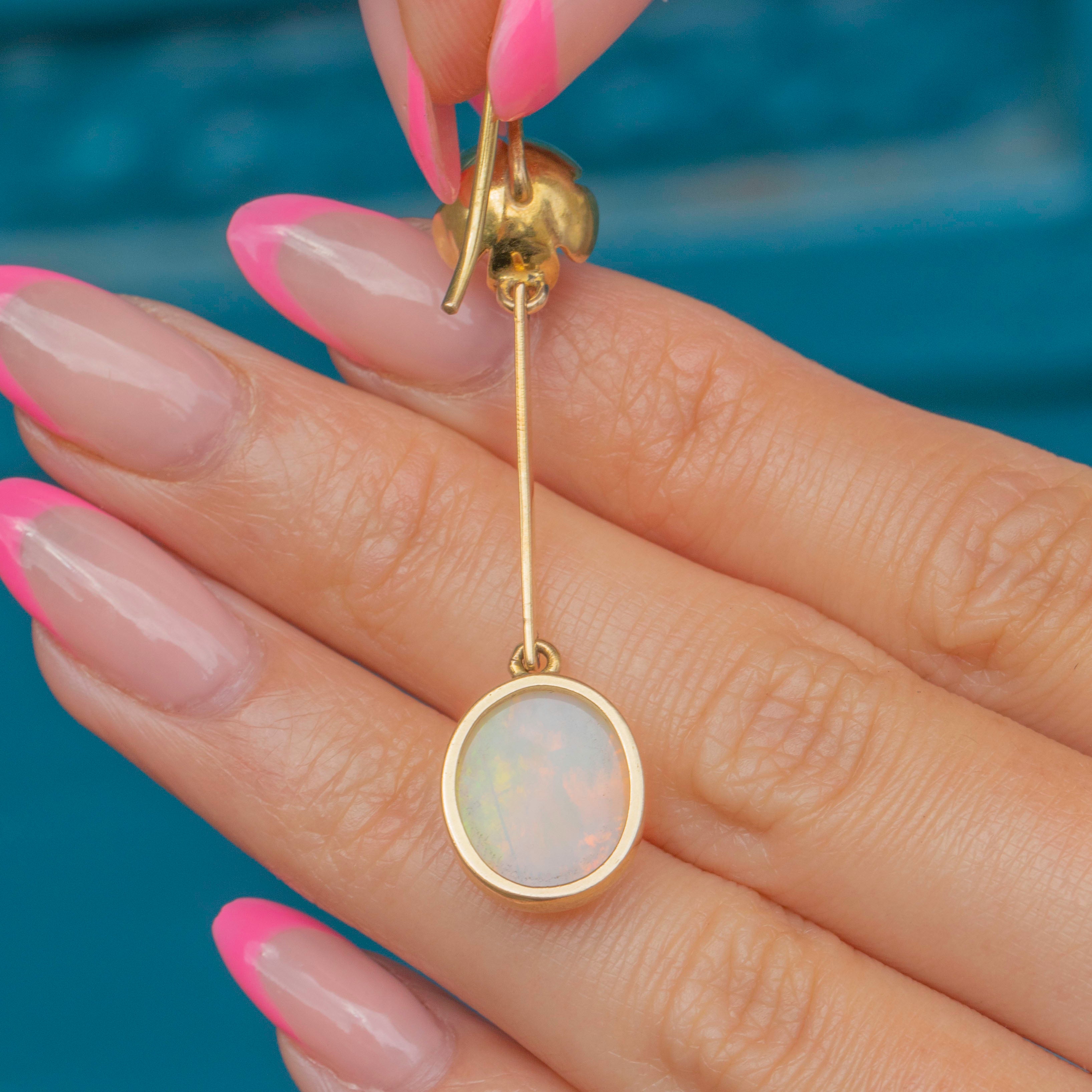 Crafted from buttery 9ct Gold, these whimsical drop earrings each suspend a plump oval Opal, catching the light beautifully and radiating a kaleidoscope of vibrant blues greens and orange.