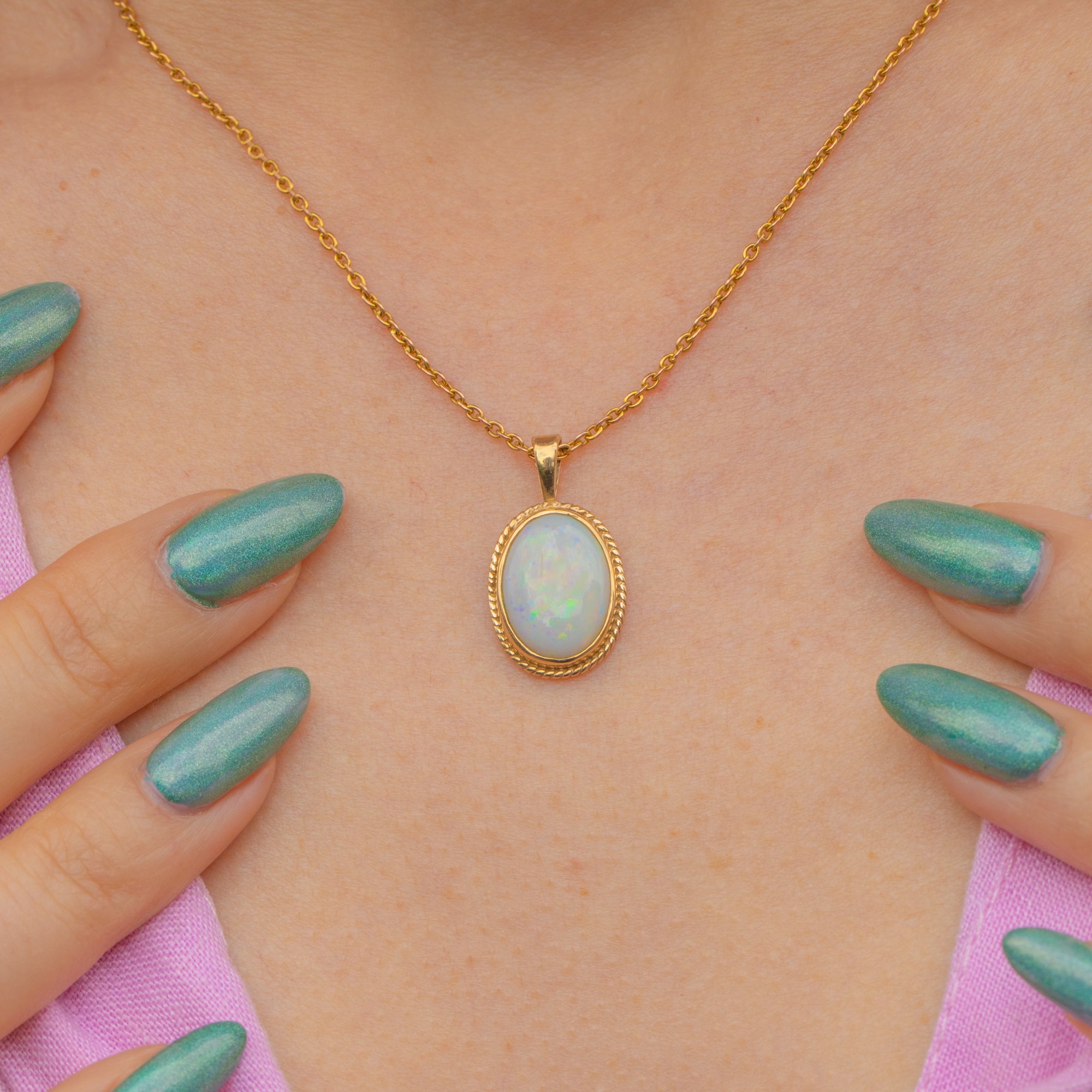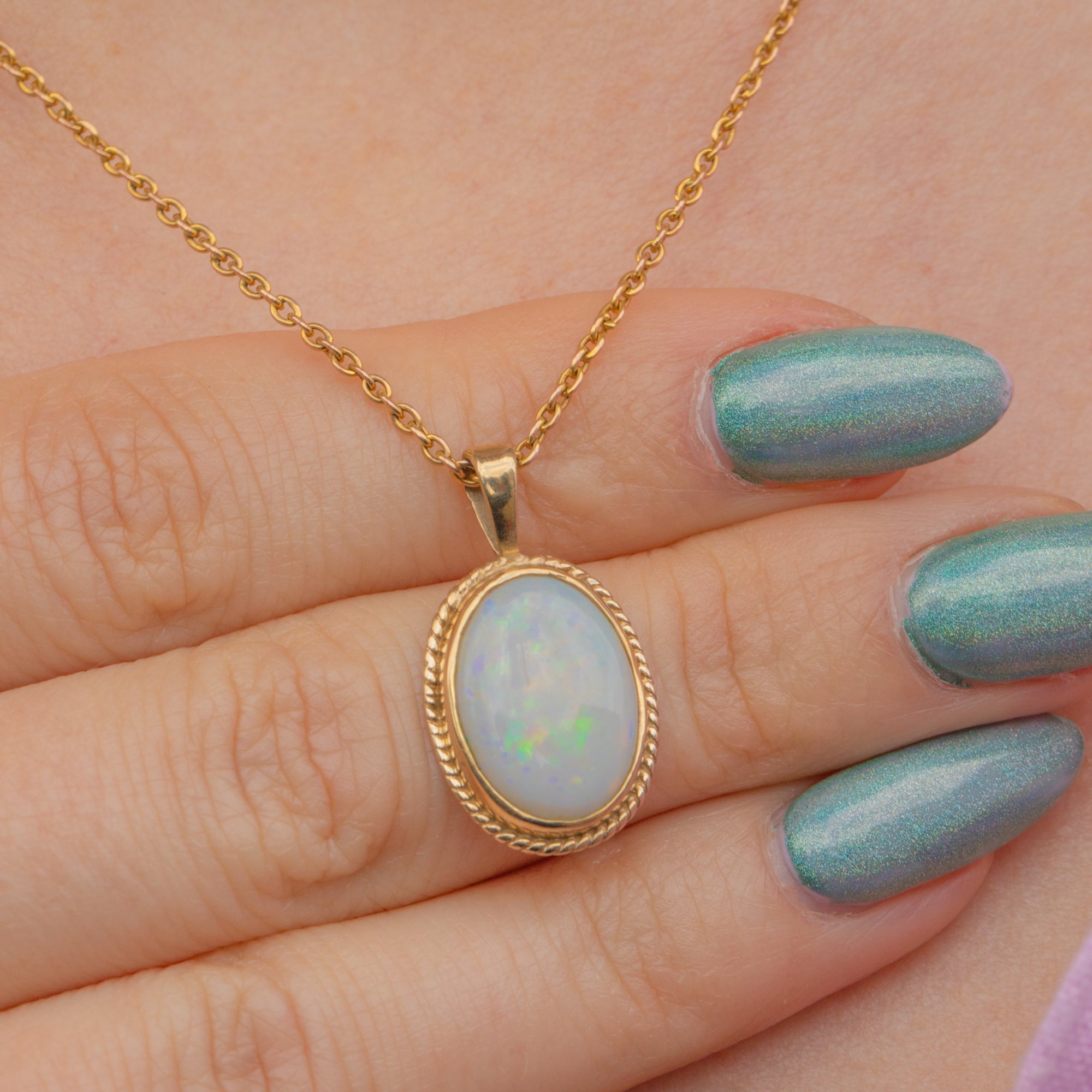 This gorgeous 9ct Gold Opal pendant will look sublime once suspended from a fine Gold chain across your décolletage! The milky Opal cabochon reveals shimmers of neon greens and yellows, with hints of blue and orange, wrapped up in solid 9ct Gold with a rope border adding a decorative finish.