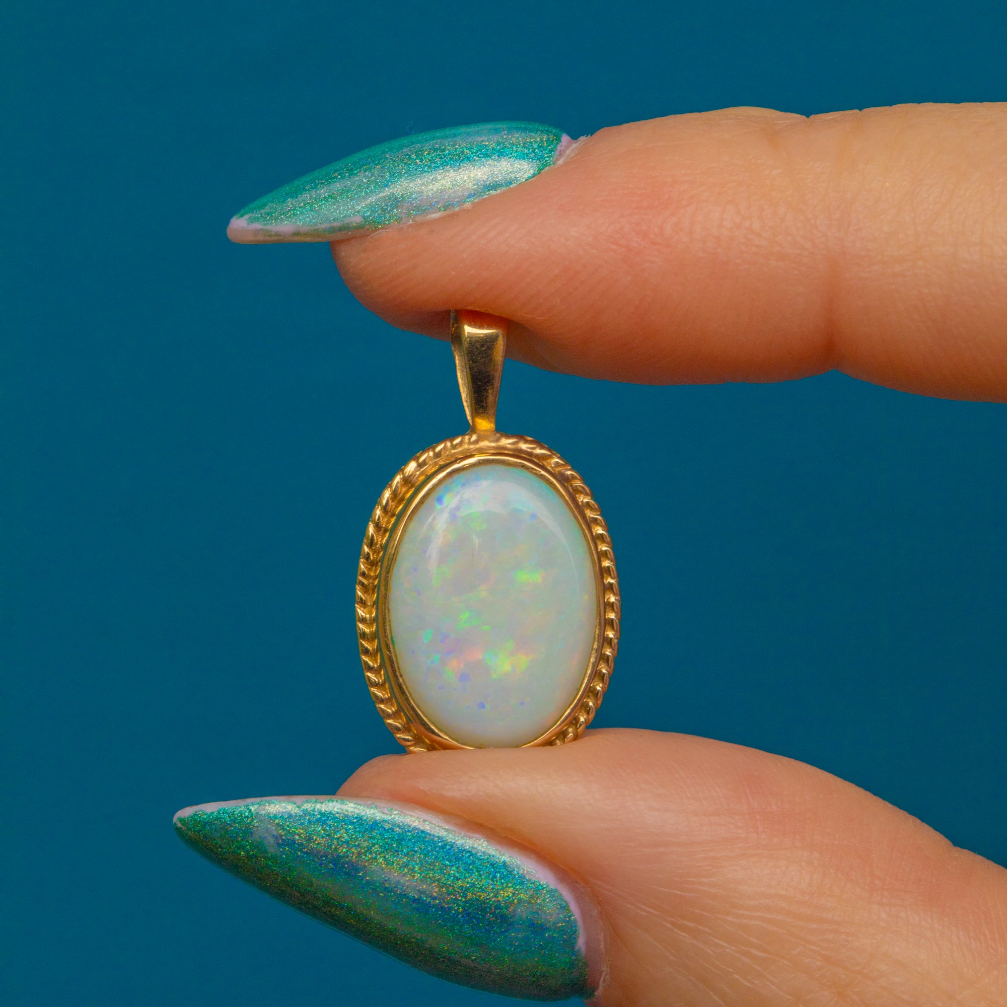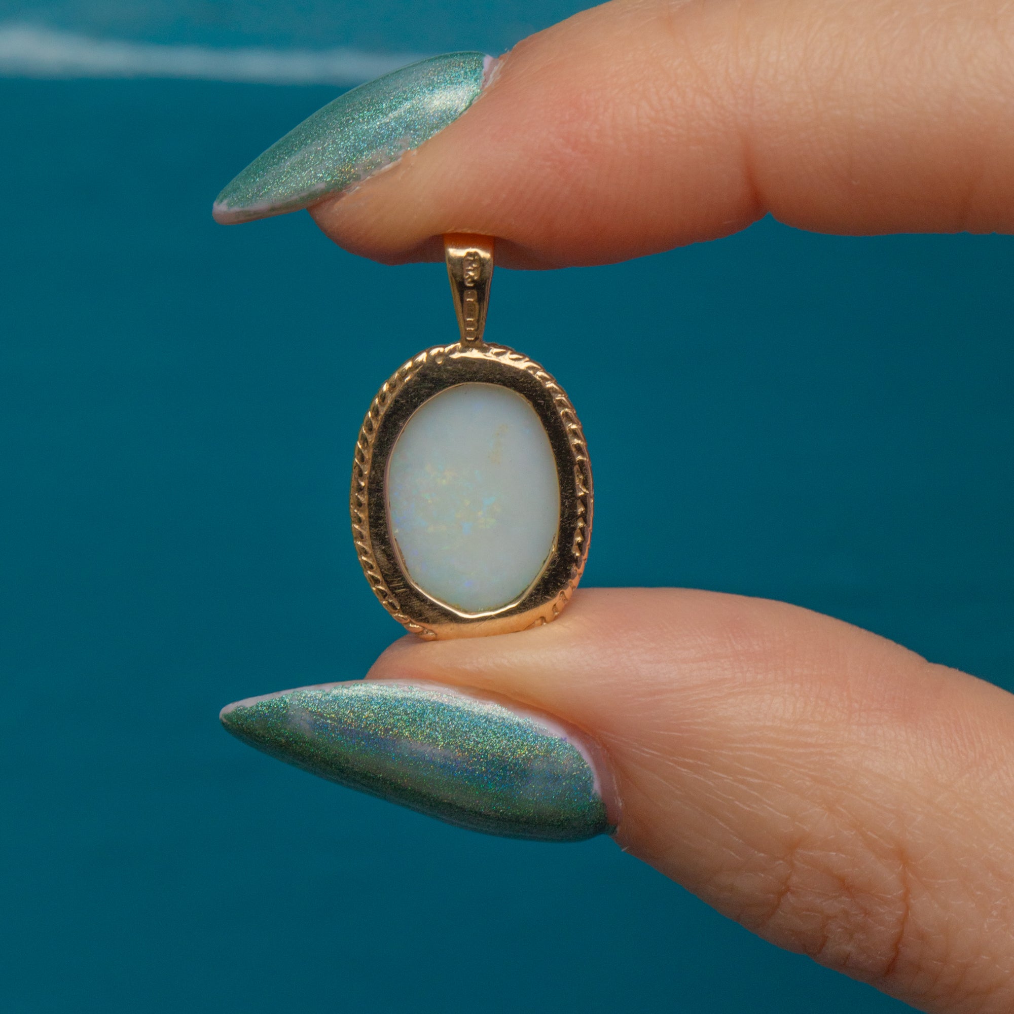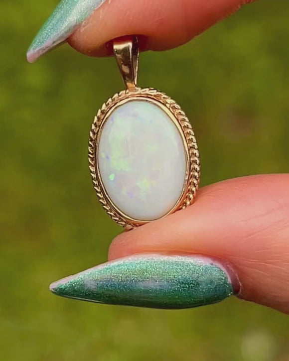 VERY GOOD. This 9ct Gold Opal pendant is in very good condition. The Opal cabochon is smooth with only one small scratch on the surface, noticeable under very close inspection, and is securely held within its bezel. The Gold is buttery and the rope border is firmly affixed with no signs of wear. There is a little wear on the back of the pendant, but this does not affect the integrity of the piece and cannot be seen while the pendant is being worn. With a sturdy bale, all this striking Opal pendant needs is a chain to adorn!