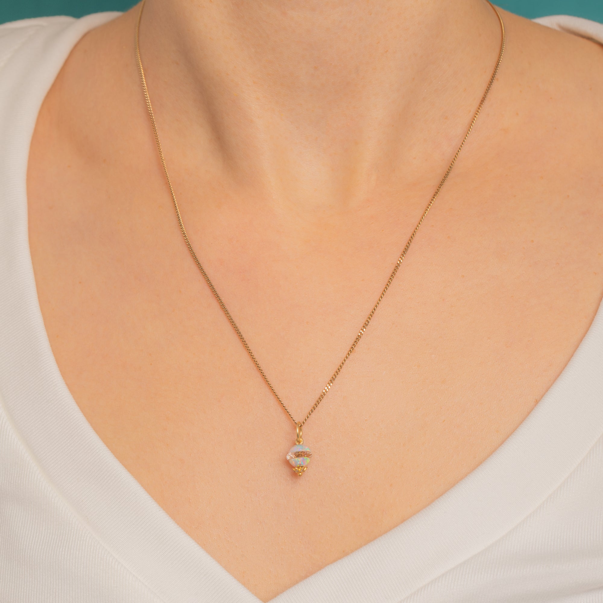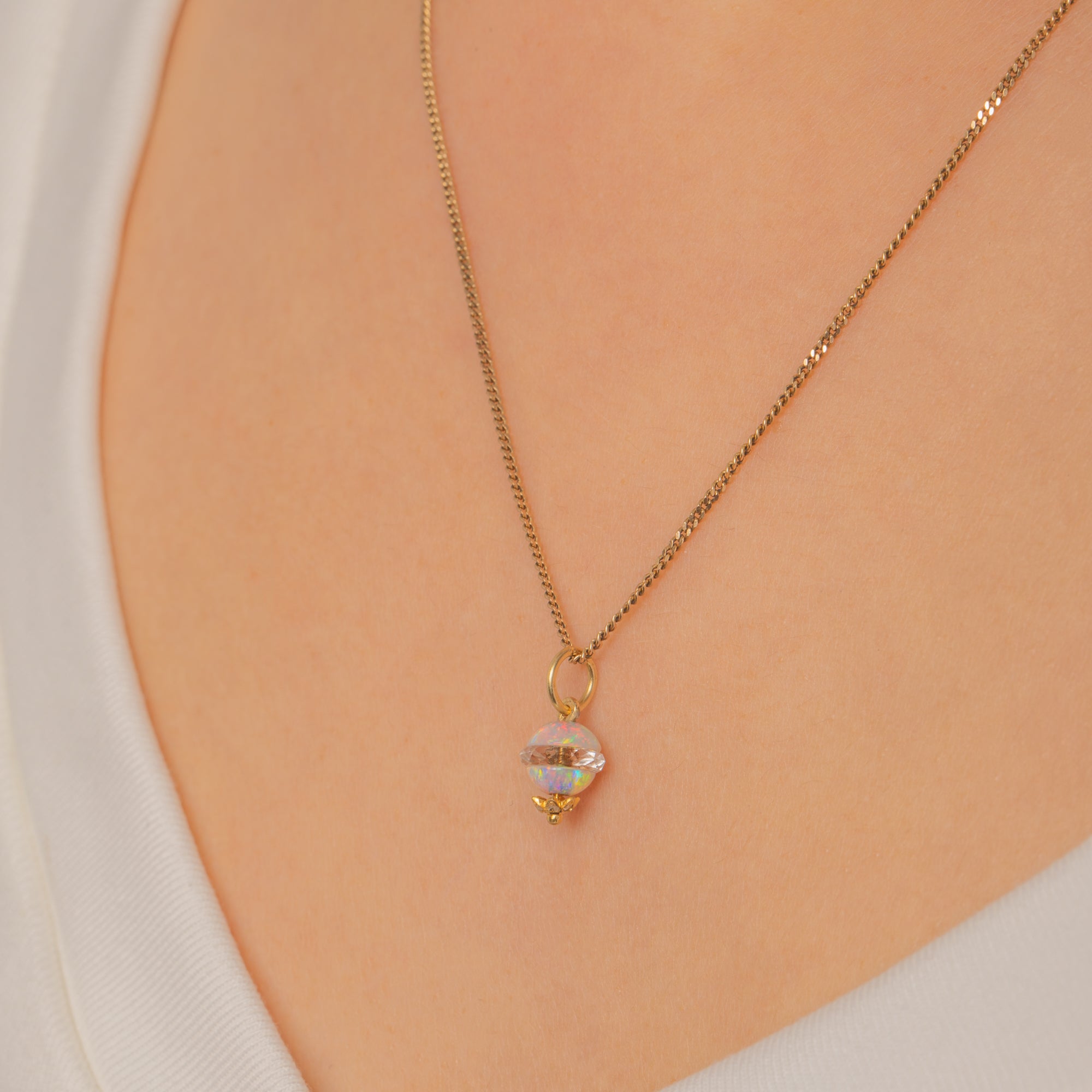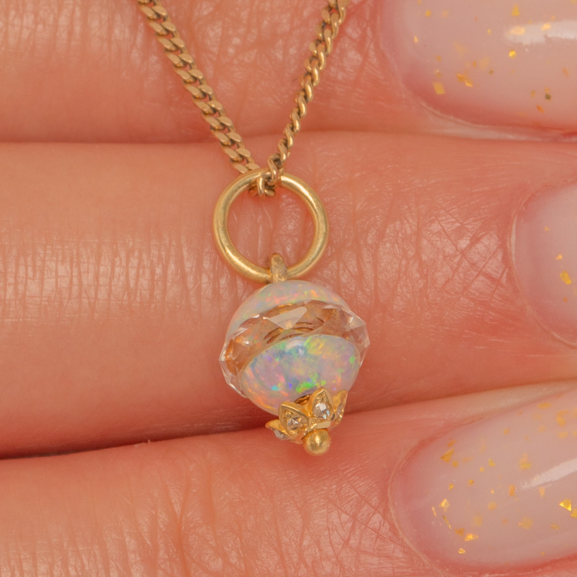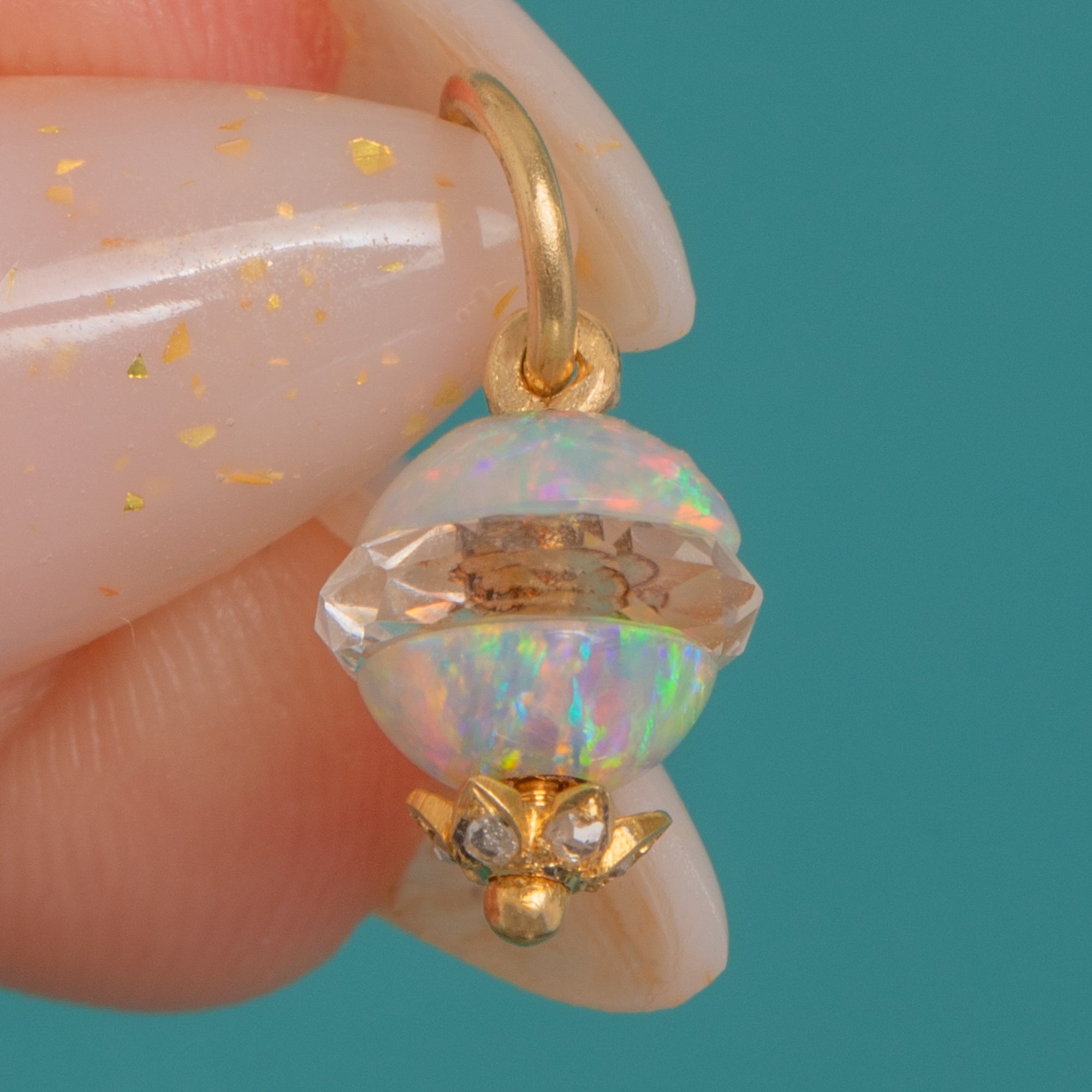 This dainty Victorian orb pendant is a tiny treasure in 9ct Gold, its planet-like silhouette formed by two luminous Opal domes divided by a sparkling faceted Rock Crystal “ring”. Crowning the orb is a petite trefoil cap set with tiny rose-cut Diamonds, finished with a neat granule finial and a soldered jump ring for effortless wear.