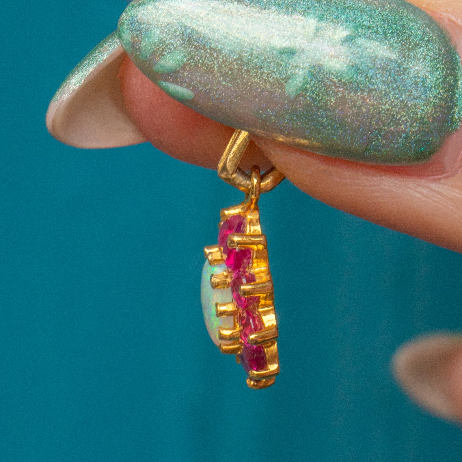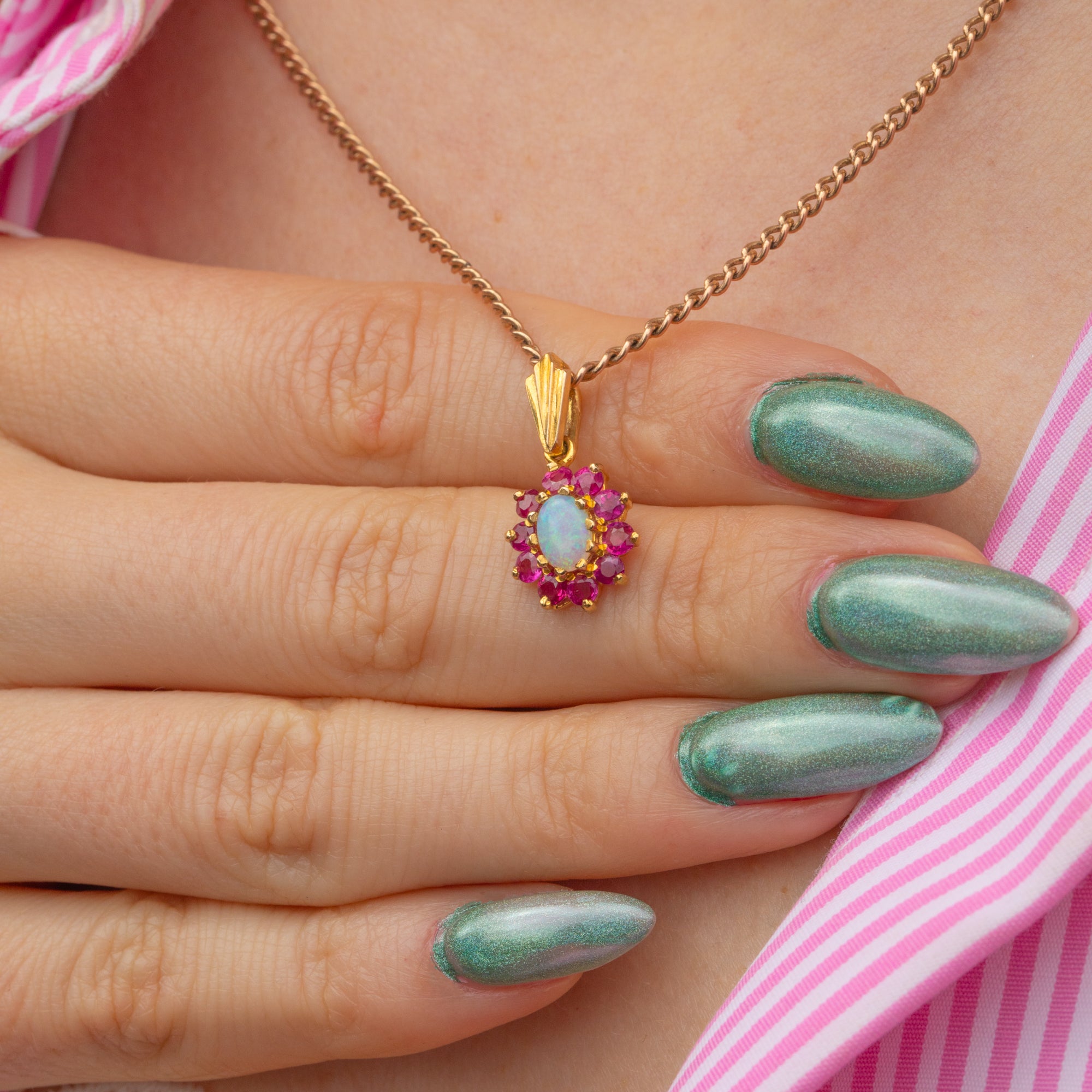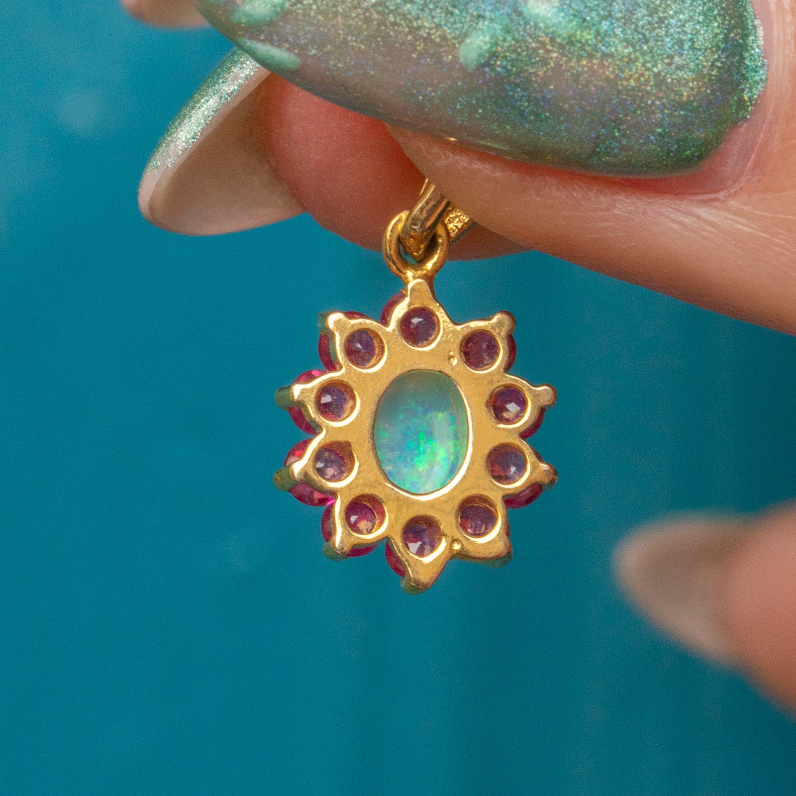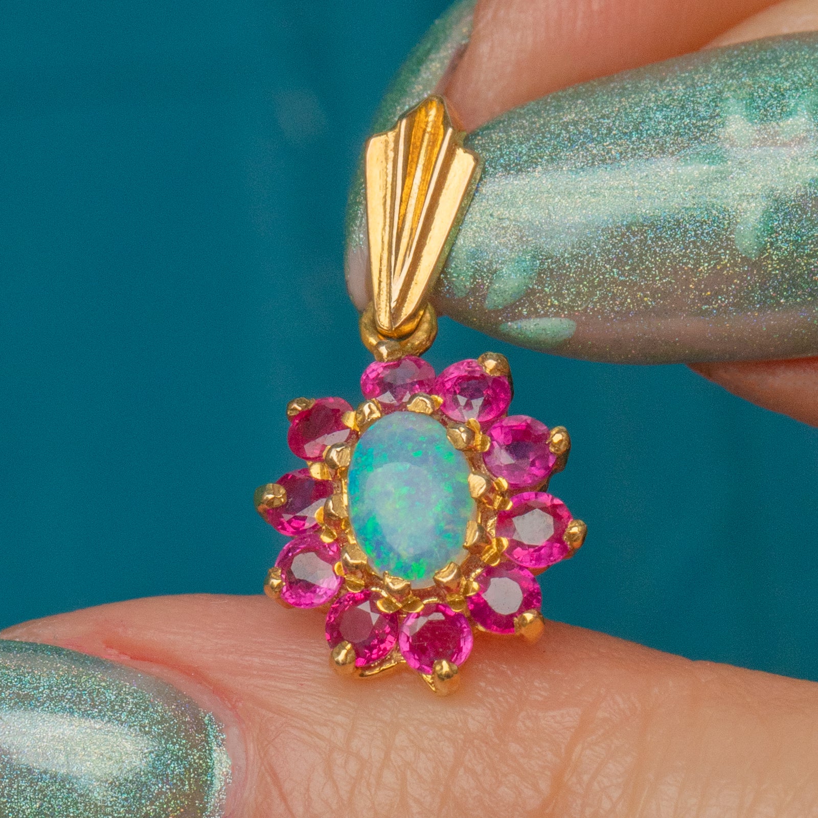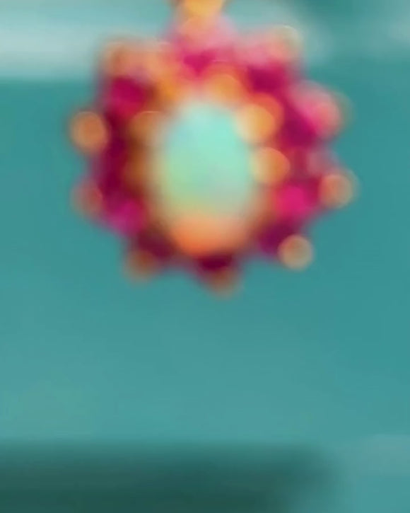 This 9ct Gold Opal ruby flower cluster charm is bursting with vibrancy and opulence! A fiery Opal is poised at her centre, with a galactic display of neon greens and vivid peach flashing across her surface. A halo of fuchsia Rubies encases her Opal, bringing femininity in abundance to this vintage cluster pendant.