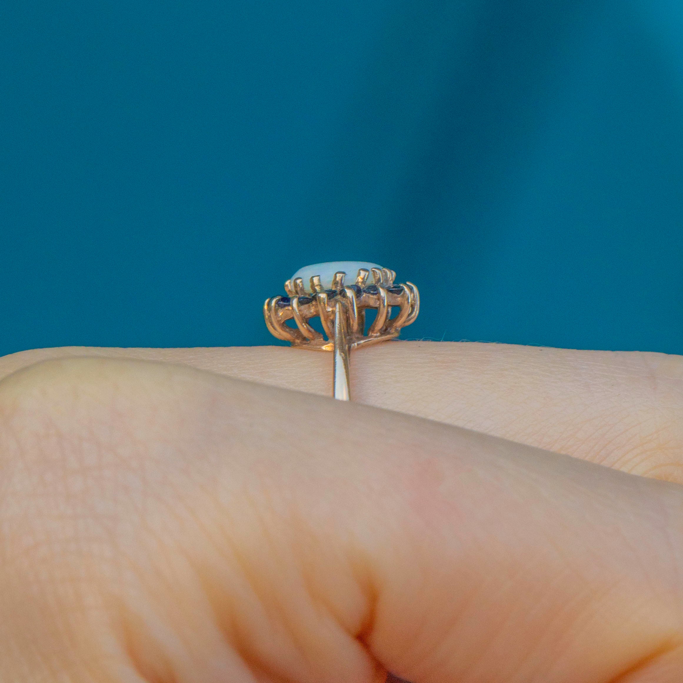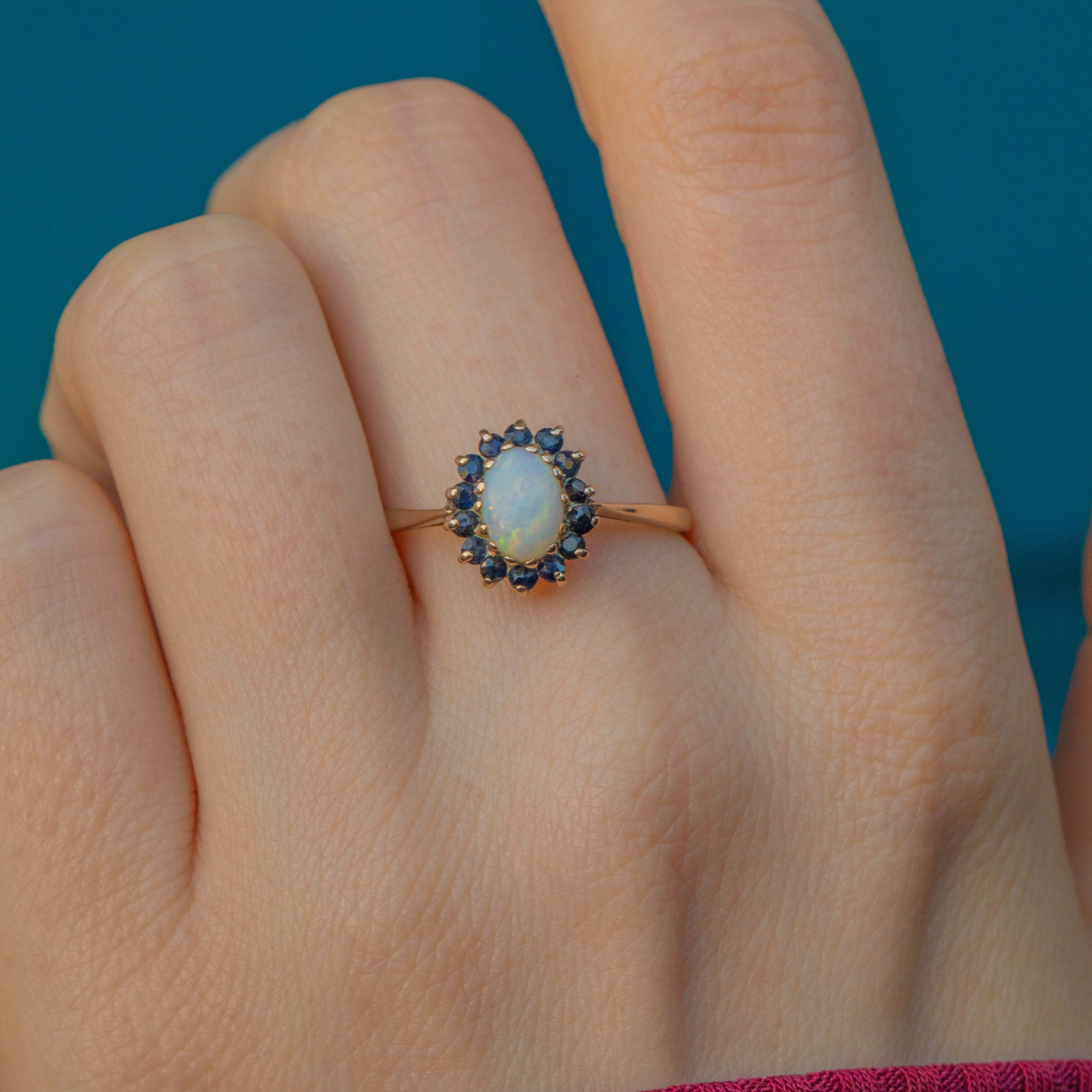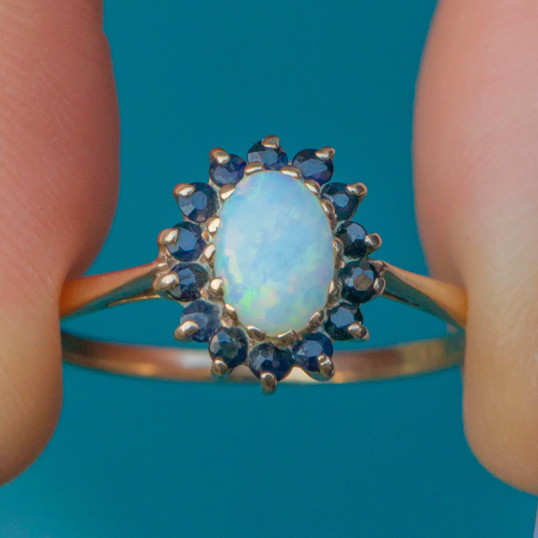 EXCELLENT. This 9ct Gold Opal Sapphire cluster ring is in excellent condition. The Gold is buttery and the band is smooth, with a full set of hallmarks dating to 1987 that have remained legible. The gemstones are free from surface wear and securely set, promising many more years of wear and enjoyment!