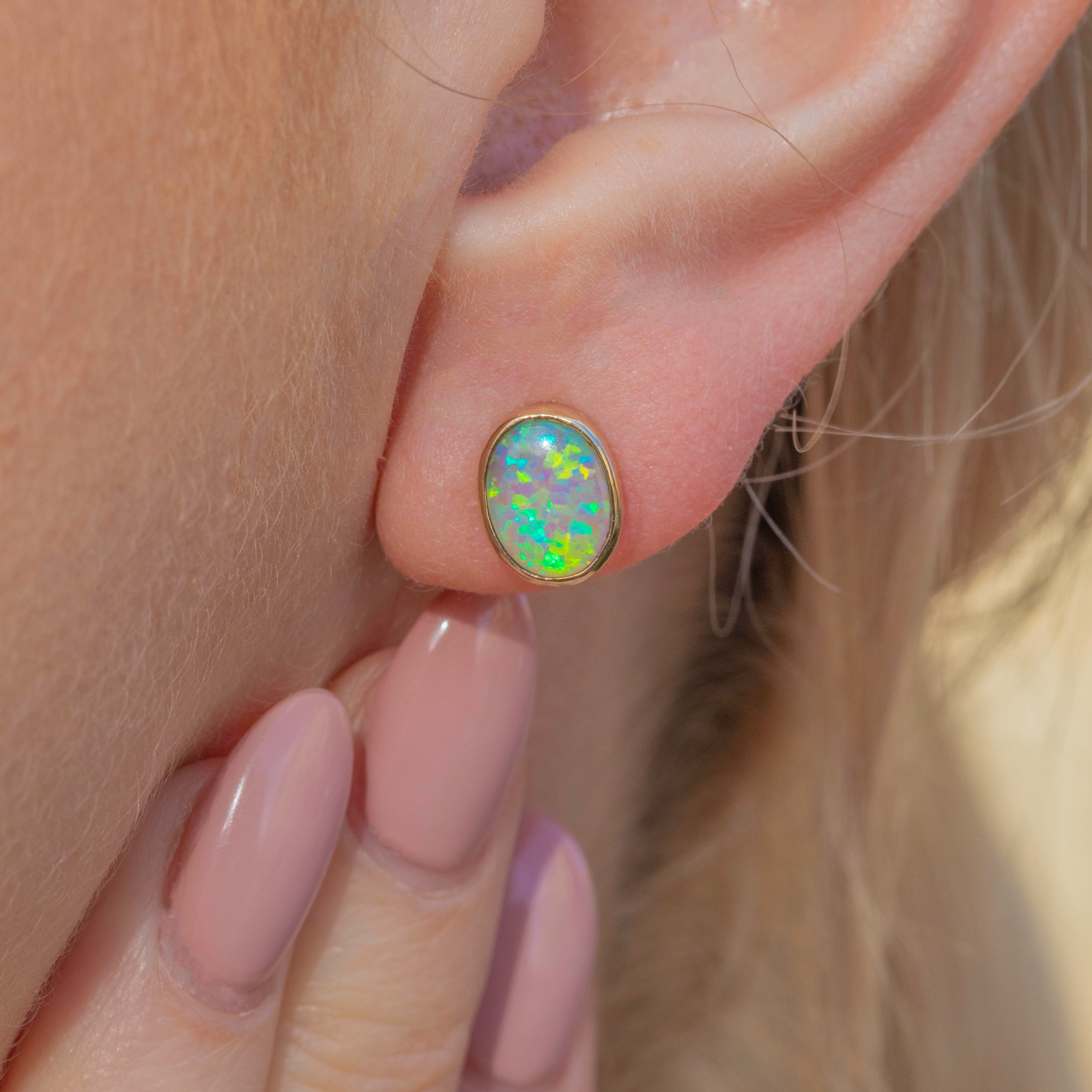 EXCELLENT. We are pleased to present these 9ct Gold Opal stud earrings in excellent condition. The vibrant Opals catch the light beautifully and are free from any scuffs or chips. The Gold is bright and buttery and the bezels are robust, holding the Opals securely in place. With snug-fitting butterfly backs, you can wear these vintage Gold studs with absolute confidence!