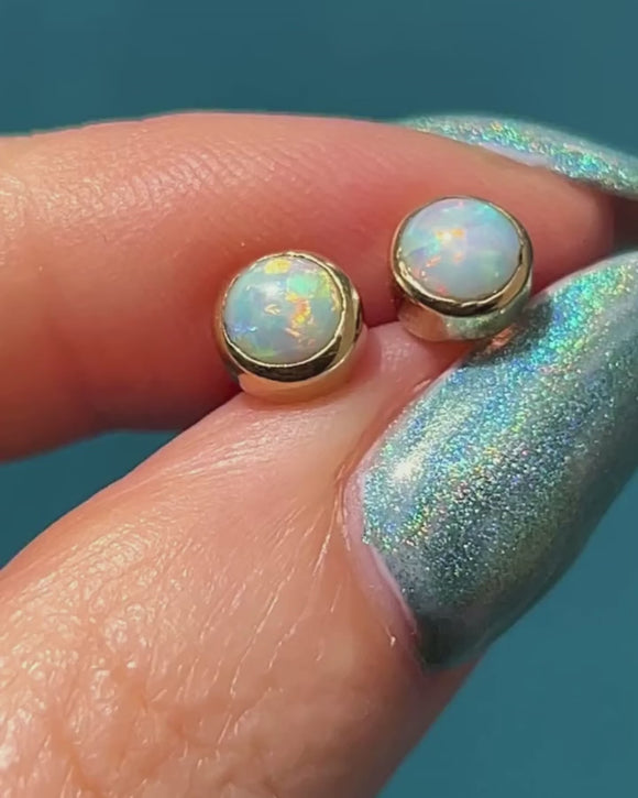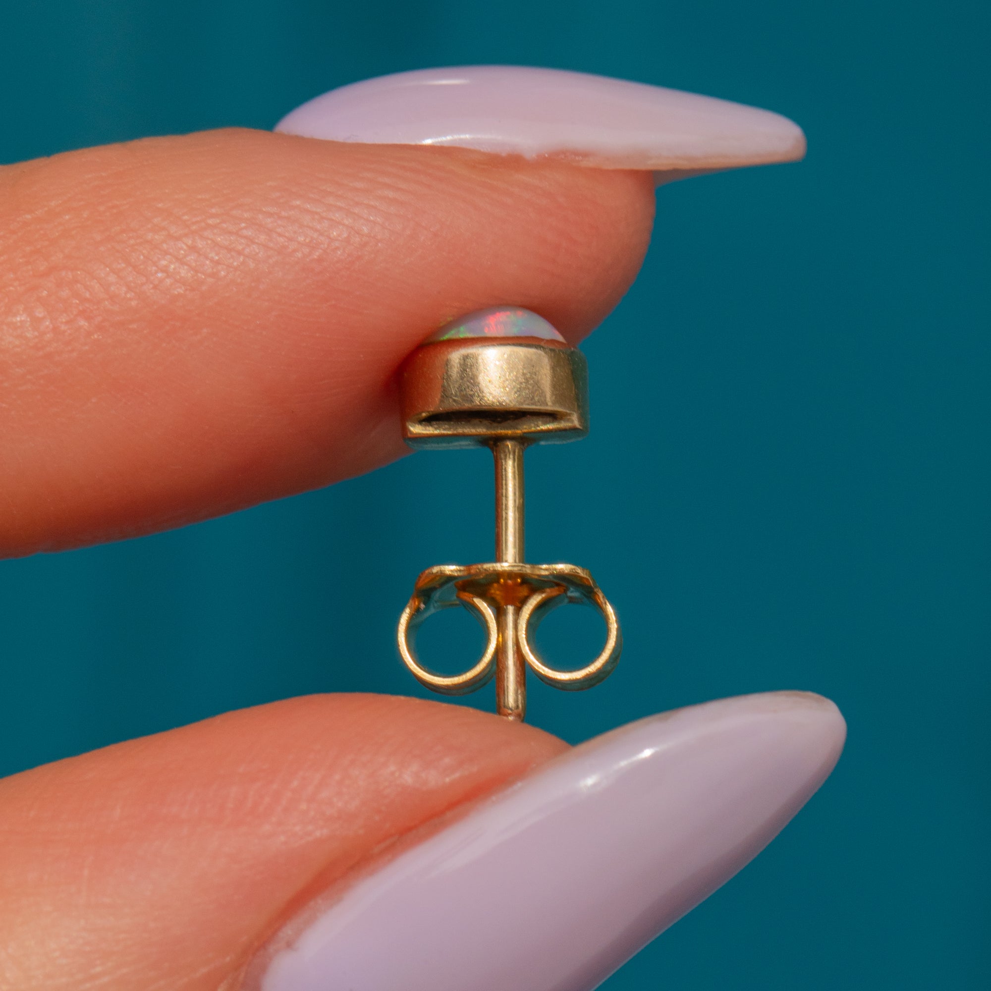 EXCELLENT. These 9ct Gold Opal stud earrings are in tip-top condition! The Opals are secure within their settings, smooth to the touch, and offer a wonderful play of colour. The bezel settings are in mint condition with a lovely saturation throughout. With securely soldered ear posts and tight-fitting butterfly backs, these Victorian earrings can be worn with confidence!
