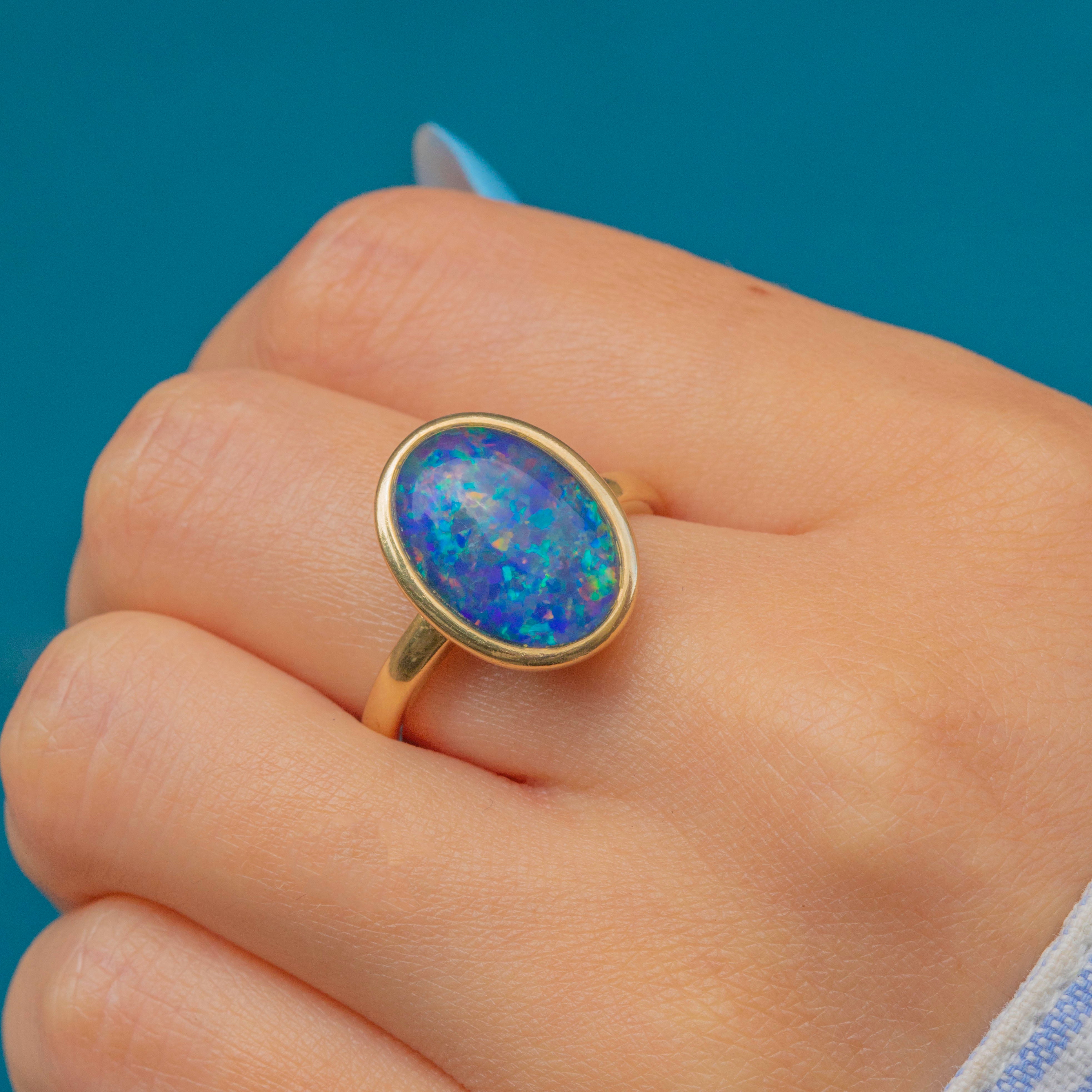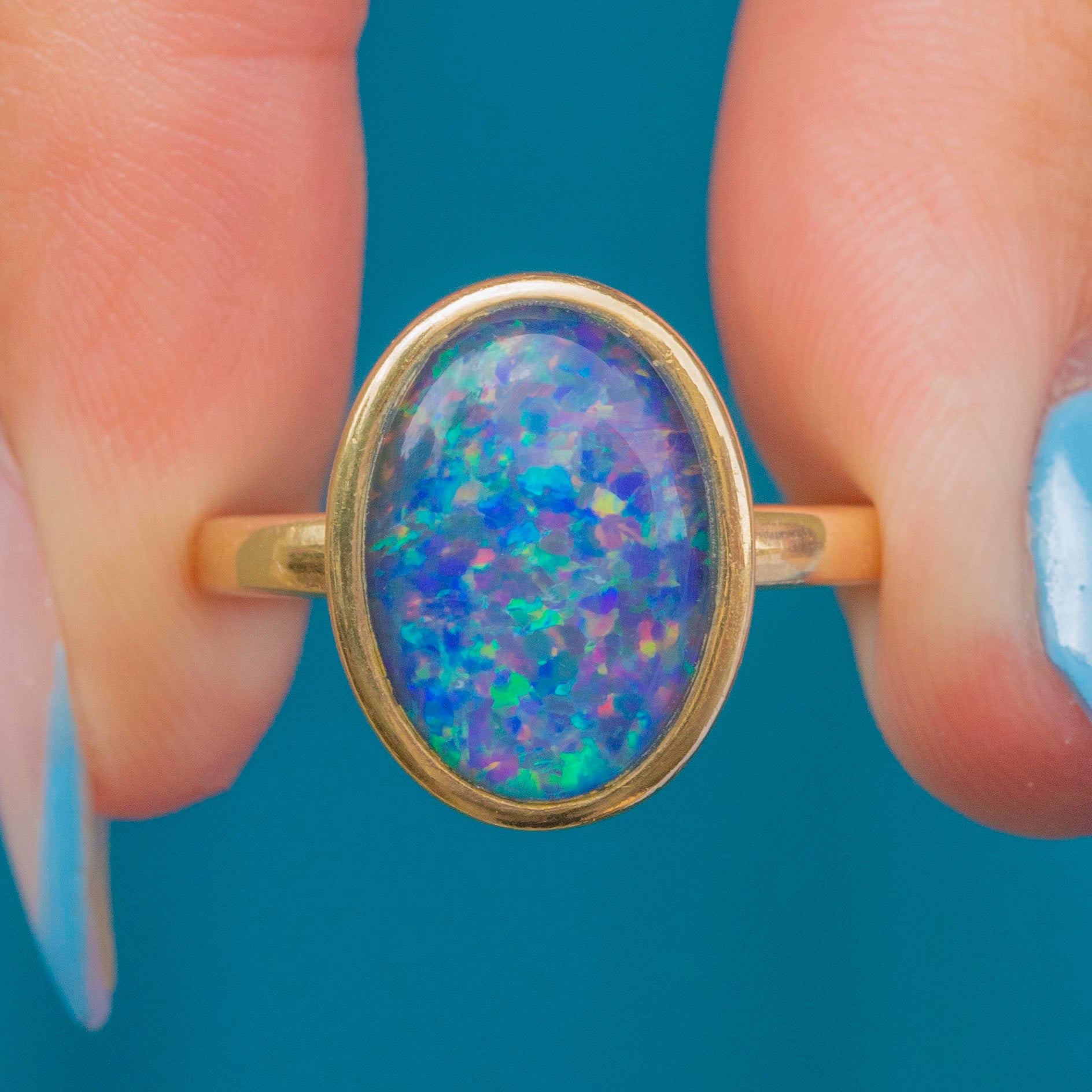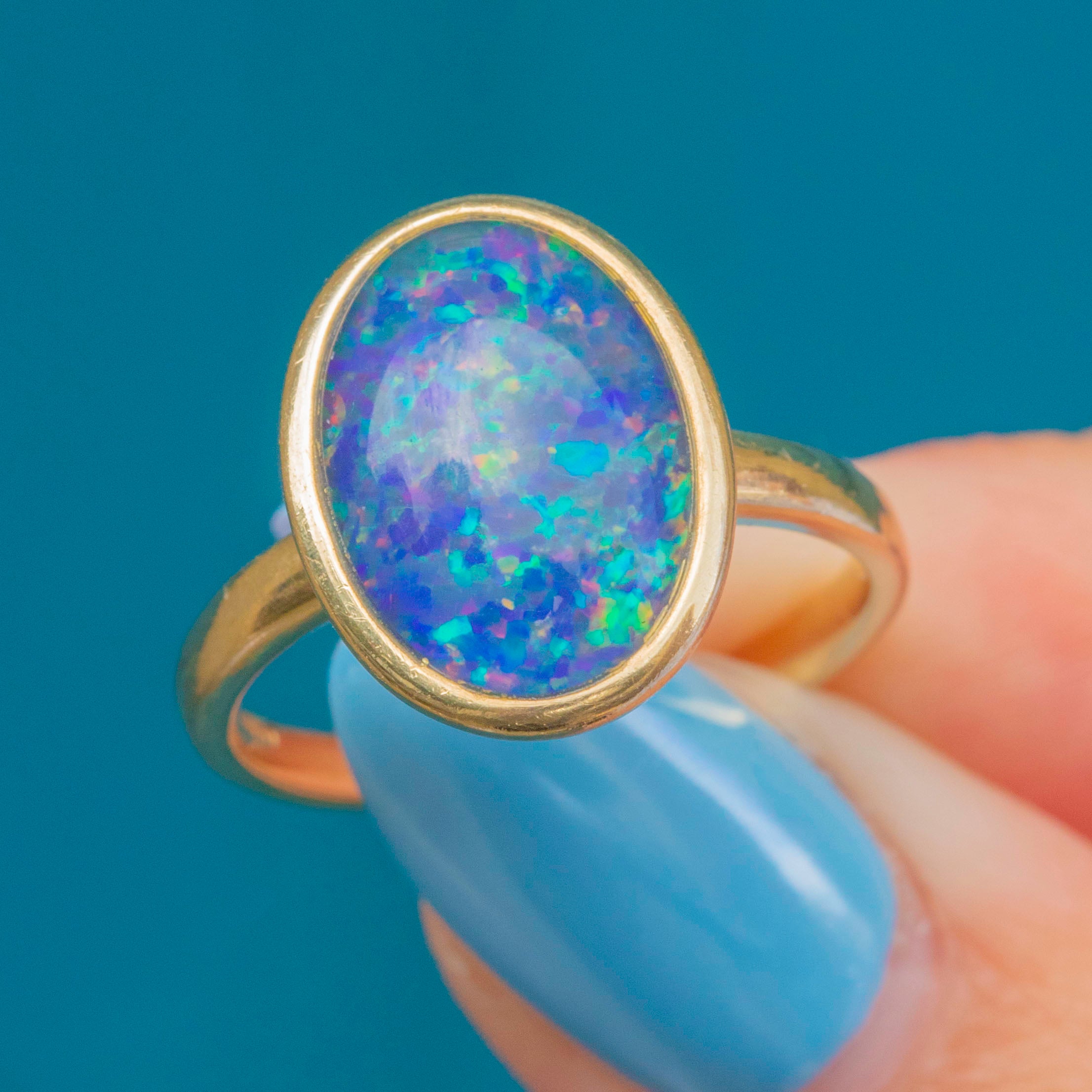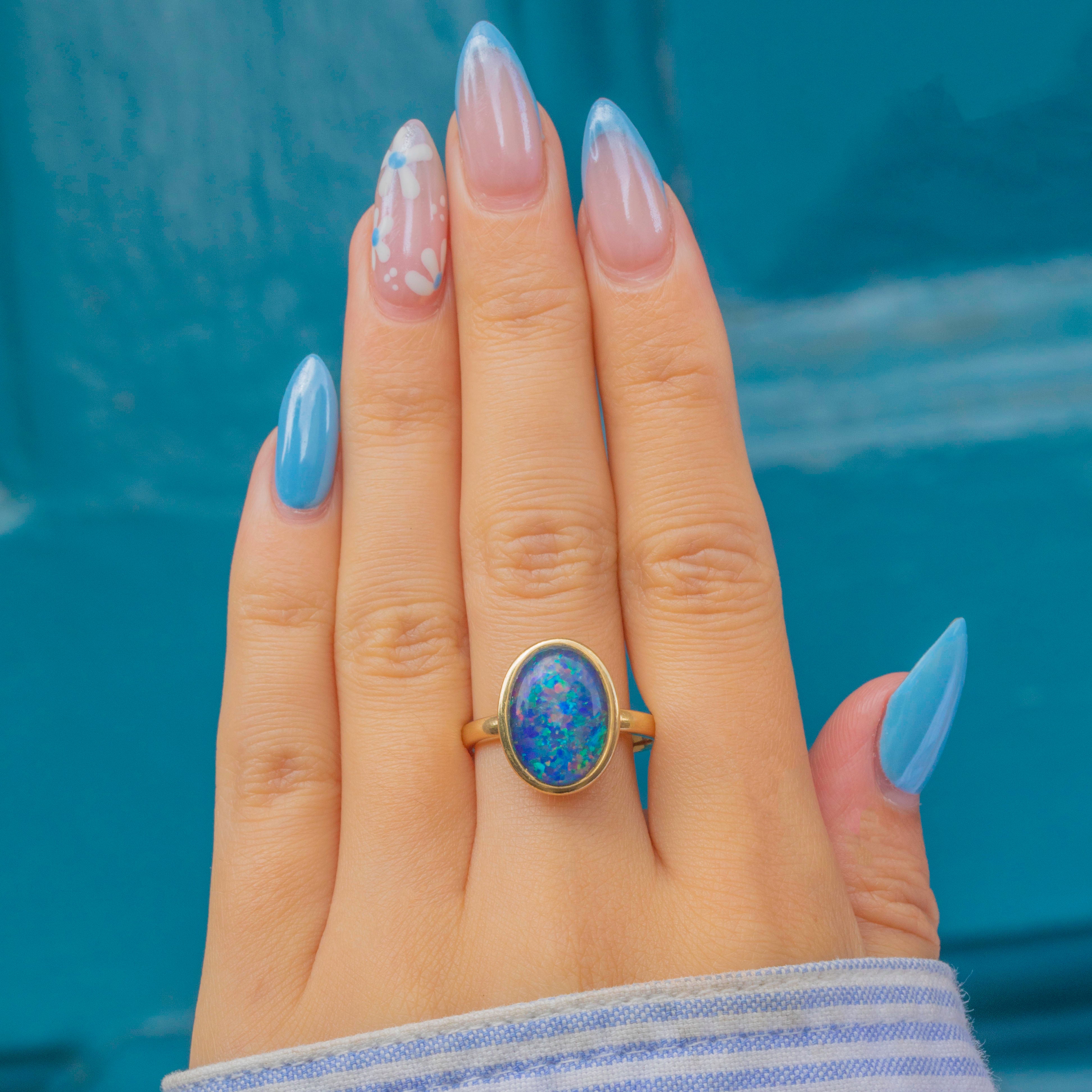 Providing exceptional finger coverage, this vintage ring flaunts a gorgeous Opal triplet radiating a kaleidoscope of blue, green and orange hues as it catches the light.