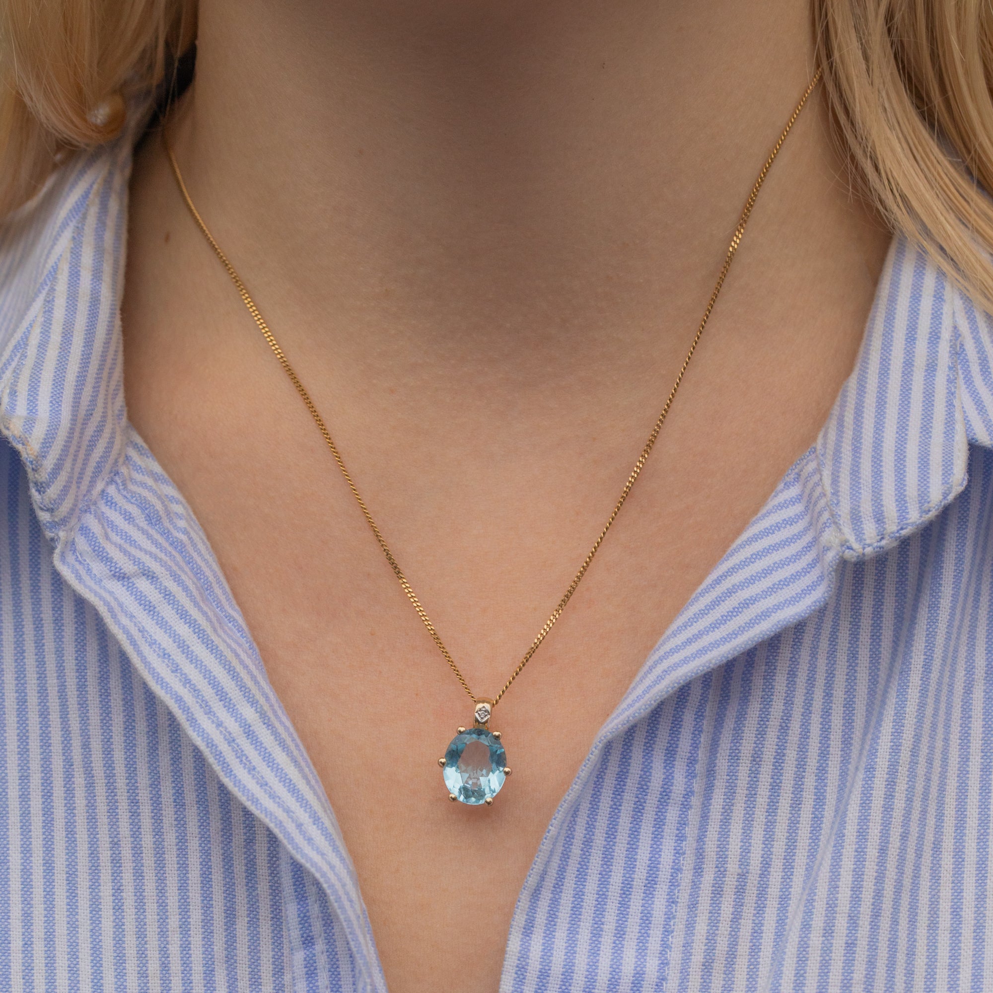 Add a pop of sky-blue serenity to your wardrobe with this 9ct Gold Oval Topaz Diamond charm! This Vintage pendant boasts a heavenly 2.35ct Topaz shimmering with ethereal light, evoking a feeling of tranquility and calmness.