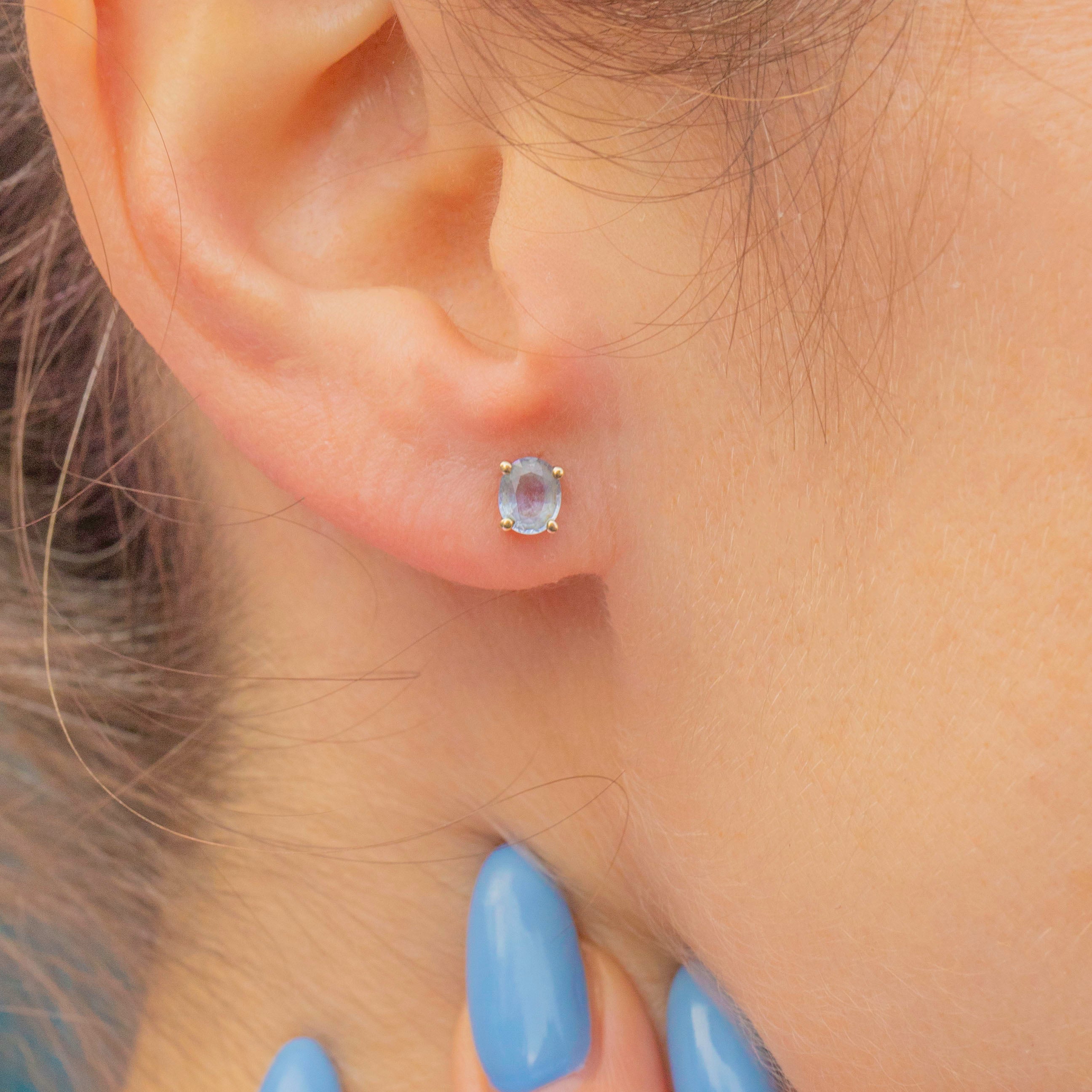 These 9ct Gold Pale Blue Sapphire stud earrings will make a lovely addition to your collection! Displaying oval-cut frosty cornflower blue Sapphires set in high-quality 9ct Gold, these vintage studs offer a delicate and timeless look. The elegant stones are securely held in a simple claw setting, showcasing their soft, serene colour.