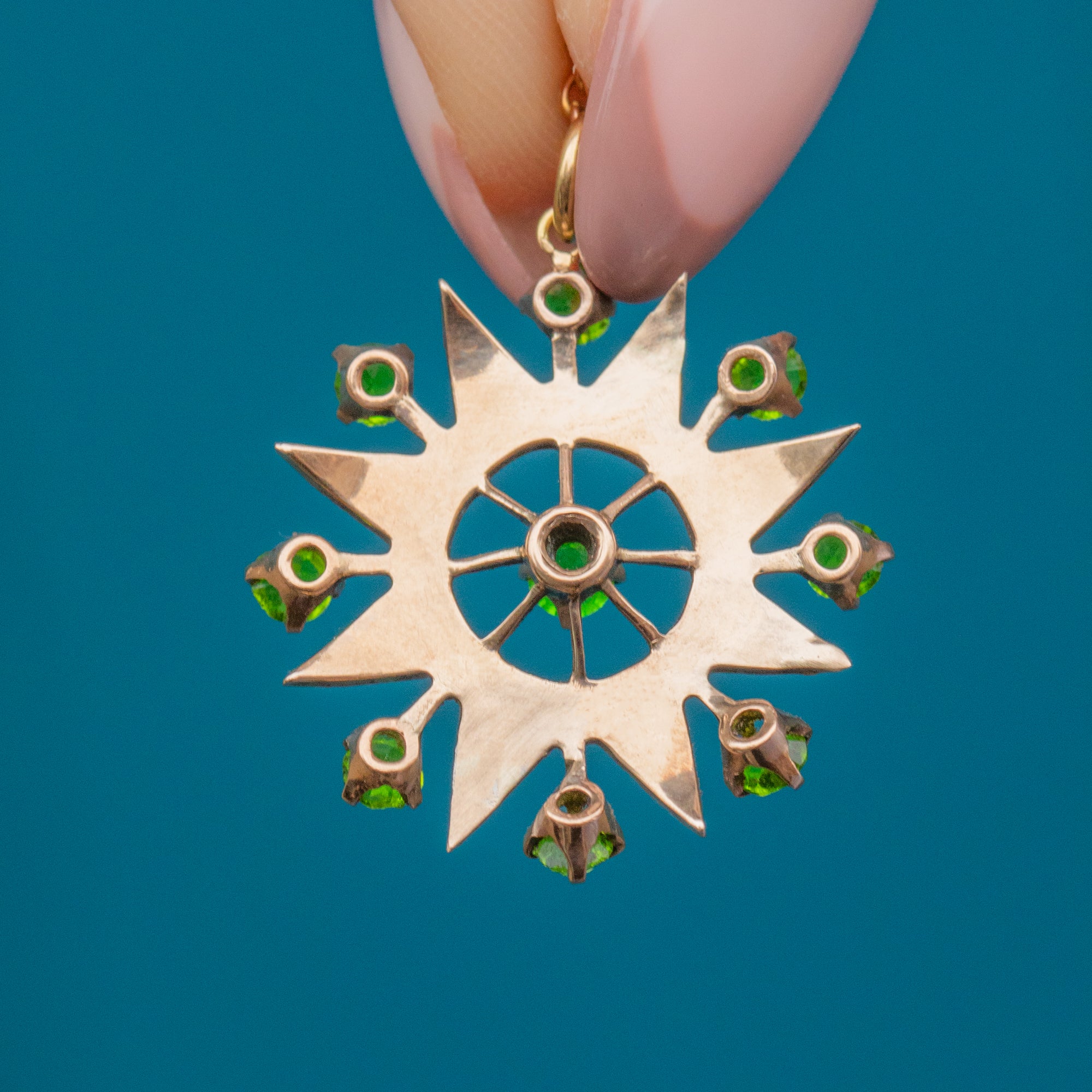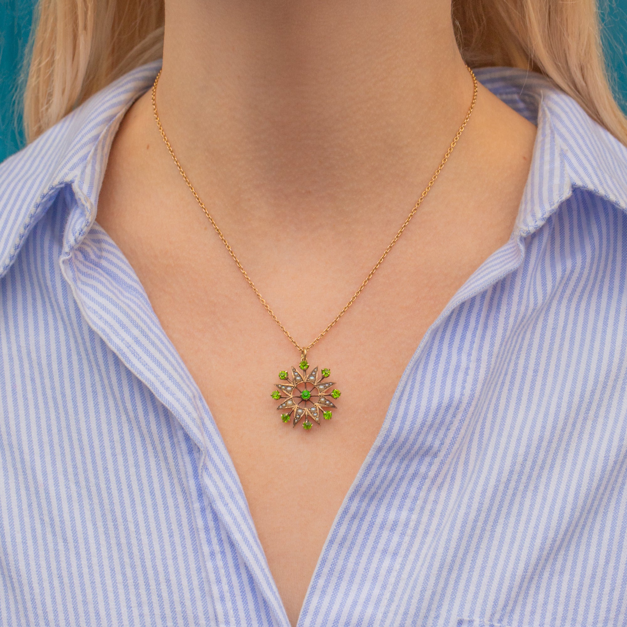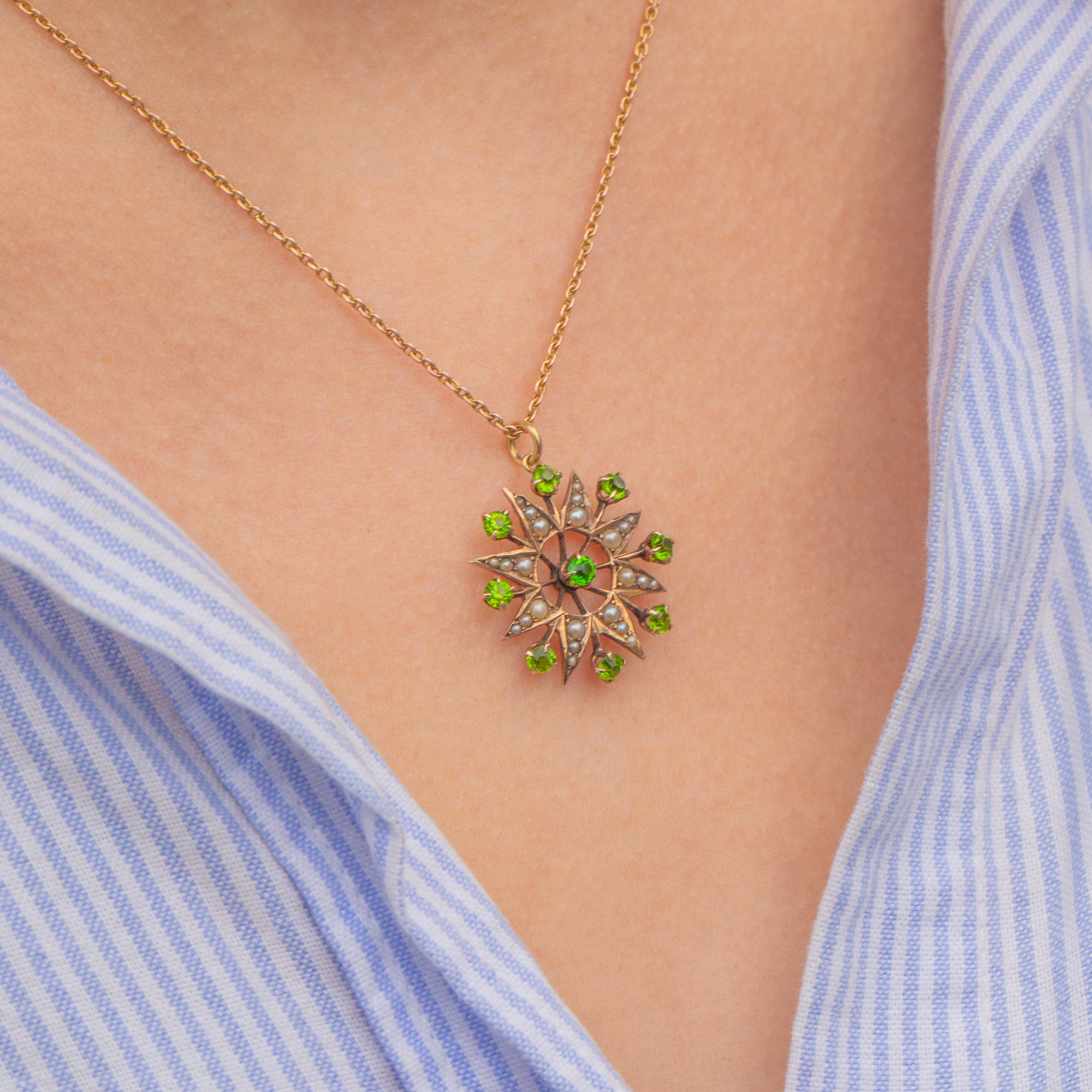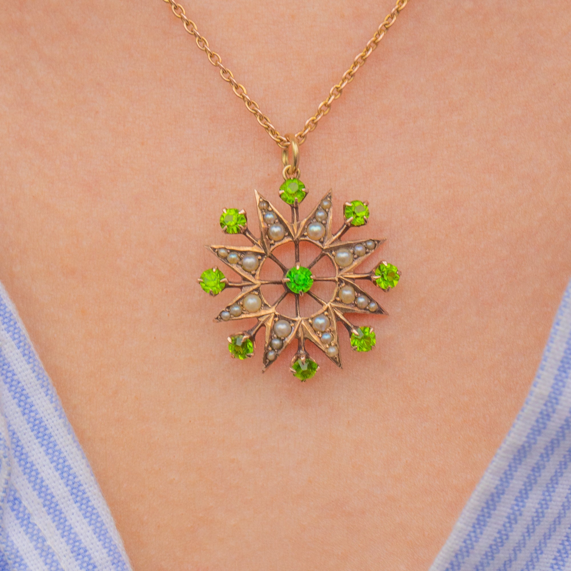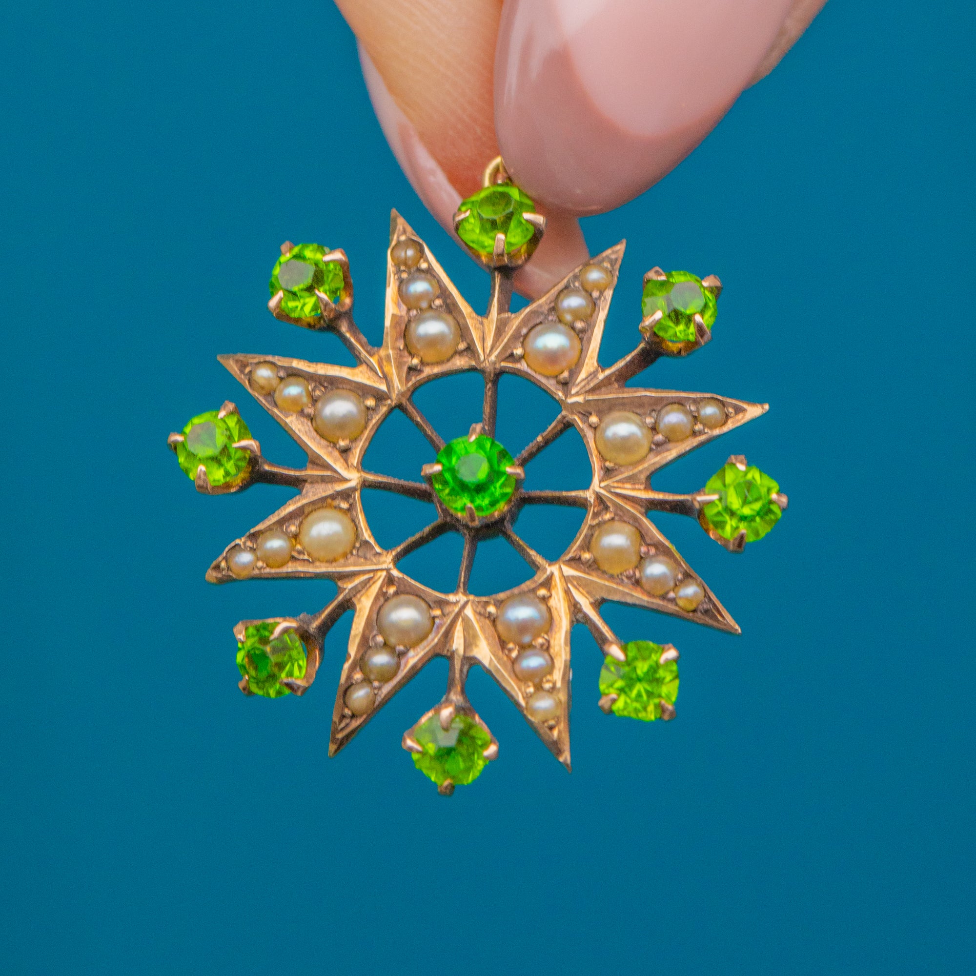 Featuring a gorgeous intricate star design, this Edwardian pendant is comprised of lustrous graduating natural Pearls, accented by vibrant green Paste stones. The pendant radiates timeless elegance, with each stone beautifully set to enhance the piece’s brilliance and accentuate the lustrous beauty of the Pearls and Paste.