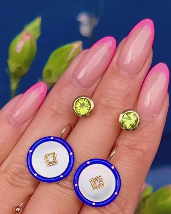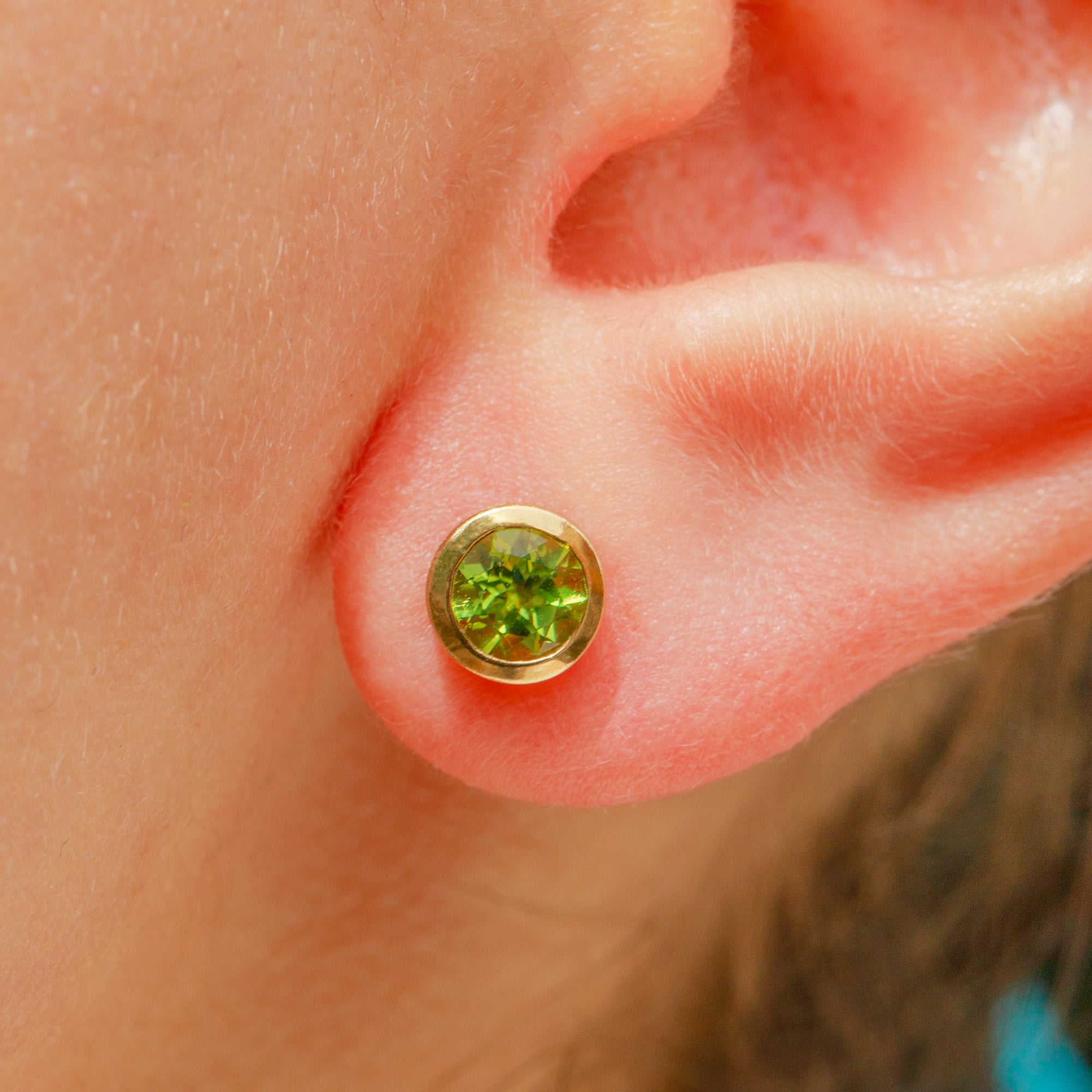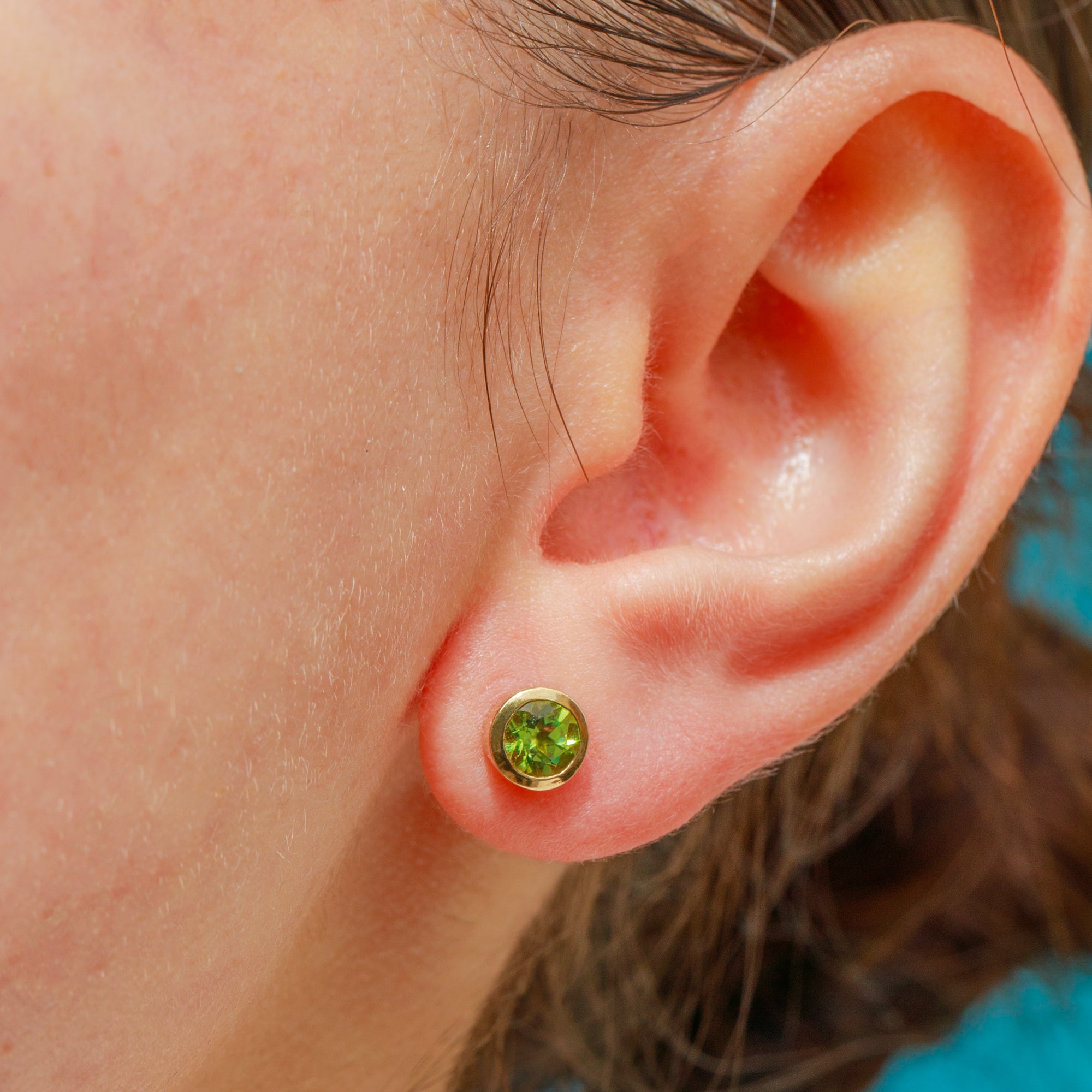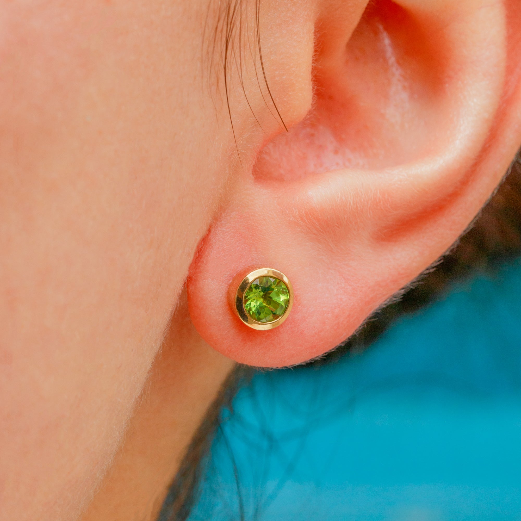 Each stud boasts a zingy lime green Peridot, bringing a pop of colour to any ear stack, and are wrapped up in a chunky Gold bezel setting adding a luxurious finishing touch!