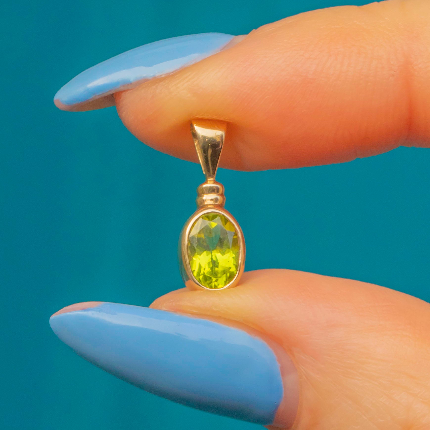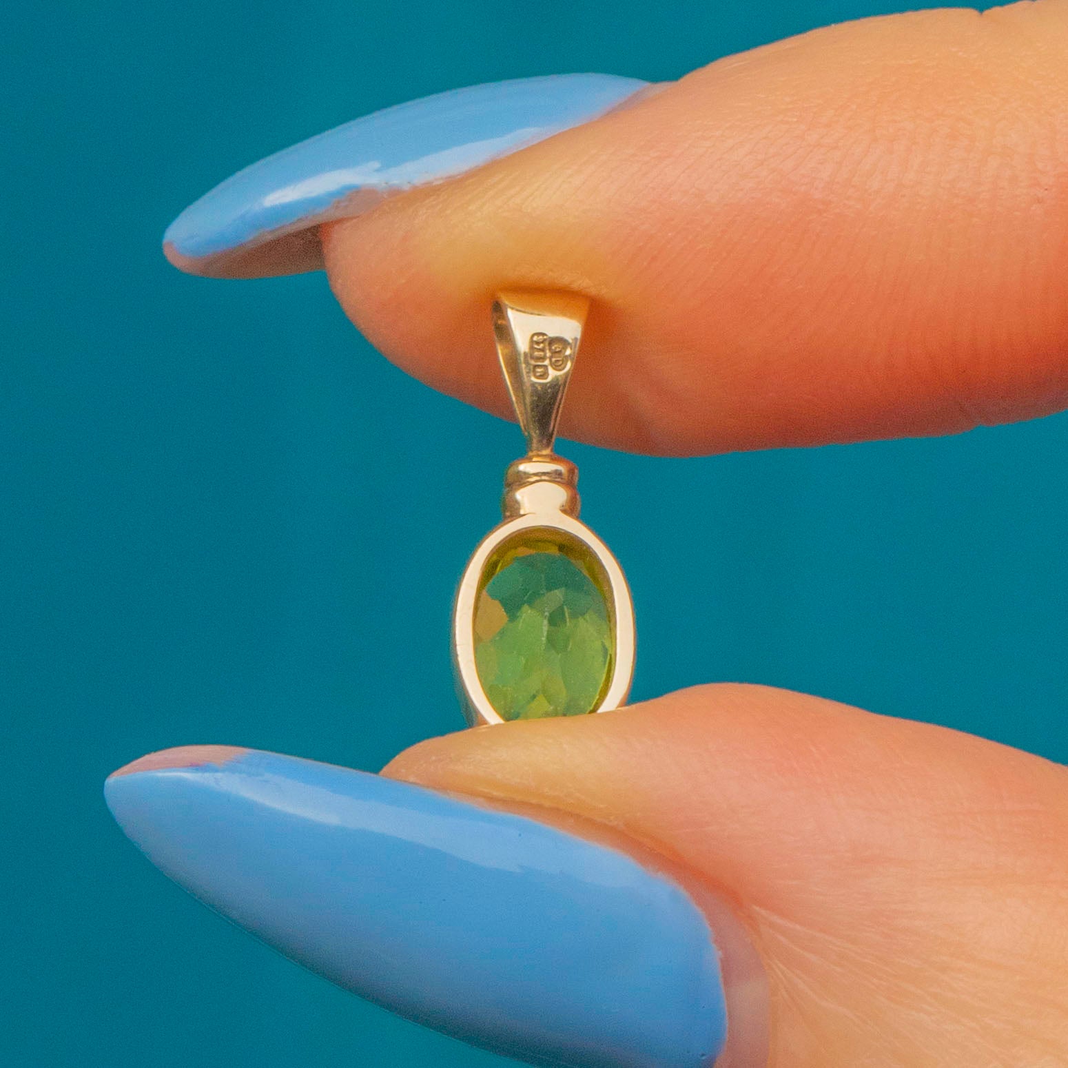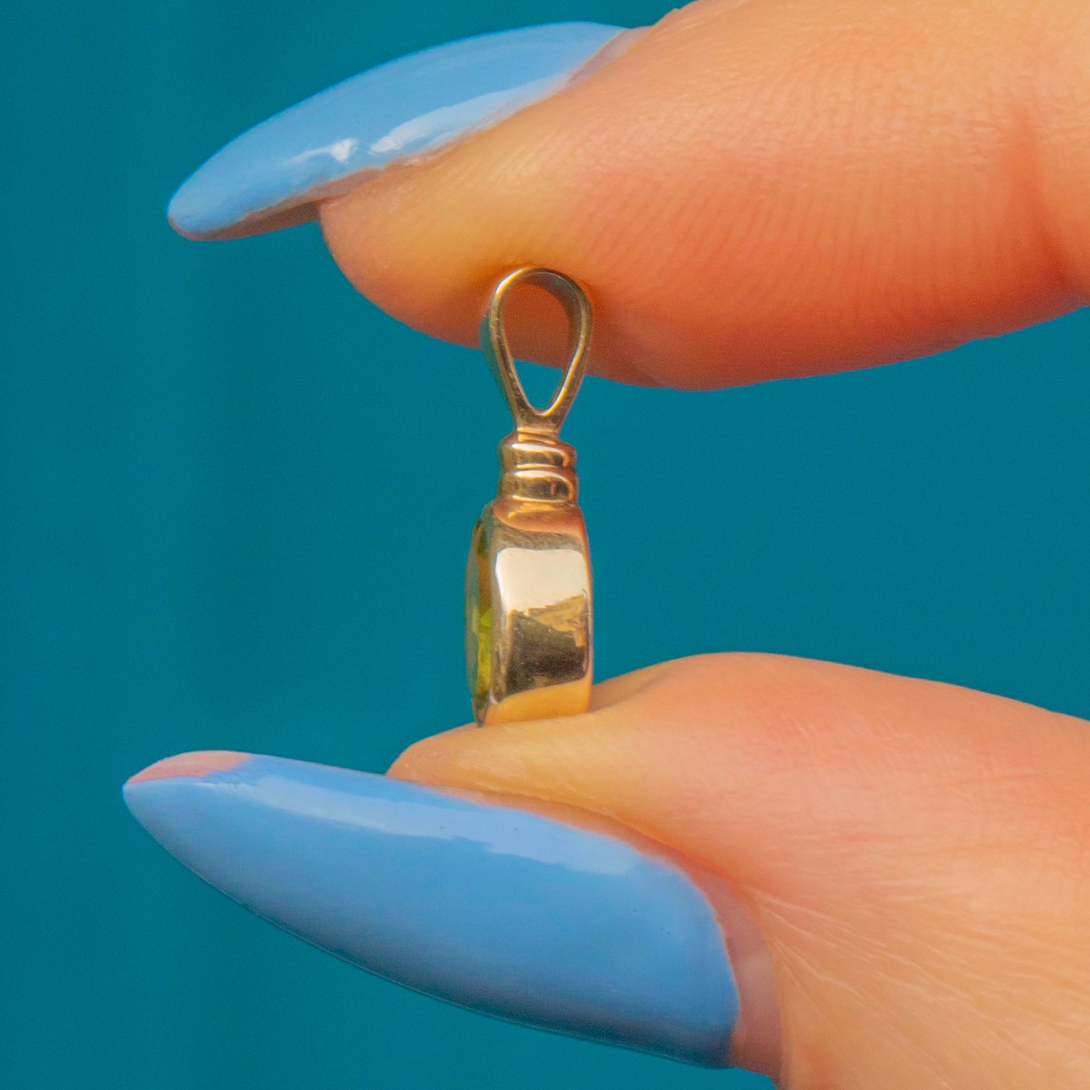 EXCELLENT. This 9ct Gold Peridot charm is offered in beautiful condition. The Peridot is a stunning colour, free from any signs of wear and securely held in its bezel. The generously sized bale will allow you to suspend this dainty jewel from a fine Gold chain with absolute confidence!