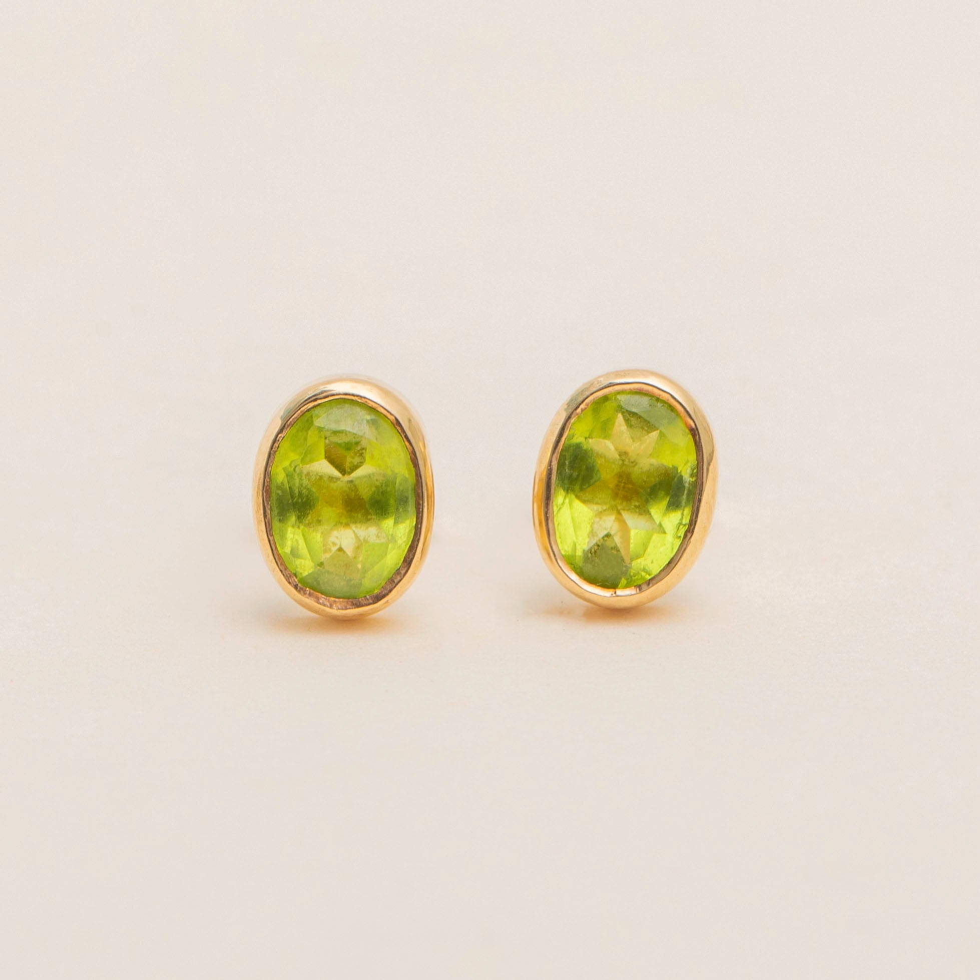 VERY GOOD-EXCELLENT. These 9ct Gold Peridot stud earrings are in great condition! The Peridots are simply delightful, with only minor scuffs noticeable under close scrutiny. The Gold is saturated throughout and the bezels hold each Peridot securely in place. With secure butterfly backs, these versatile vintage Peridot earrings are set to become your new favourite pair!