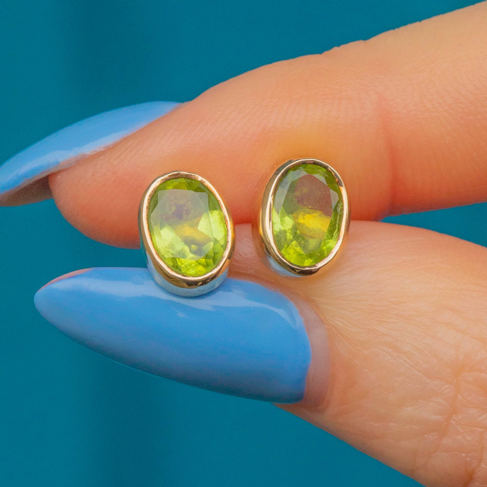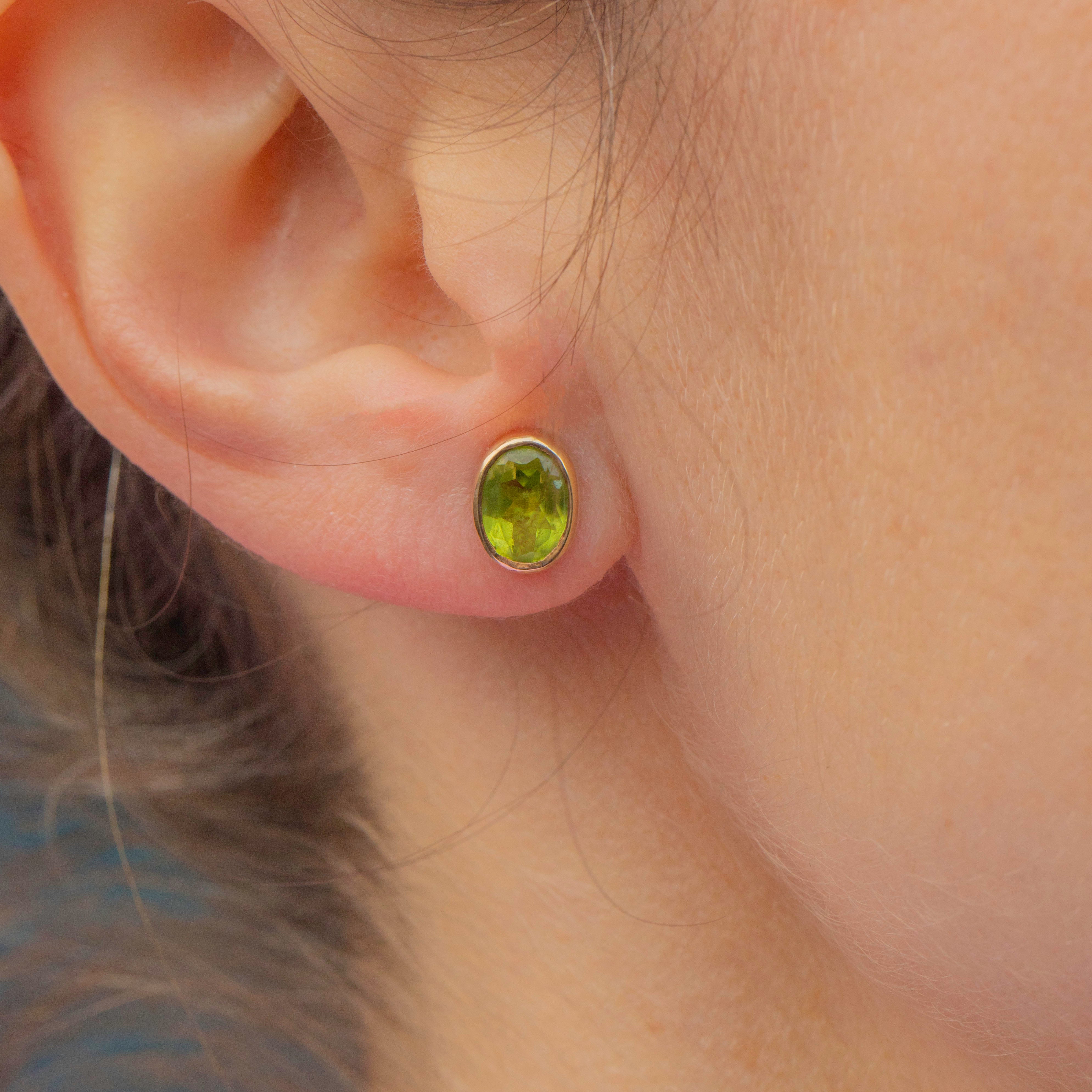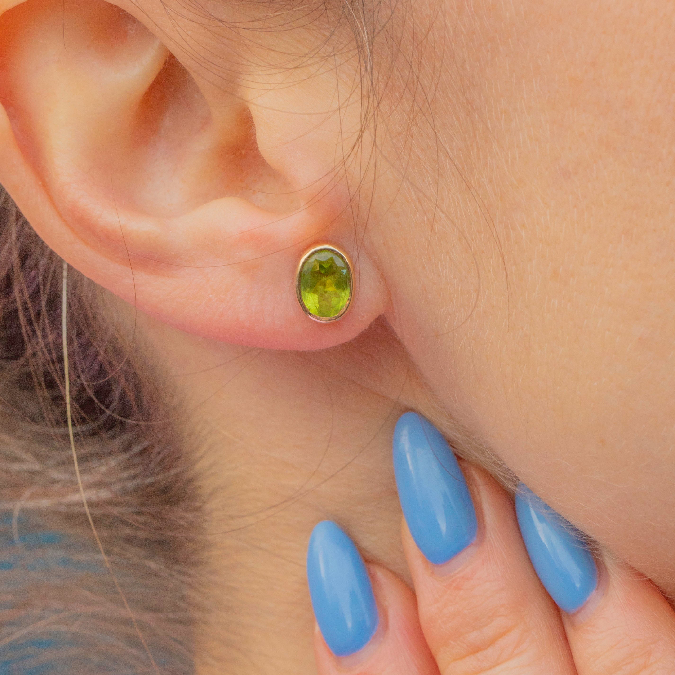 Peridots are 7.5mm long x 5.5mm wide, weighing approx. 1.55ct combined.