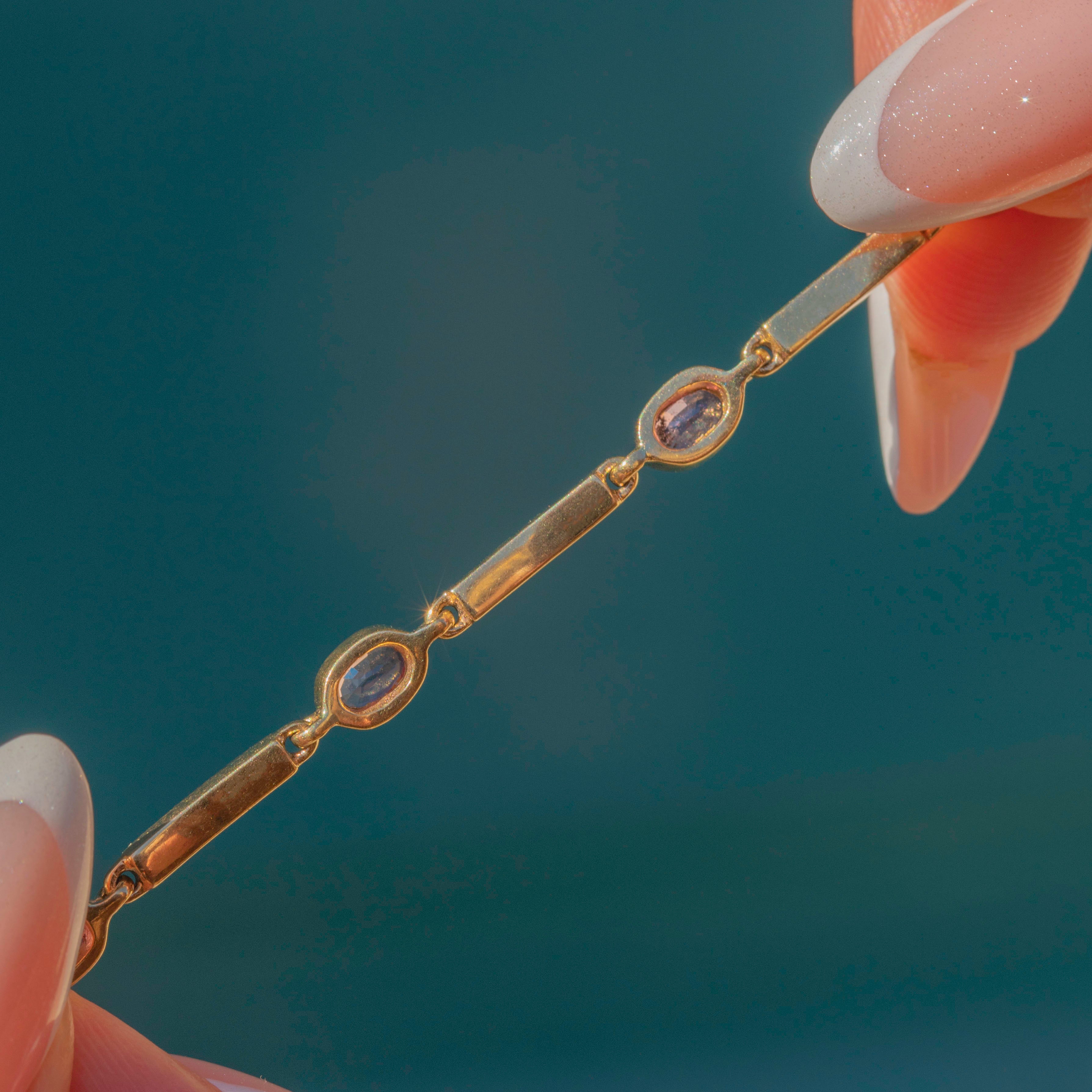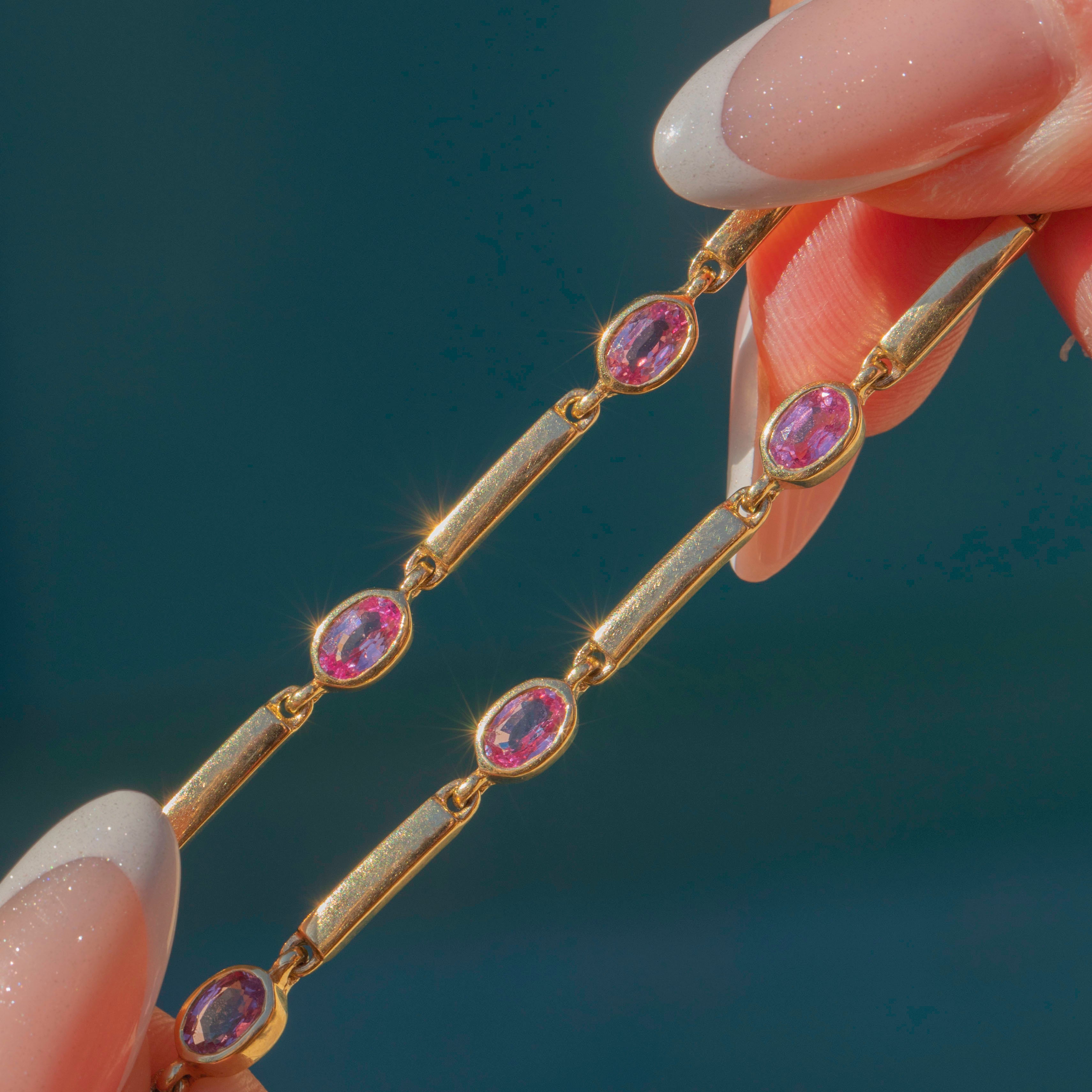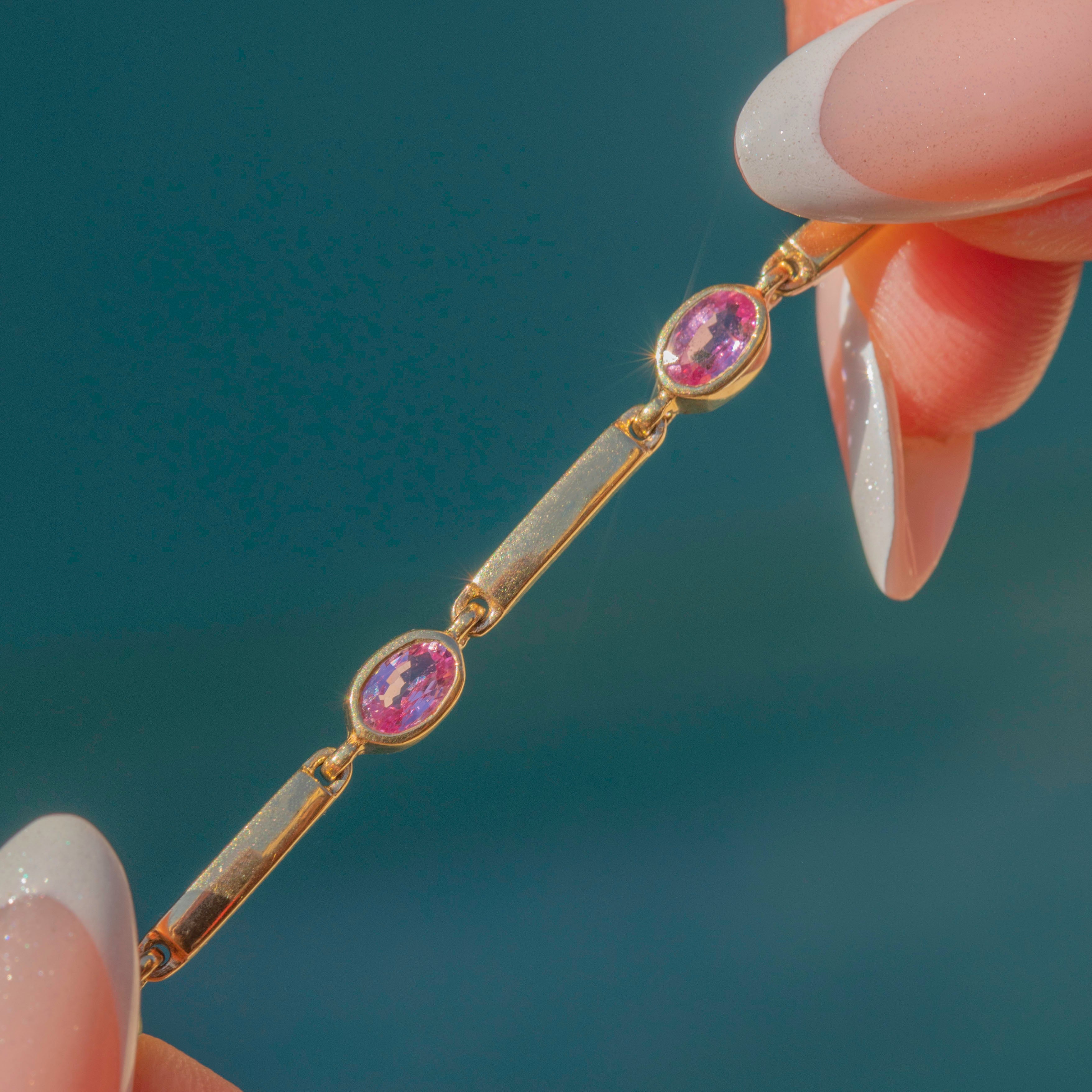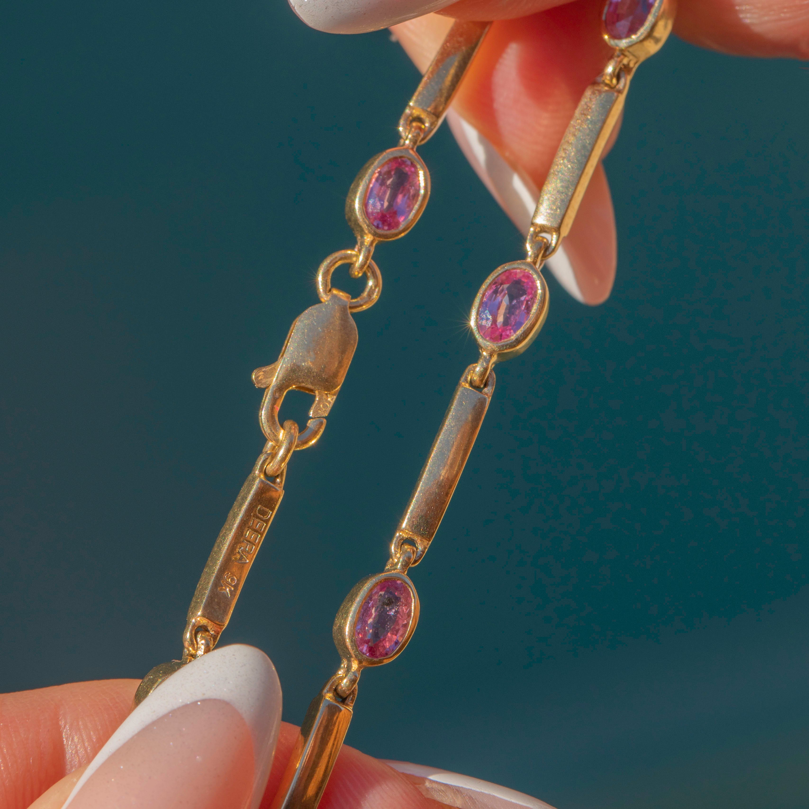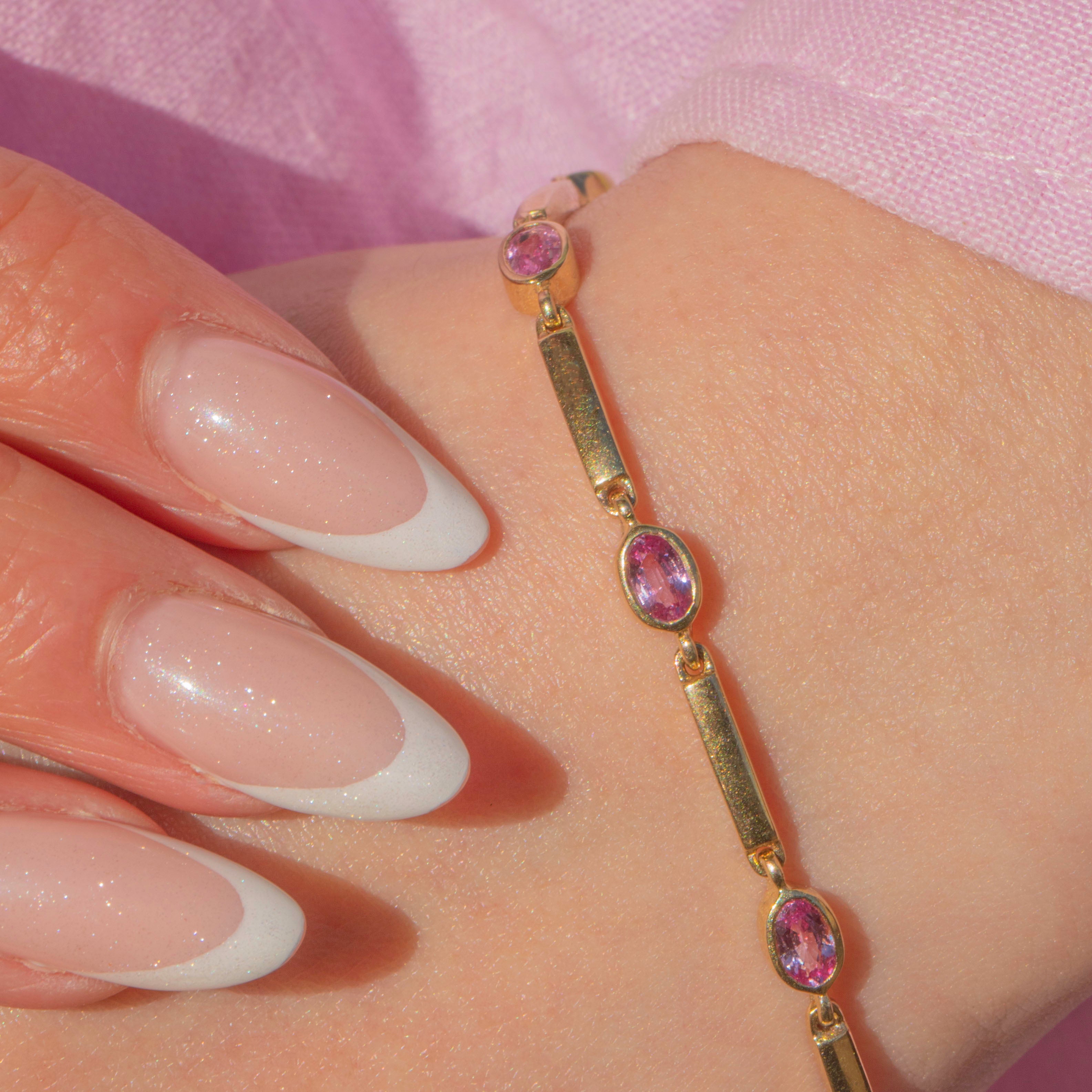 EXCELLENT. This 9ct Gold Pink Sapphire bracelet is in excellent condition. The links are all well connected, allowing you to wear the piece confidently. The gemstones are all secure in their bezels with no signs of surface wear, and the lobster clasp allows for secure closure.