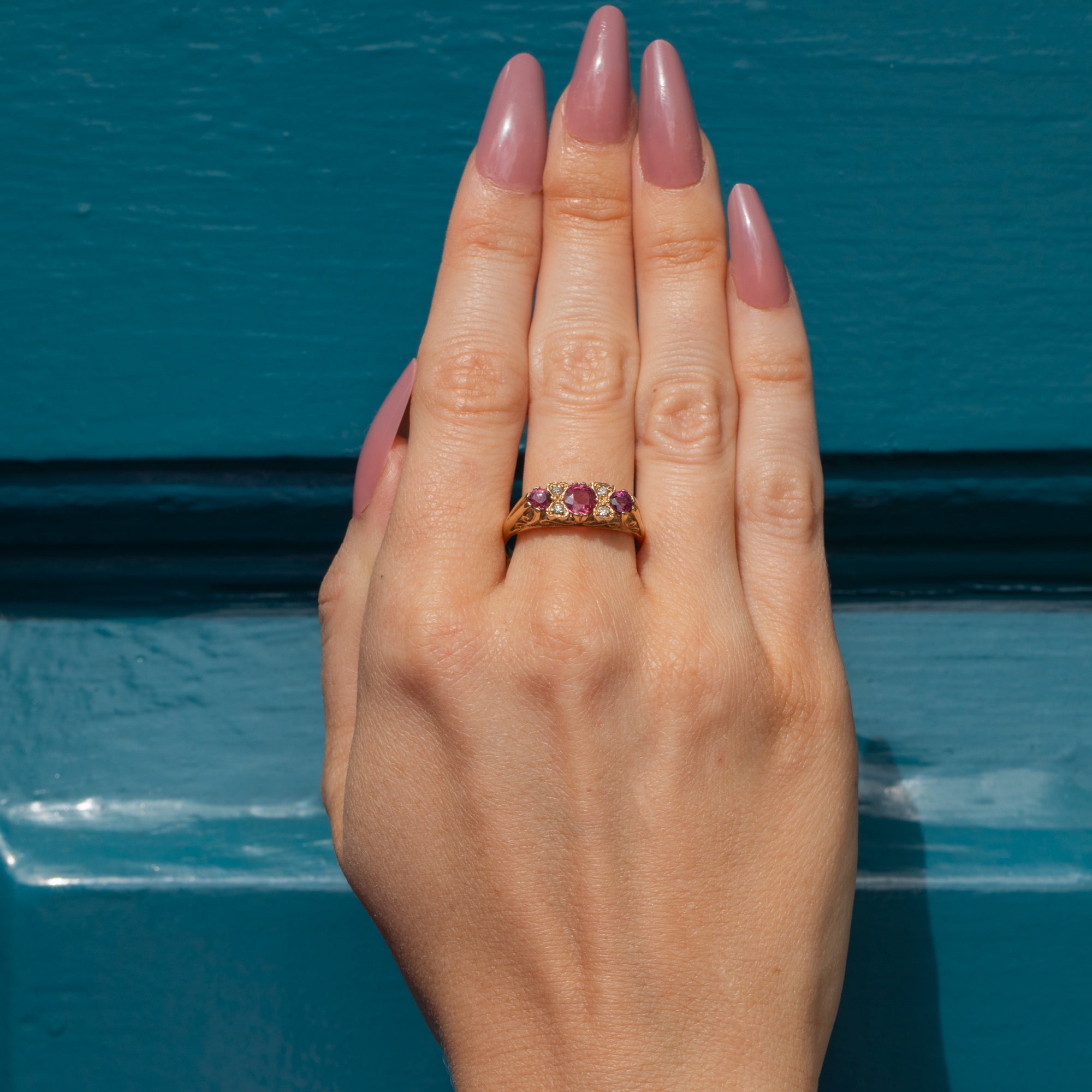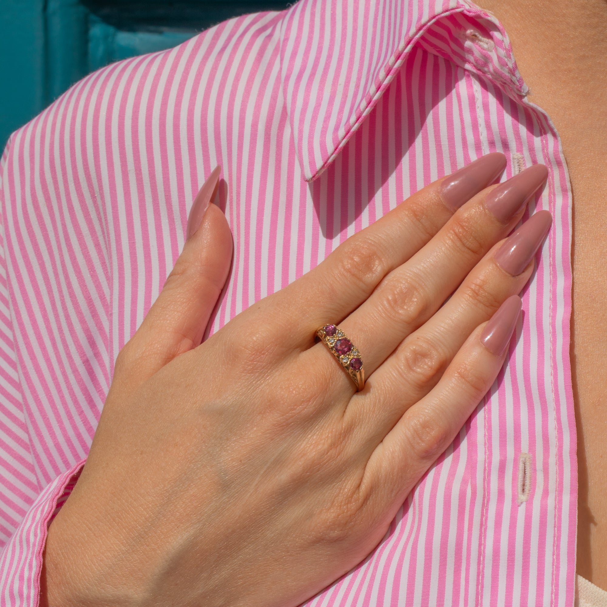 This 9ct Gold pink Sapphire Diamond boat ring is fit for the jewellery box of a princess! Her delicate boat form is topped with hot pink Sapphires flanked by four twinkling Diamonds creating a splendorous display as they catch the light.