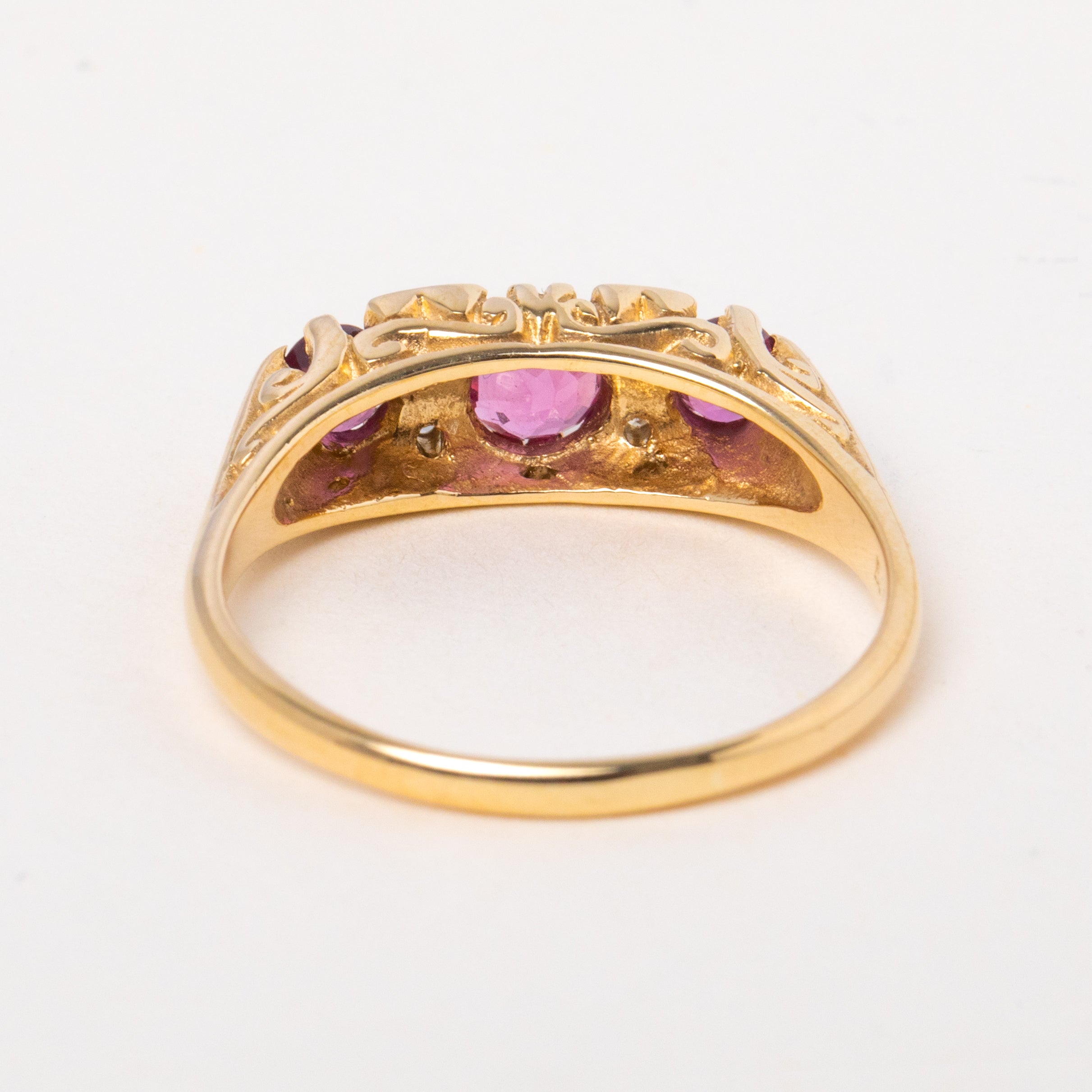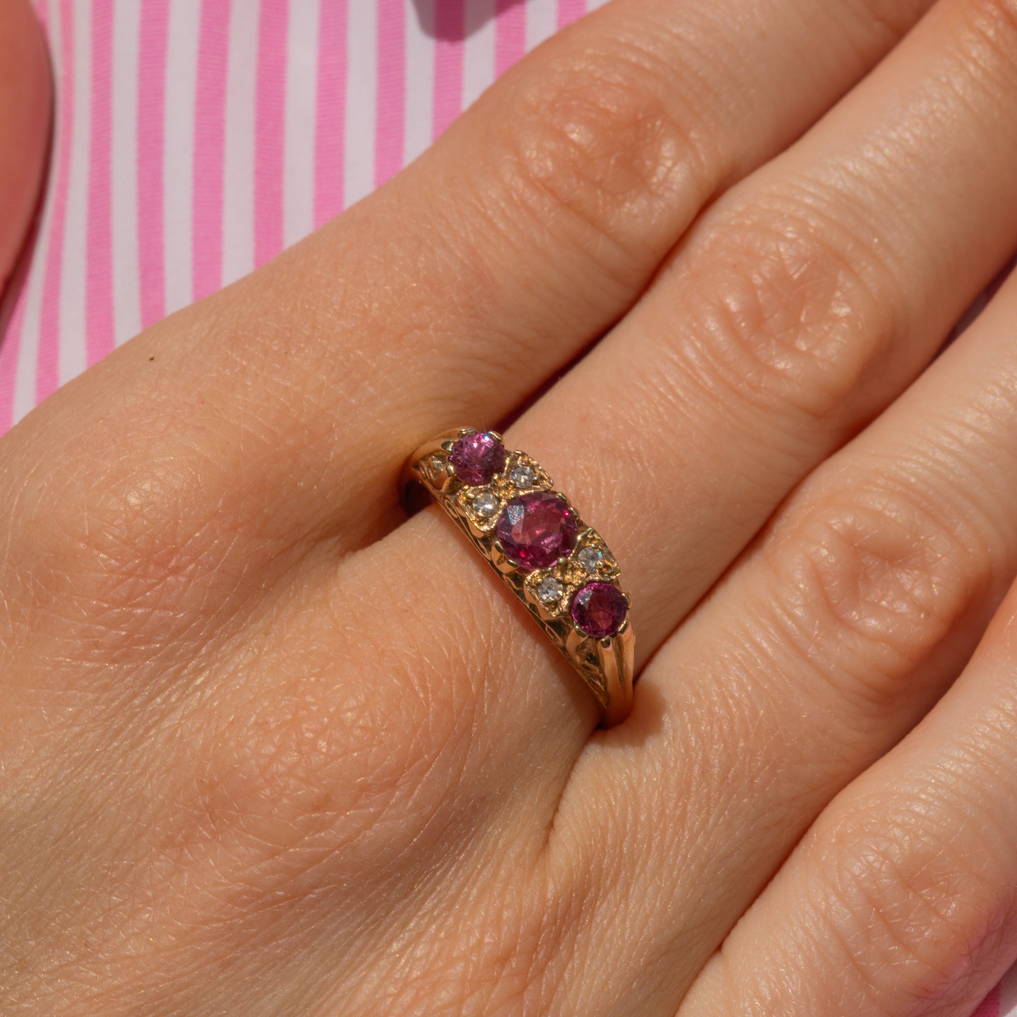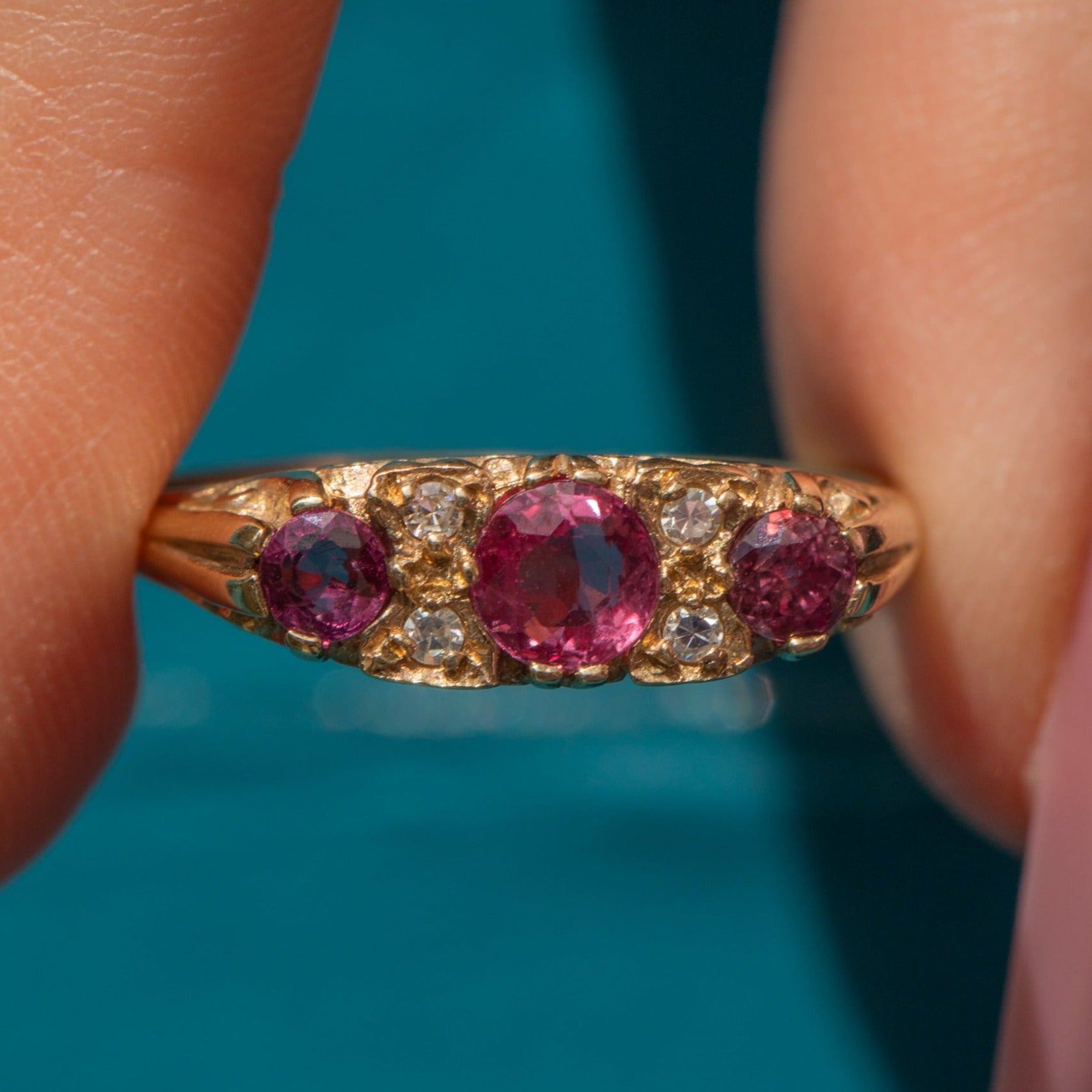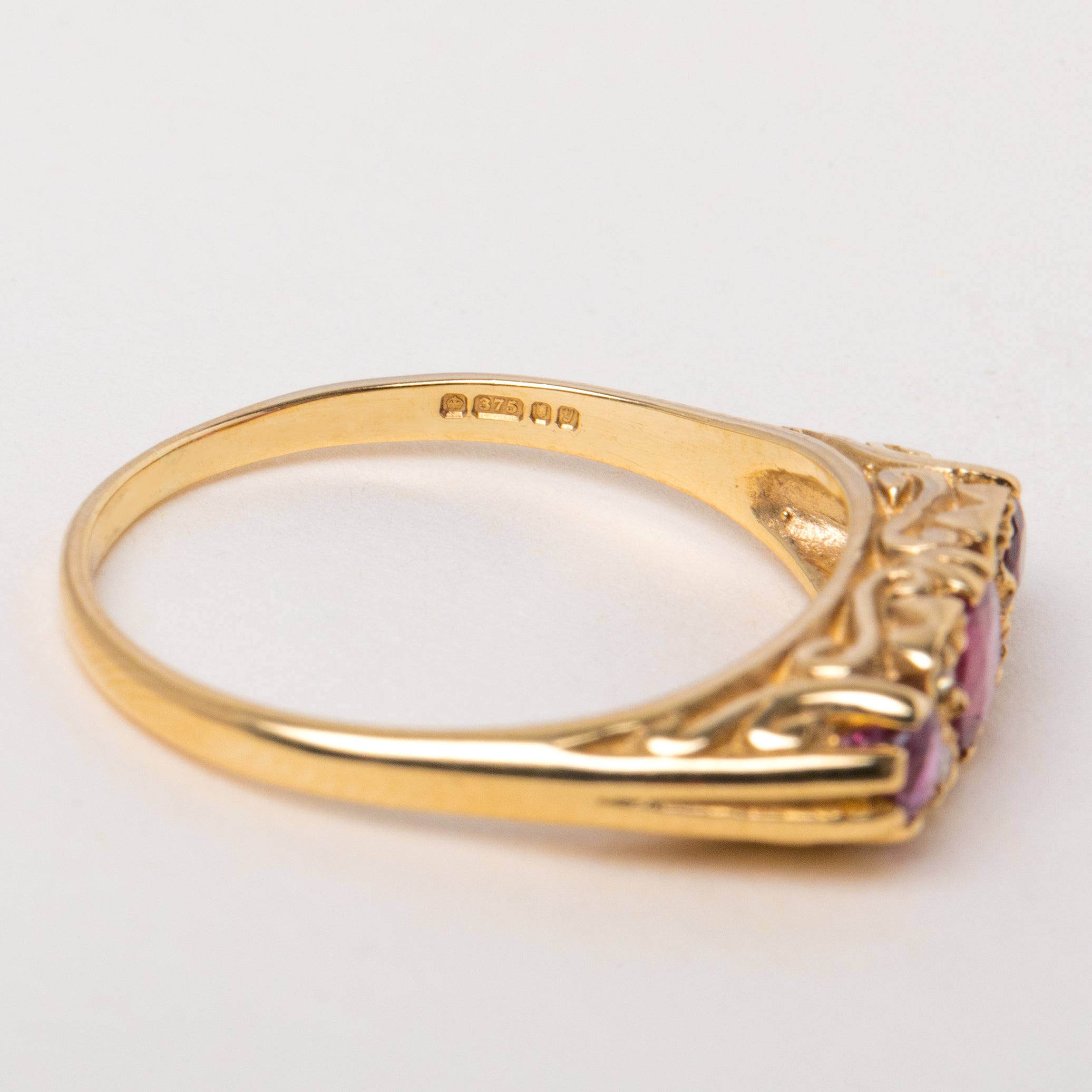 MATERIALS: Tests as 9ct Gold throughout, Pink Sapphires (0.65ct), Diamonds (0.12ct).