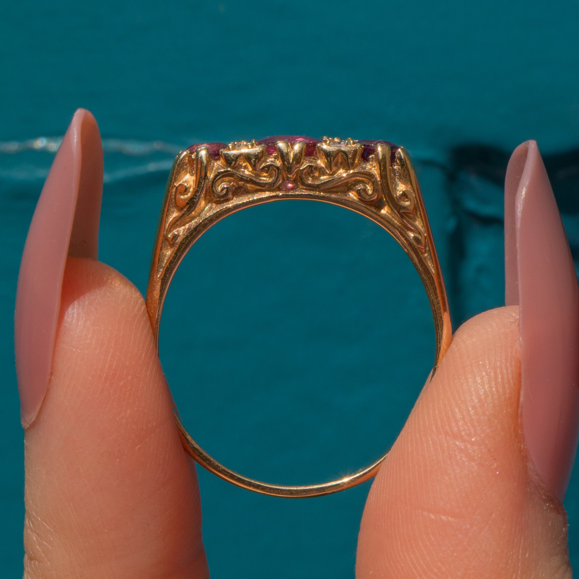 Ornate Gold work runs along the gallery of this Vintage Sapphire ring, emanating elegance from every angle. The slender design makes her easily stackable but also has a bold beauty that shines alone.