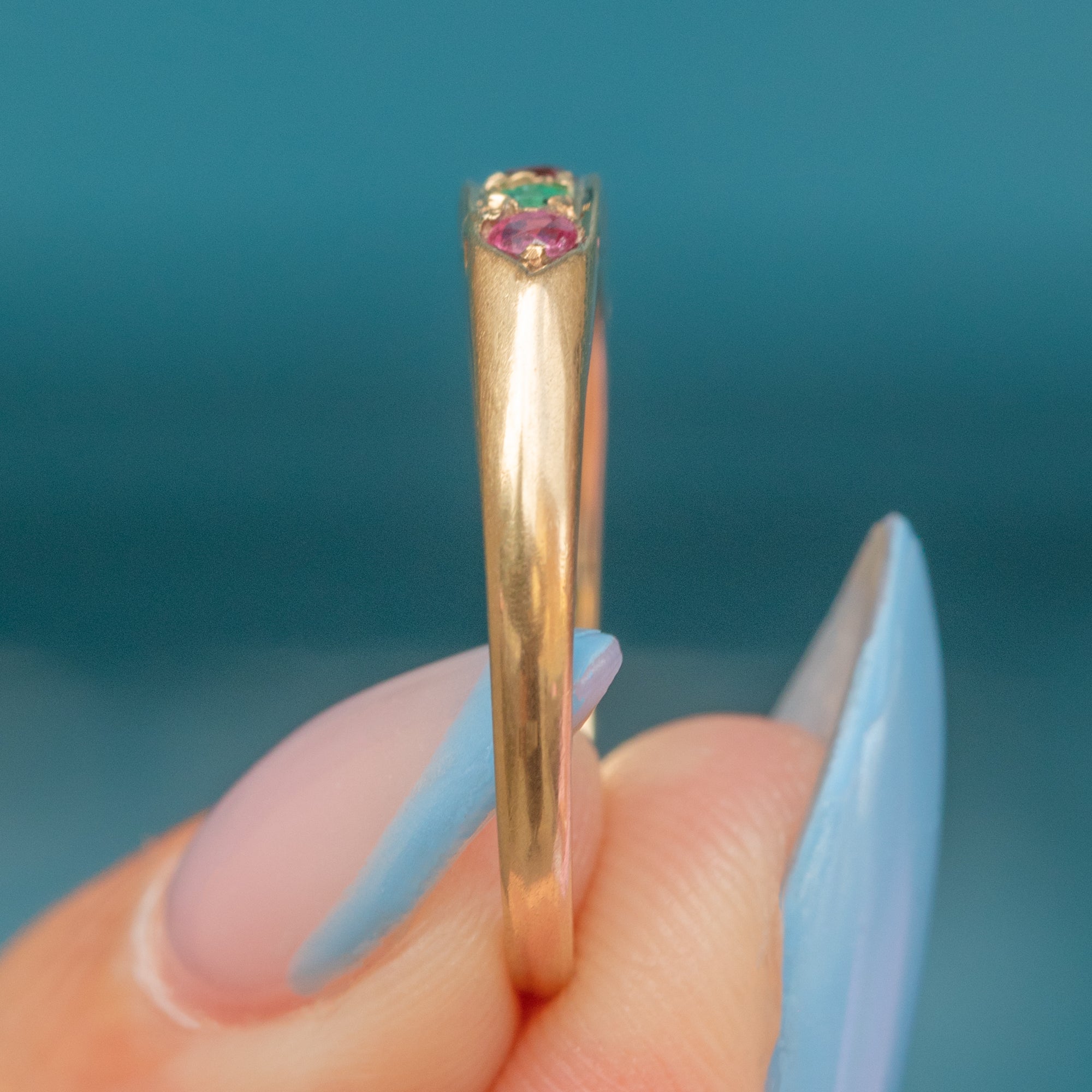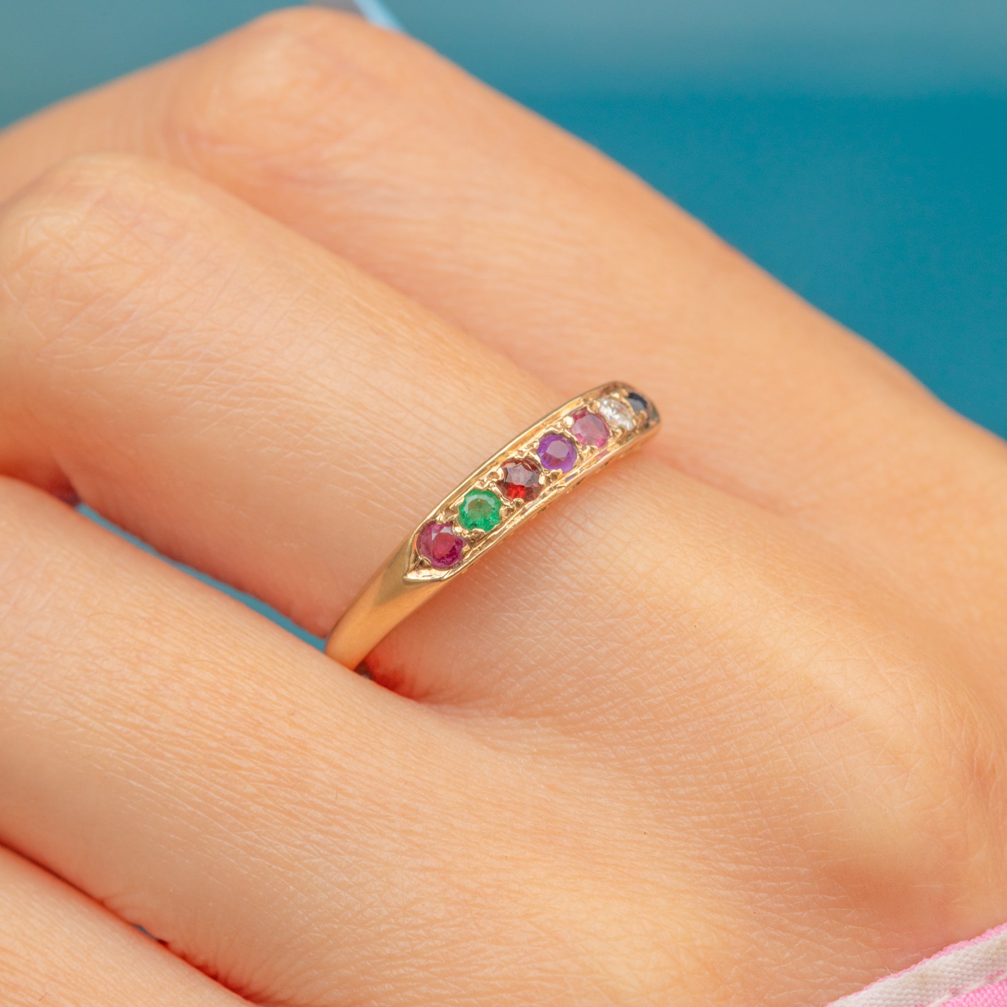 This refined vintage acrostic ring features seven scintillating multi-tonal gemstones, displayed proudly in luxurious 9ct Gold.