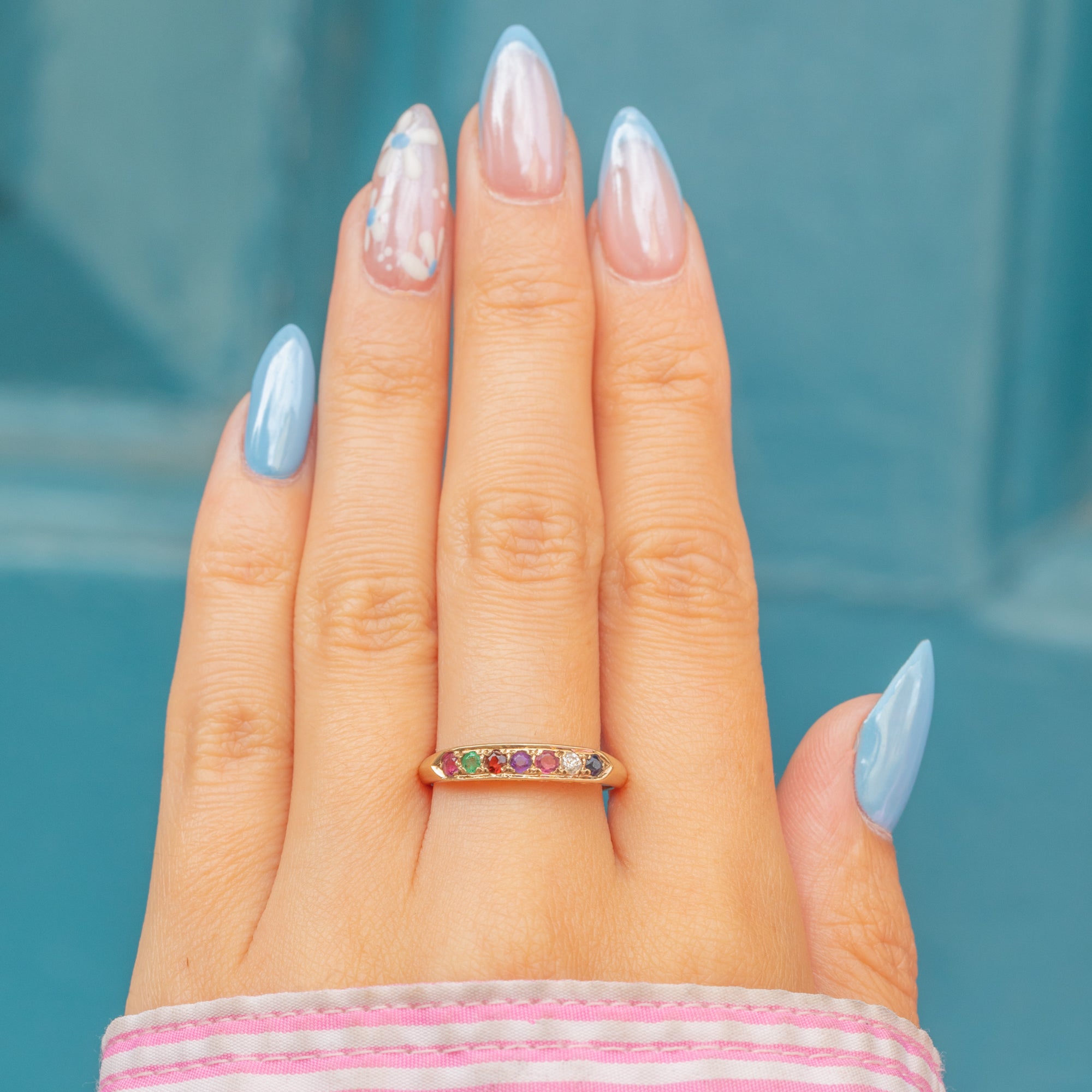 The use of carefully arranged gemstones (Ruby, Emerald, Garnet, Amethyst, Ruby, Diamond, Blue Sapphire) spells out the word 'regards' across this Victorian-style ring, making it a wonderfully sentimental piece.