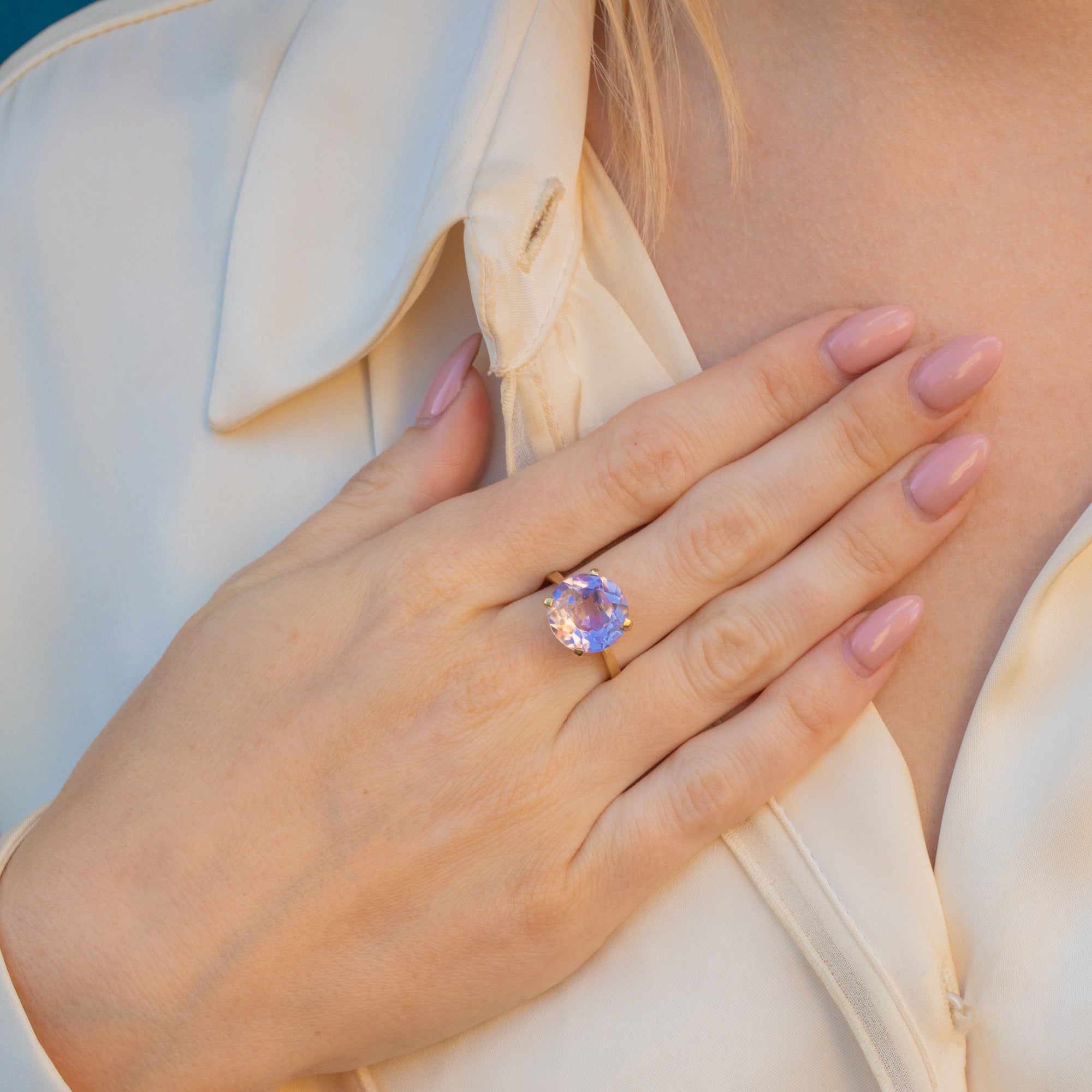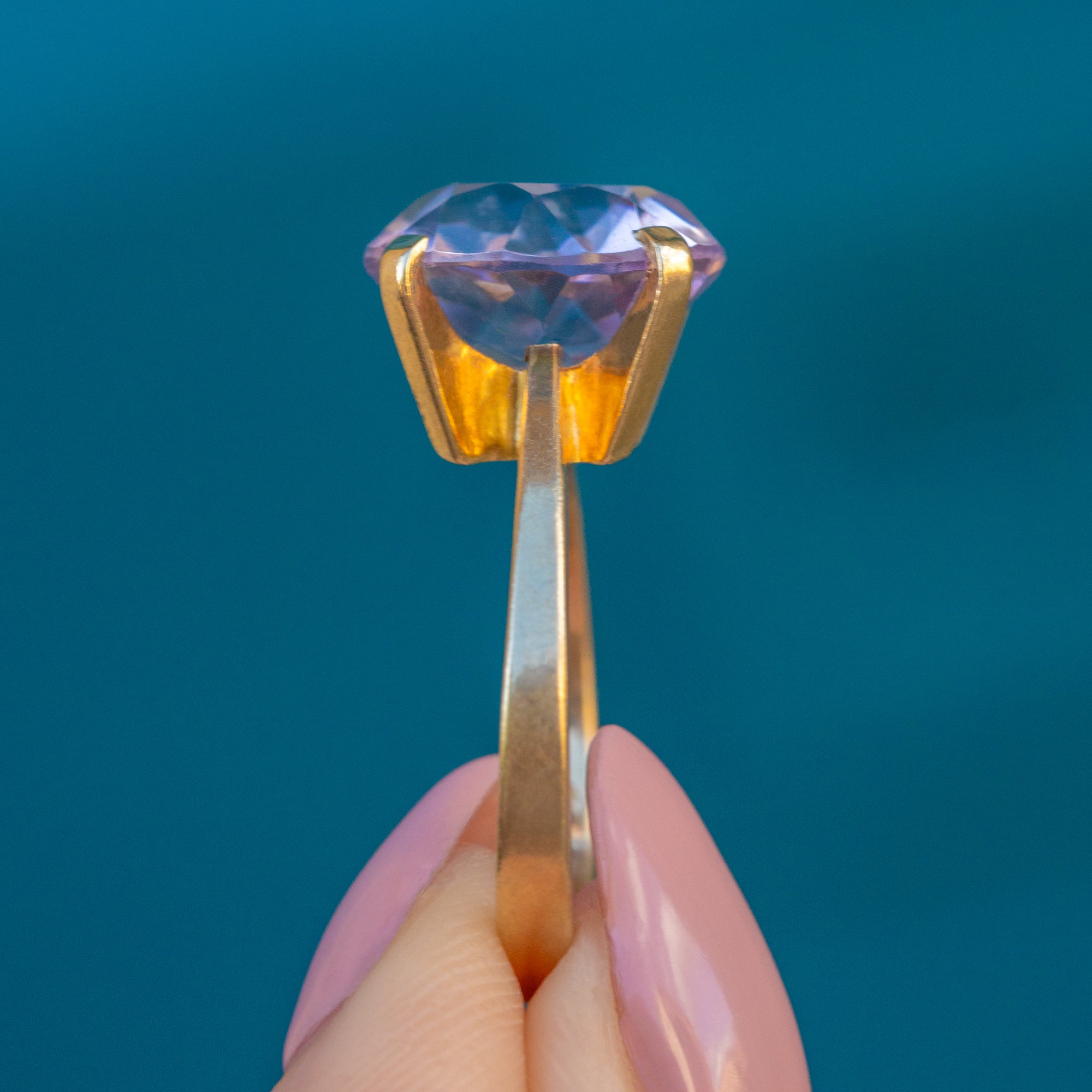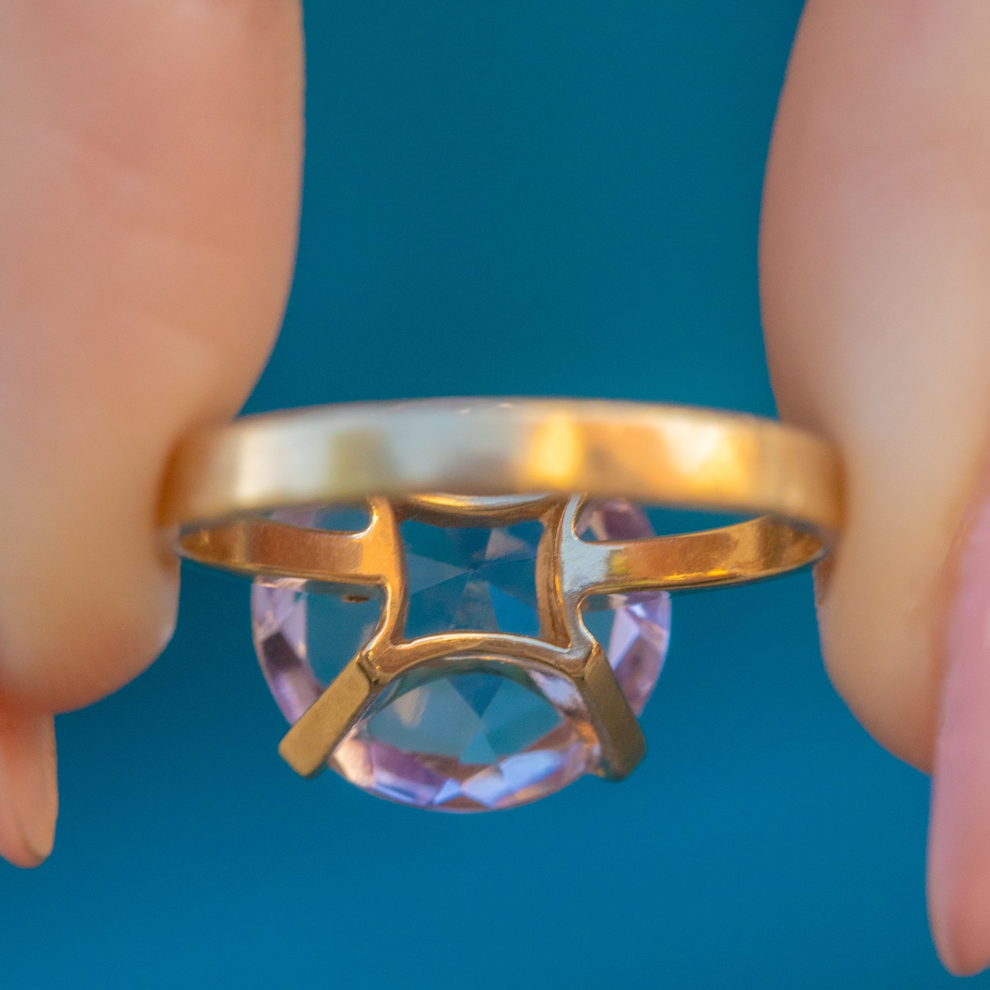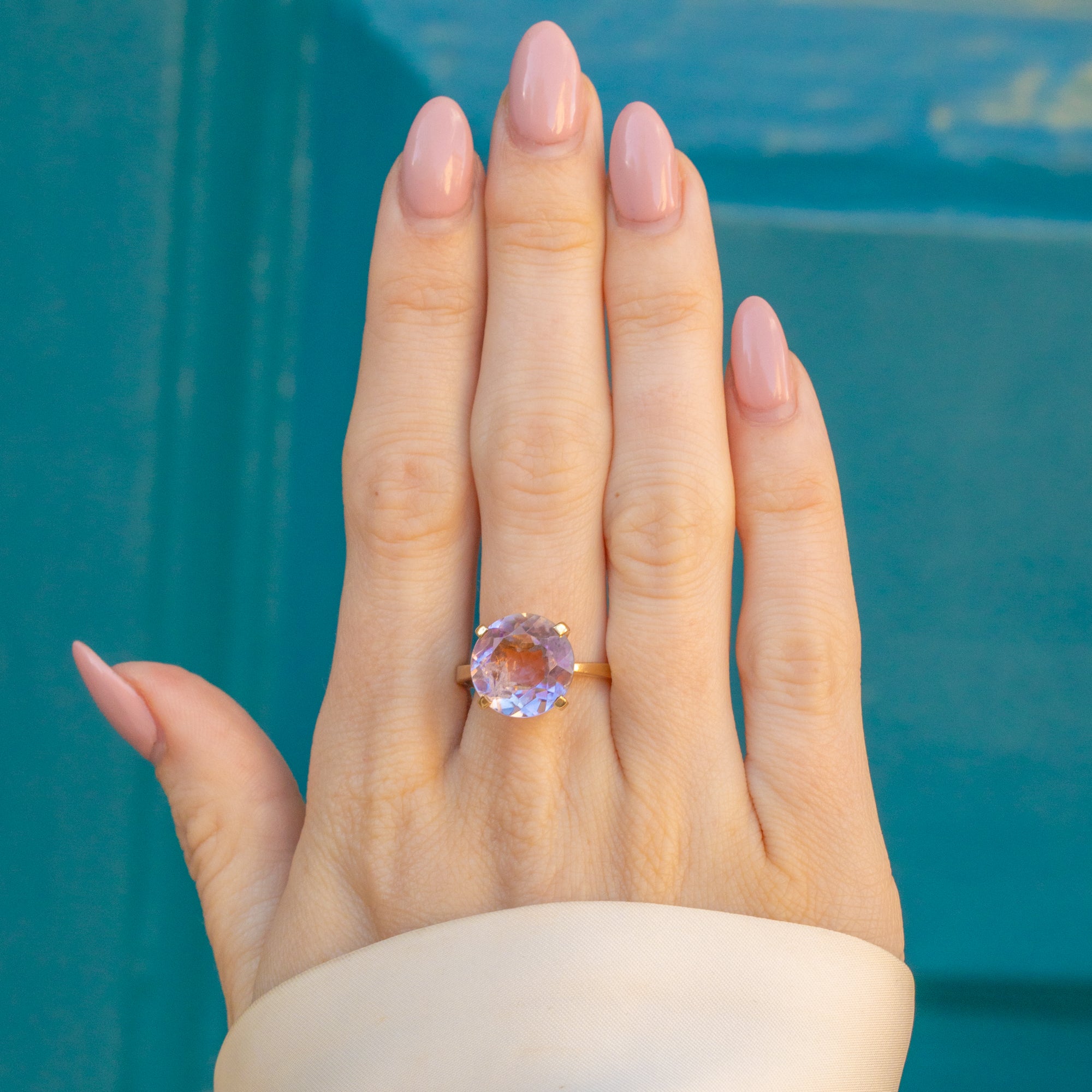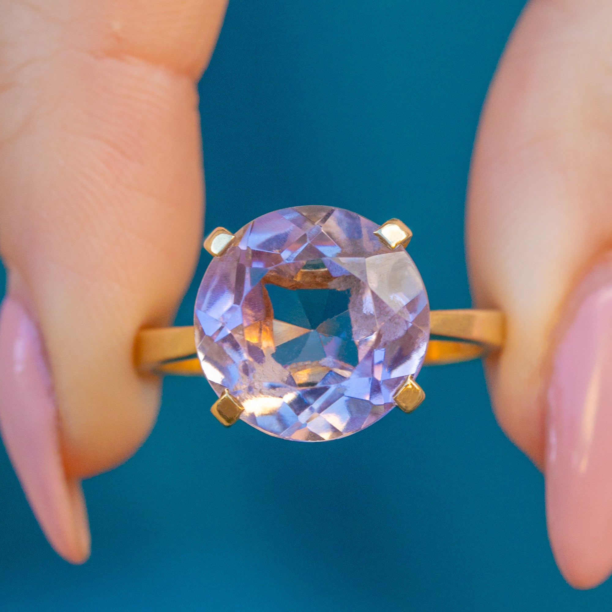 We are pleased to present this sweet 9ct Gold Rose De France Amethyst ring! With an approximate weight of 4.65ct, the lavender-hued Amethyst has a wonderful display of crisp facets that catch the light beautifully.