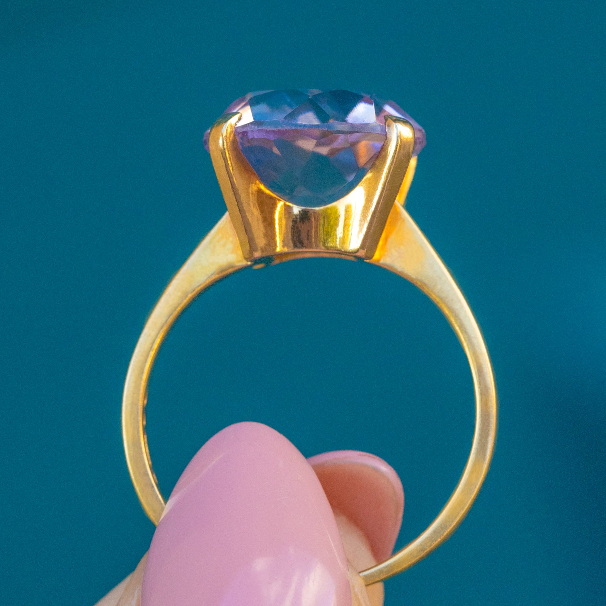 EXCELLENT. This 9ct Gold Rose De France Amethyst ring is in excellent condition. The ring is home to a 4.65ct Amethyst, that has been expertly cut and sits securely within its bezel setting. The Amethyst is a stunning "Rose de France" colour and in excellent condition with lots of sparkles and no signs of chips or wear. The piece is fully hallmarked on her inside, to 1969, she's a mid-century delight!