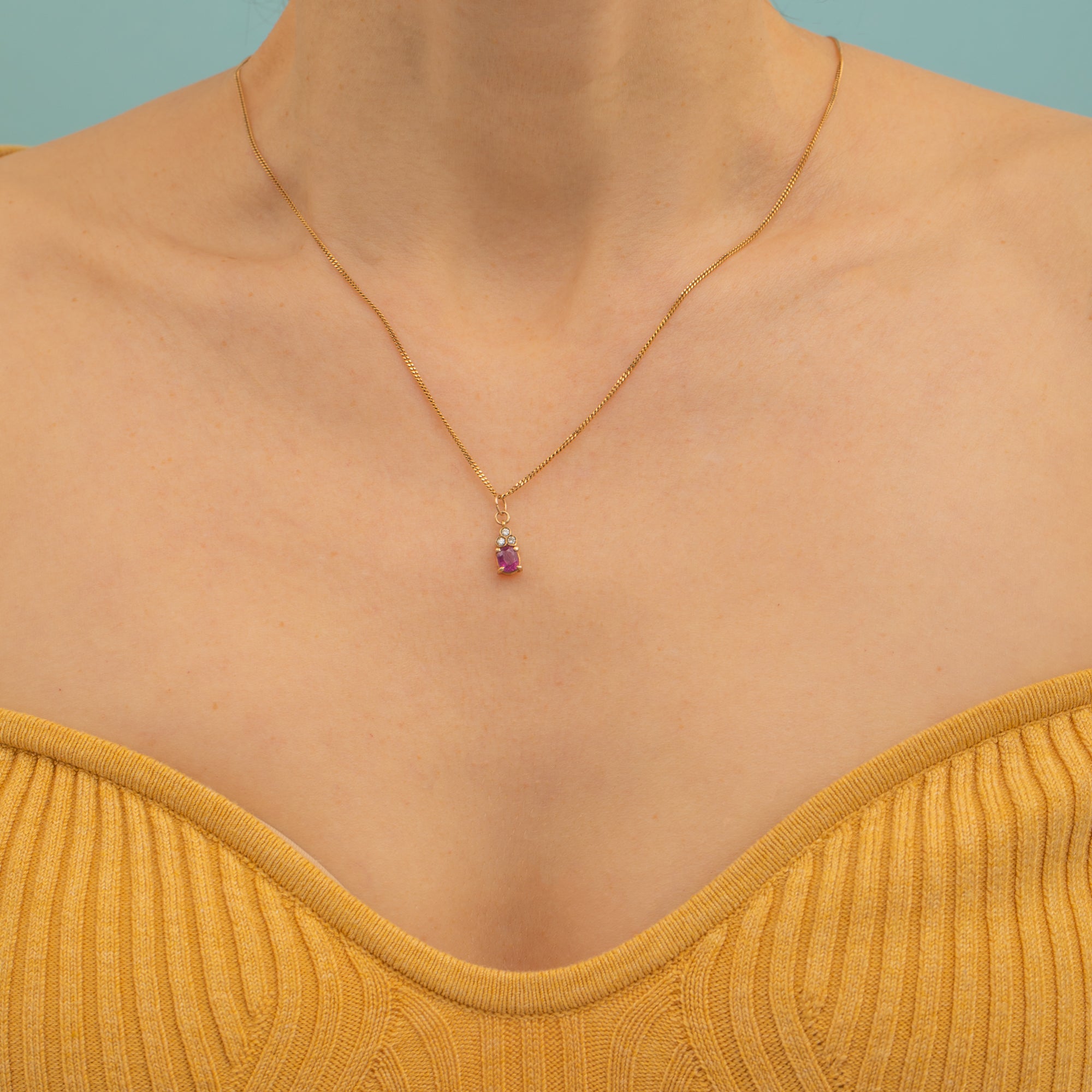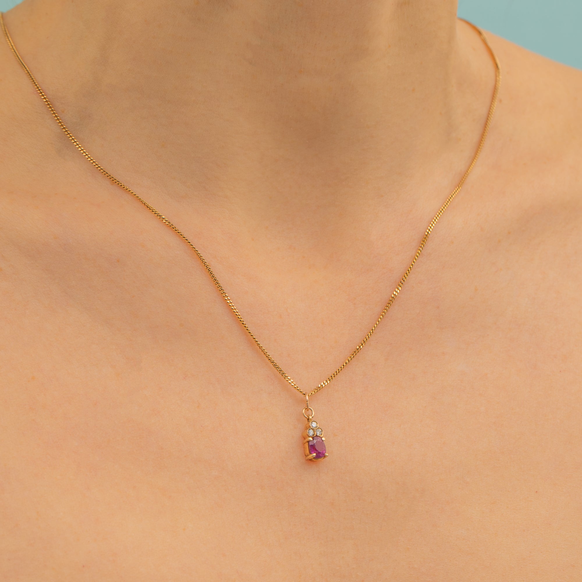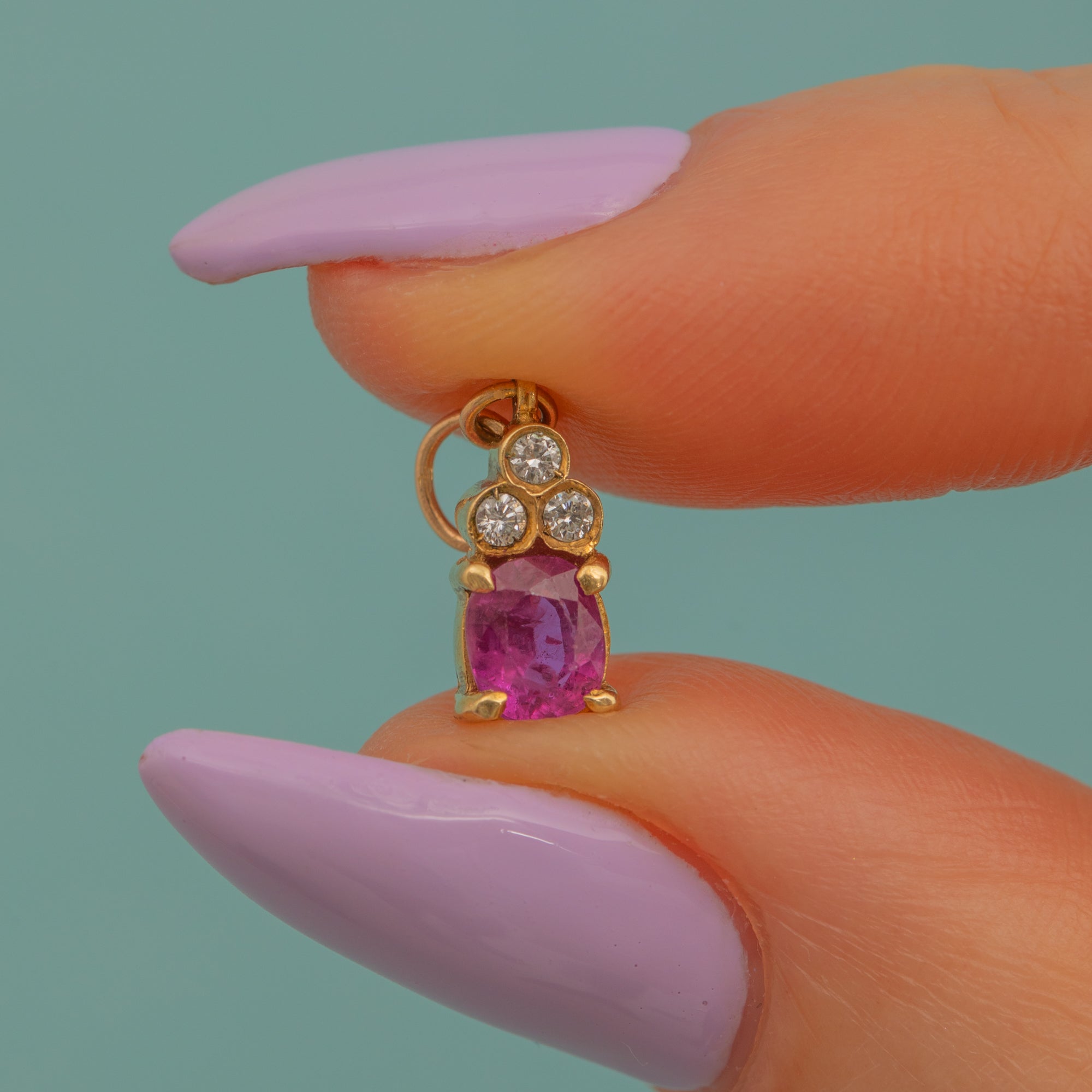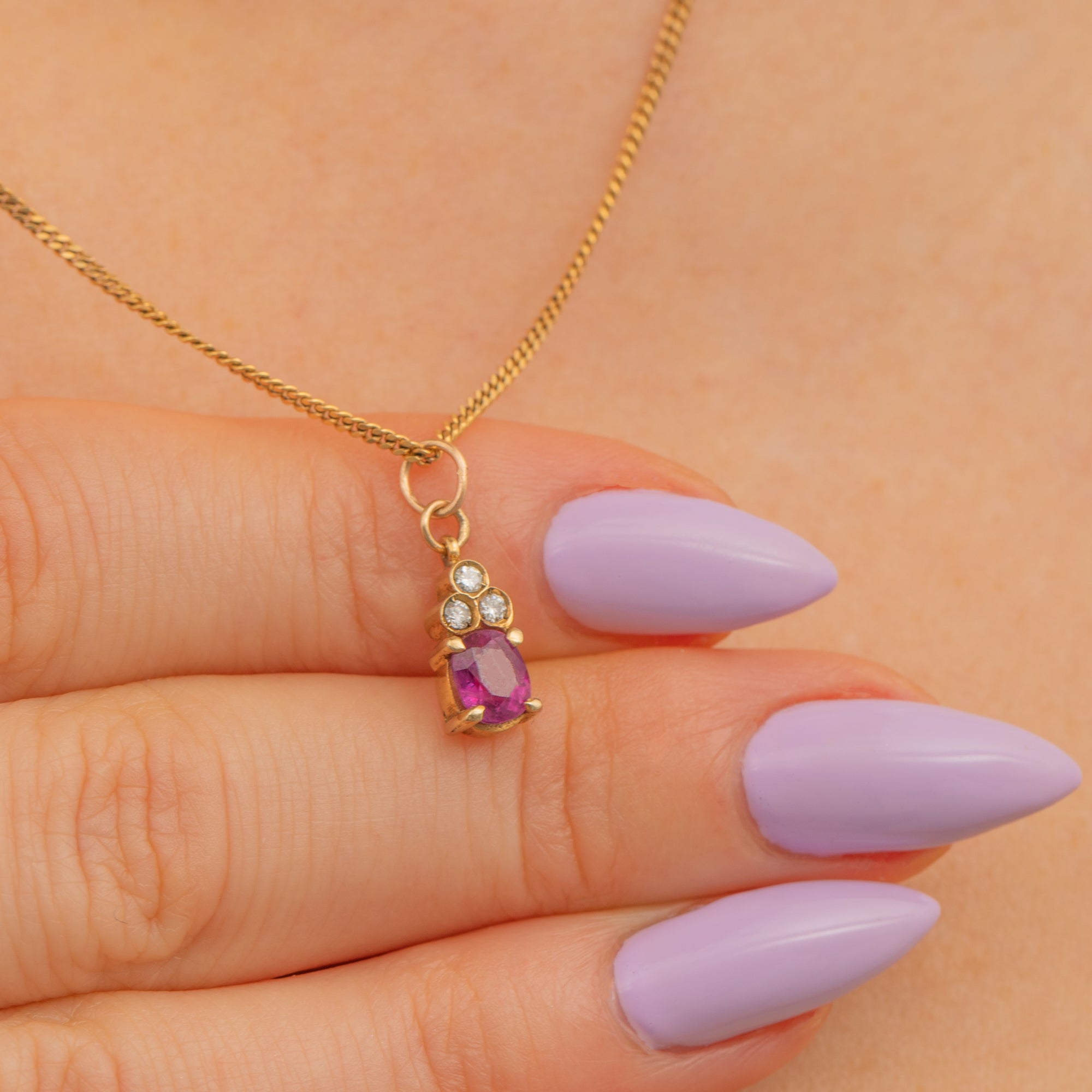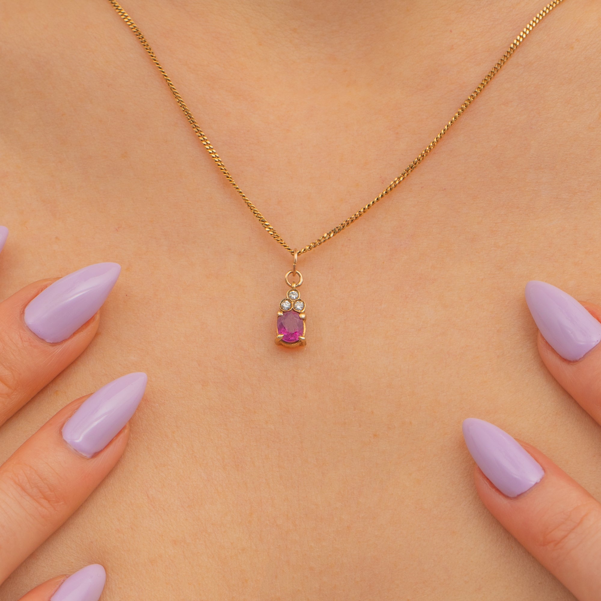 A sweet 9ct Ruby Diamond charm for your collection! The Ruby possesses an enticing fuchsia hue and is topped by three dainty Diamonds that all sparkle in the light.