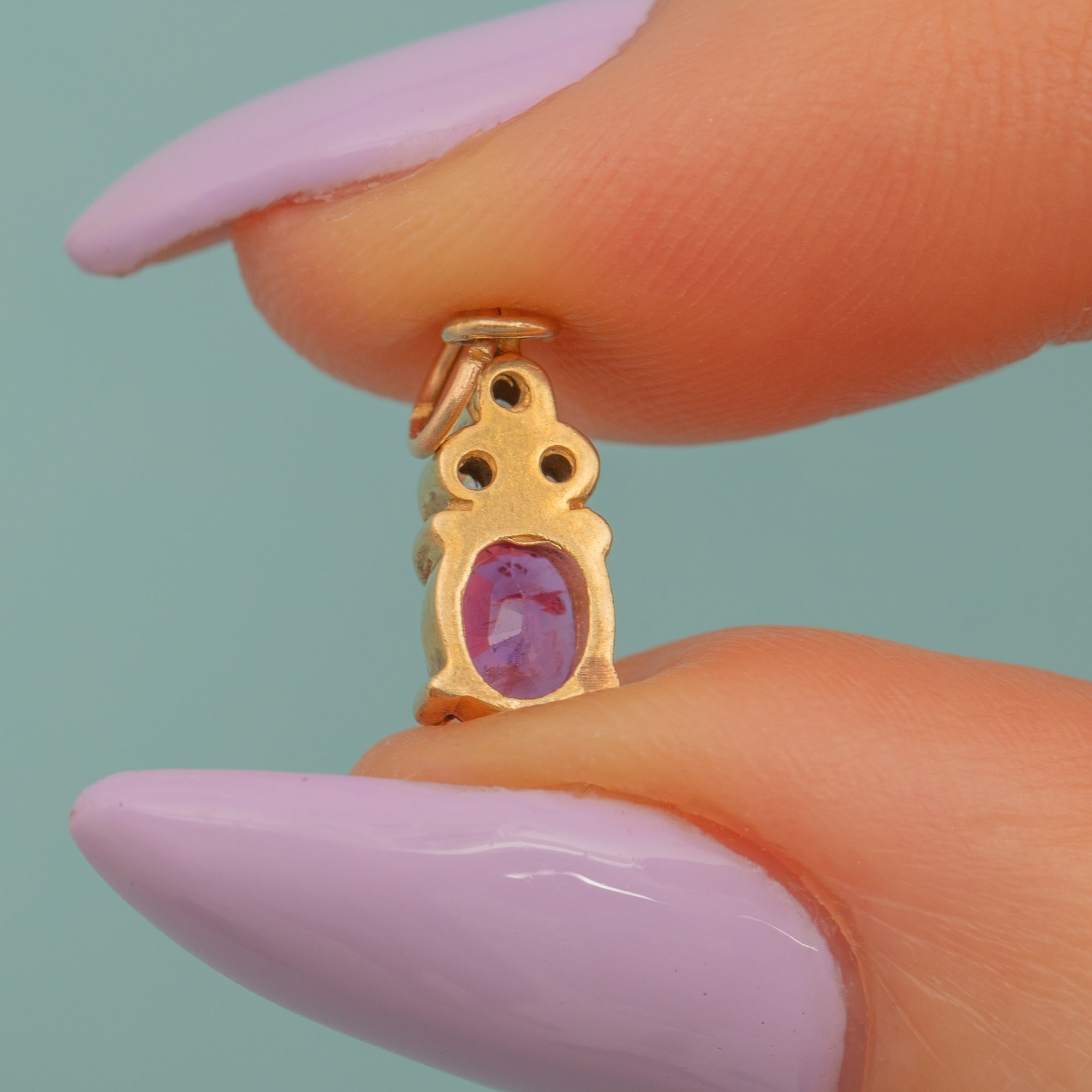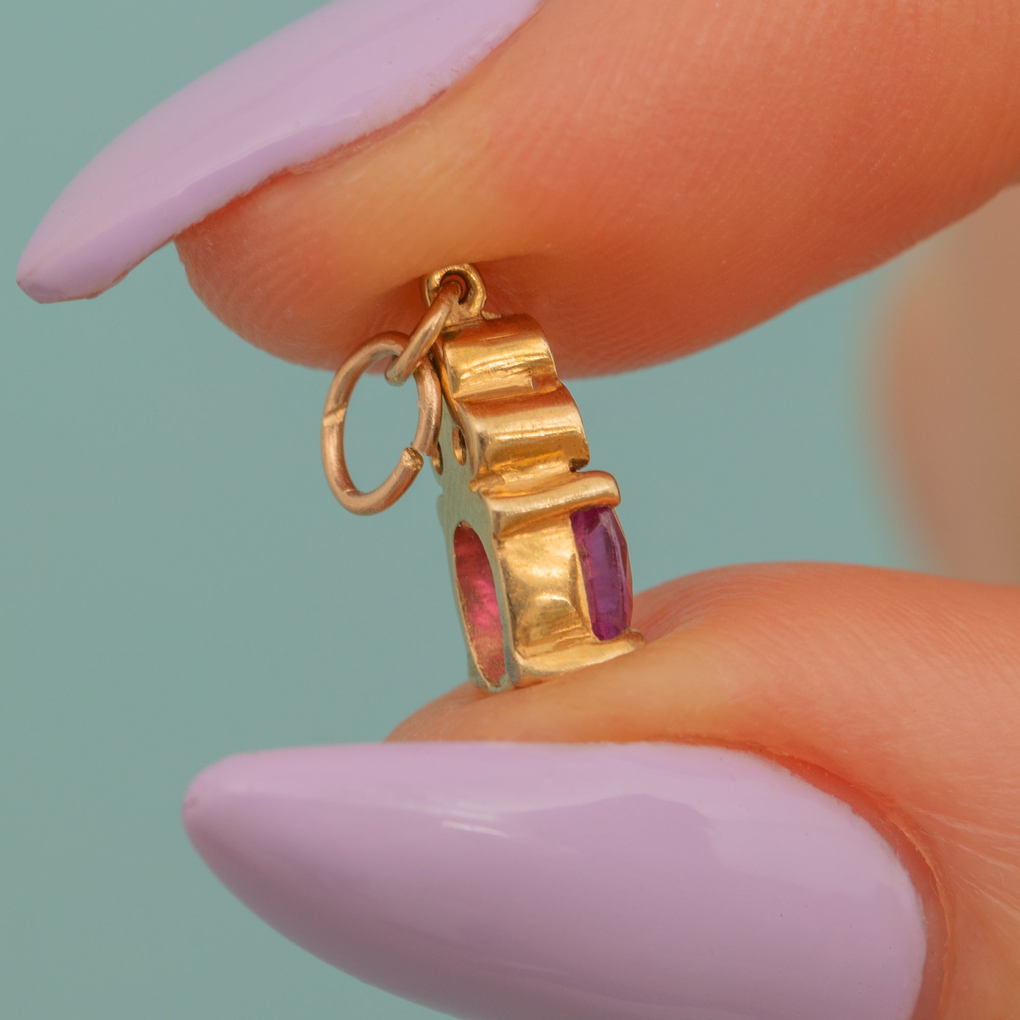 VERY GOOD-EXCELLENT. This 9ct Gold Ruby Diamond charm is in superb condition. The Ruby and Diamonds are secure within their settings and are free from chips or abrasions. The only thing to note is a file mark on the back of the piece from where it has been previously purity tested, but this can't be seen when worn and is only visible upon close inspection. With so much wear potential, don't hesitate to incooporate this vintage Ruby pendant into your jewellery collection!