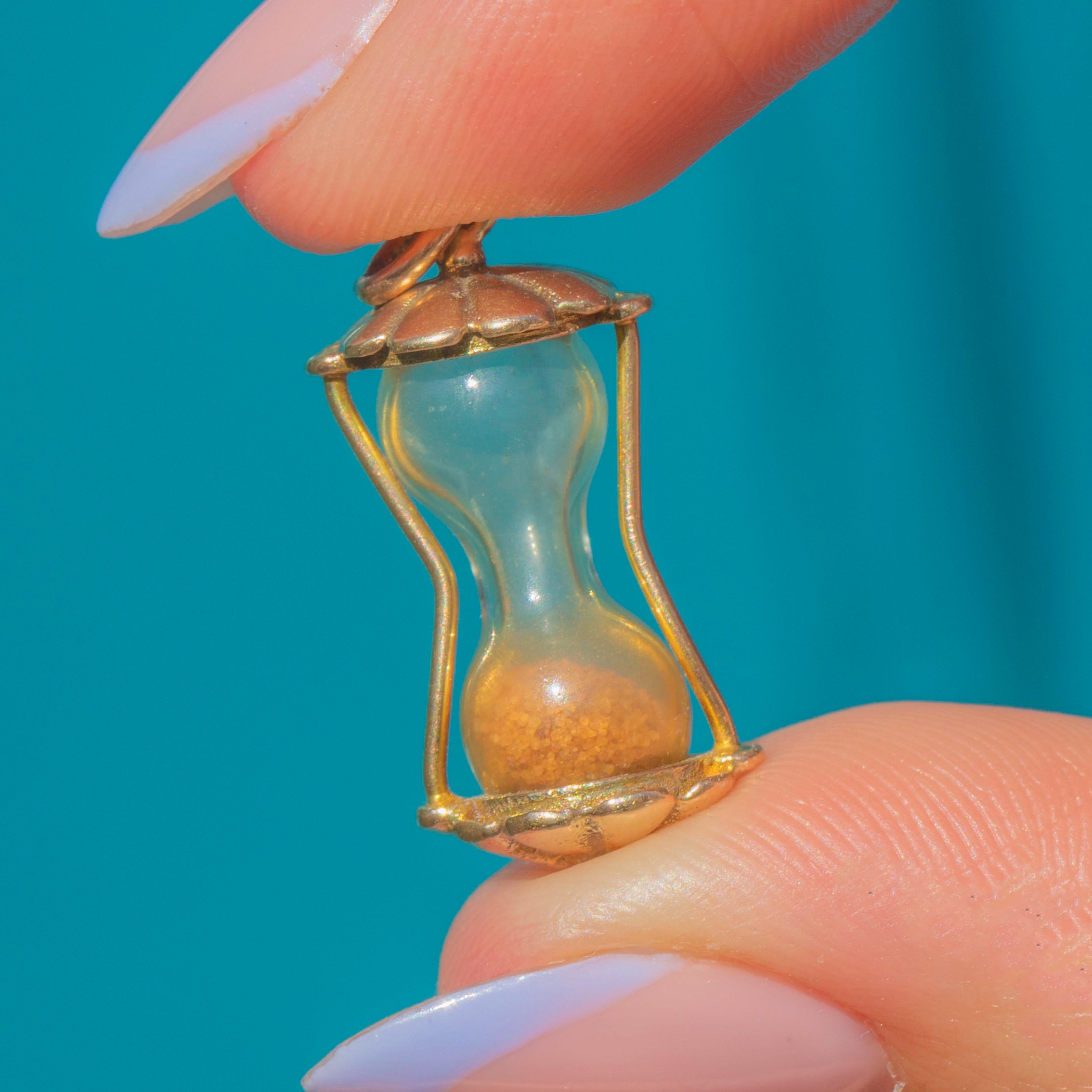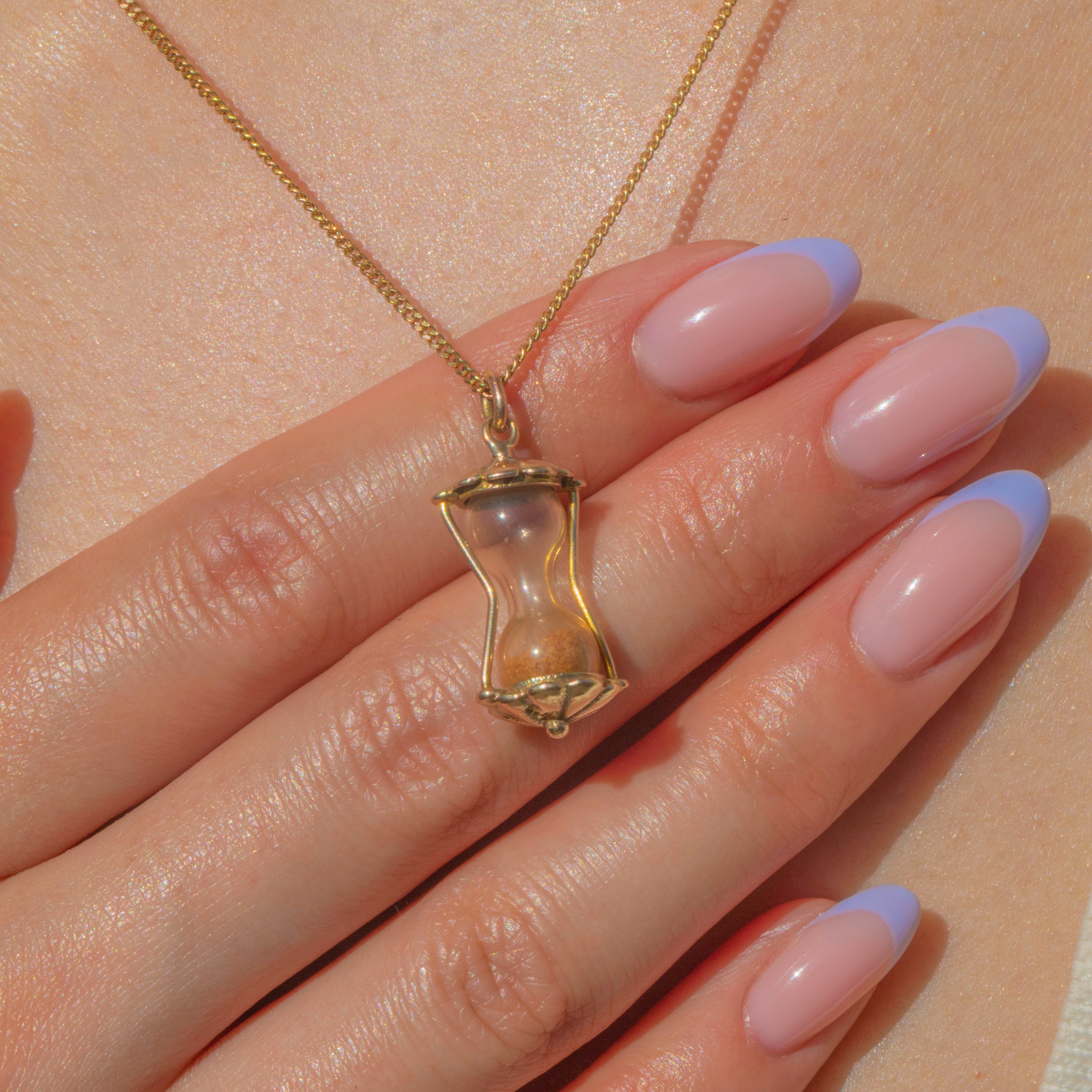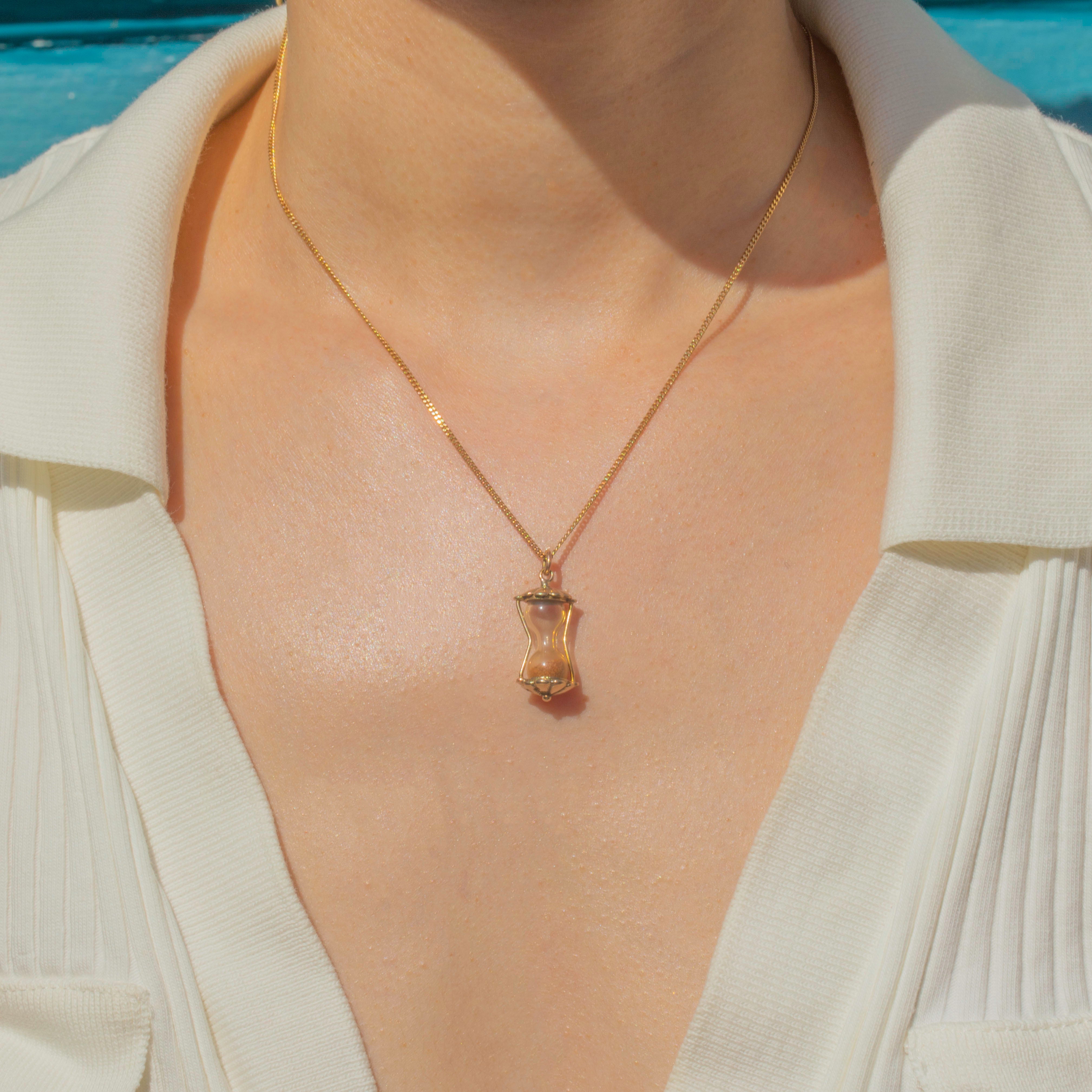 Crafted from buttery 9ct Gold, this petite sand timer is so charming! She is a testament to vintage craftsmanship, intricately detailed with pretty glossy settings. Complete with sand granules, this vintage charm is full of depth and is the perfect piece to suspend from a fine chain to add intrigue to your attire!