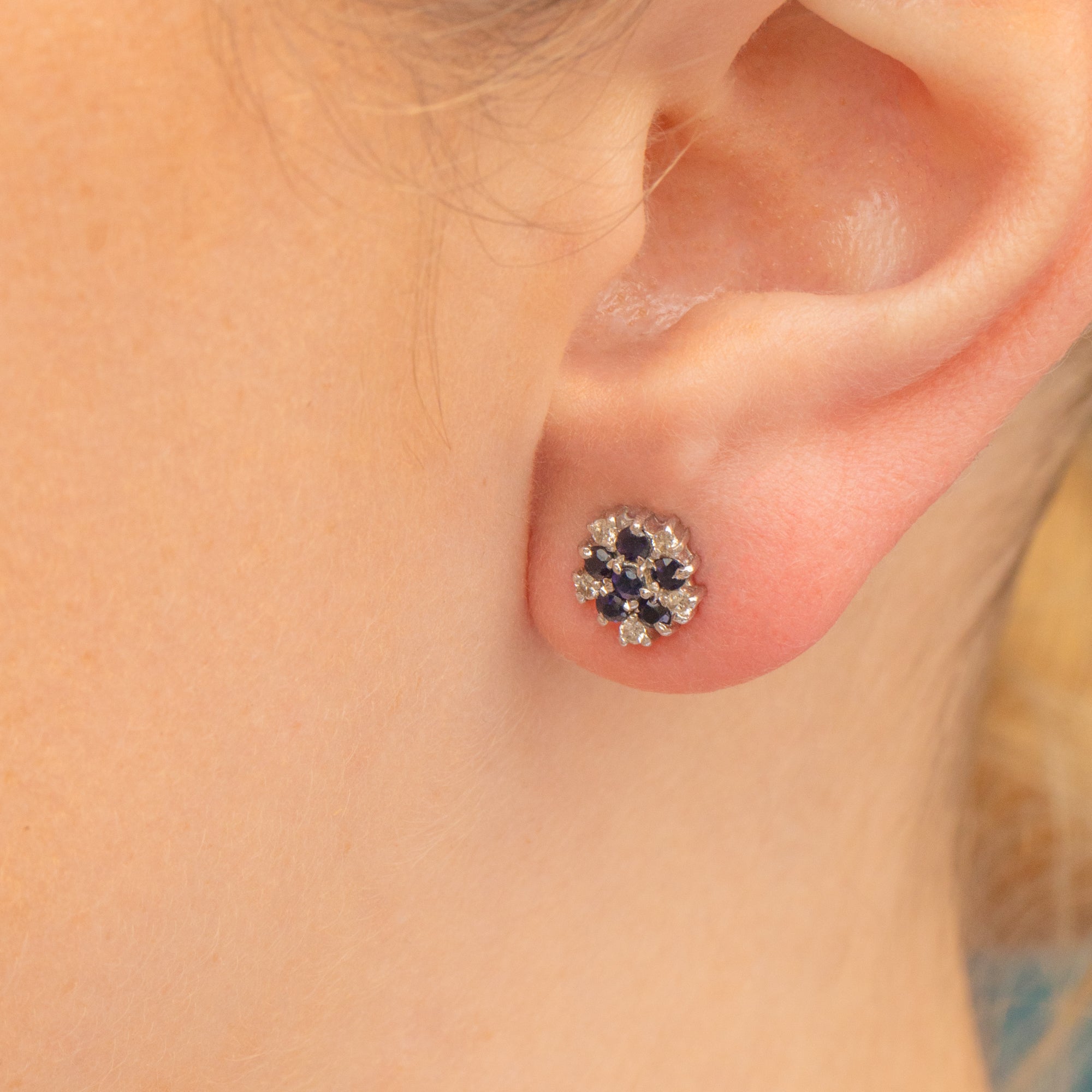 These 9ct Gold Sapphire Diamond flower cluster stud earrings provide bundles of sparkle! The midnight blue Sapphire and crisp white Diamond combination make for perfectly formed flowers that sit snug in your lobes.
