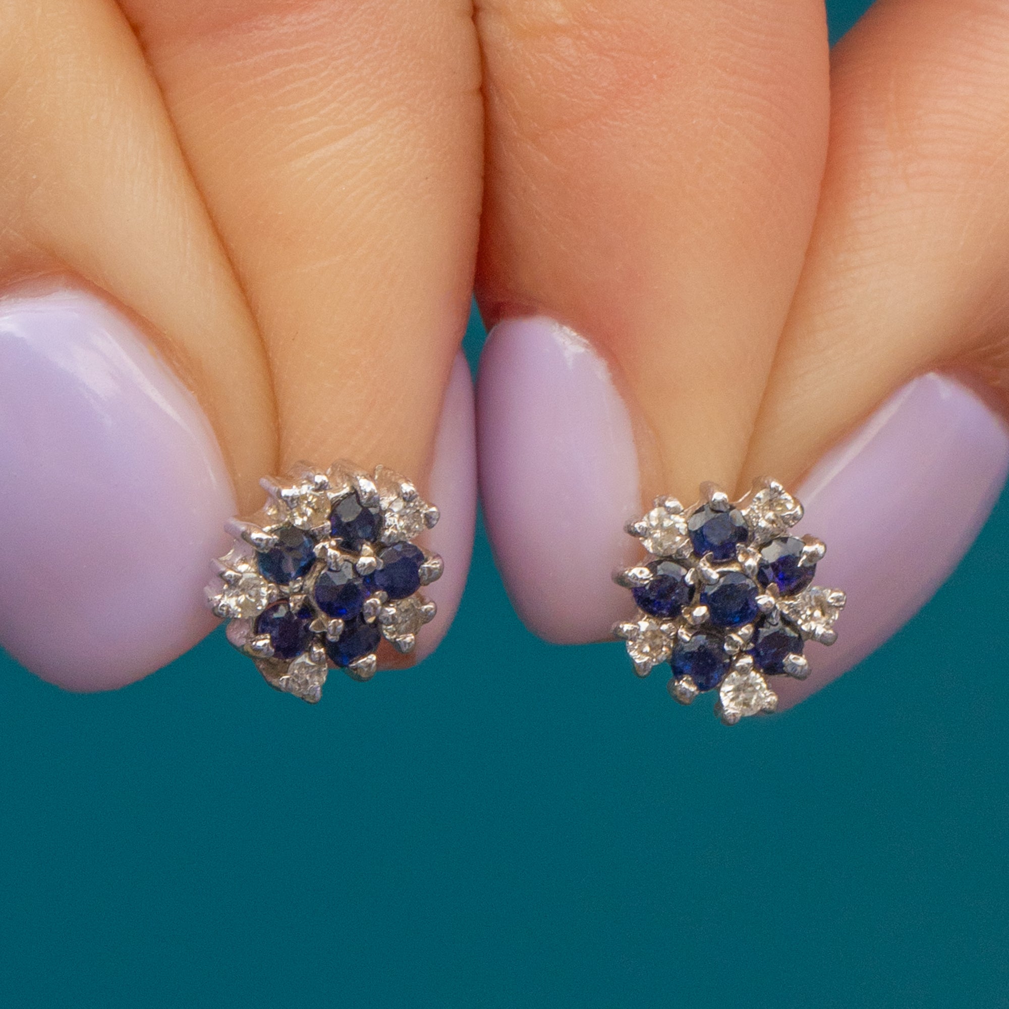 9ct Gold Sapphire Diamond Flower Cluster Stud Earrings