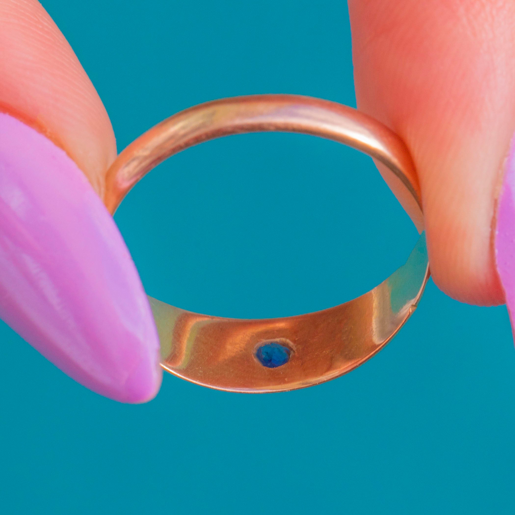 非常に良好:サファイアはしっかりとフラッシュセッティングされ、美しい状態を保っています。細部までよく見るとわずかな摩耗が見られますが、ゴールドバンドには経年と使用に伴う軽い表面の擦り傷や色調の変化が見受けられます。全体的に丁寧に管理されており、セッティングも堅牢で、すぐにご着用いただけます。
