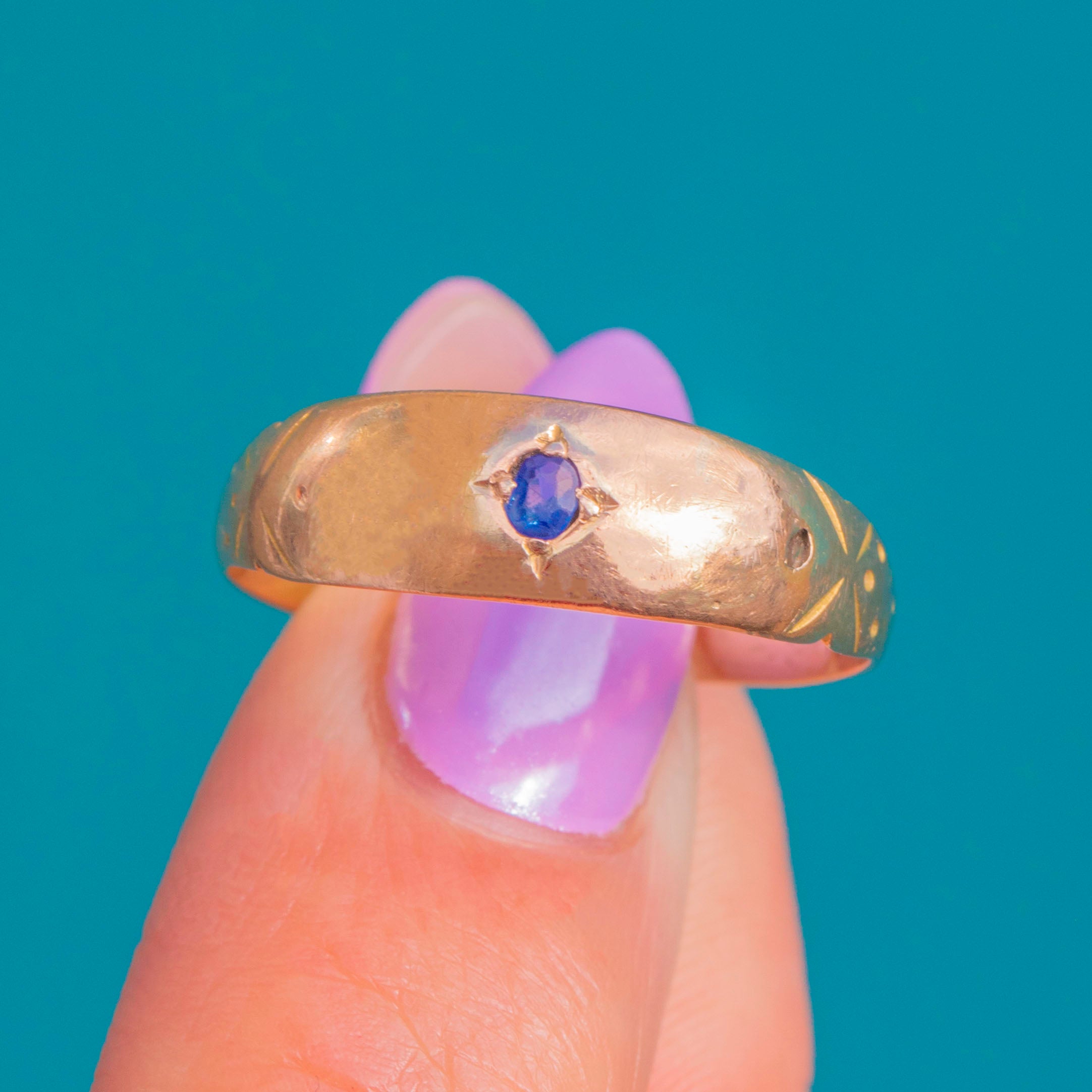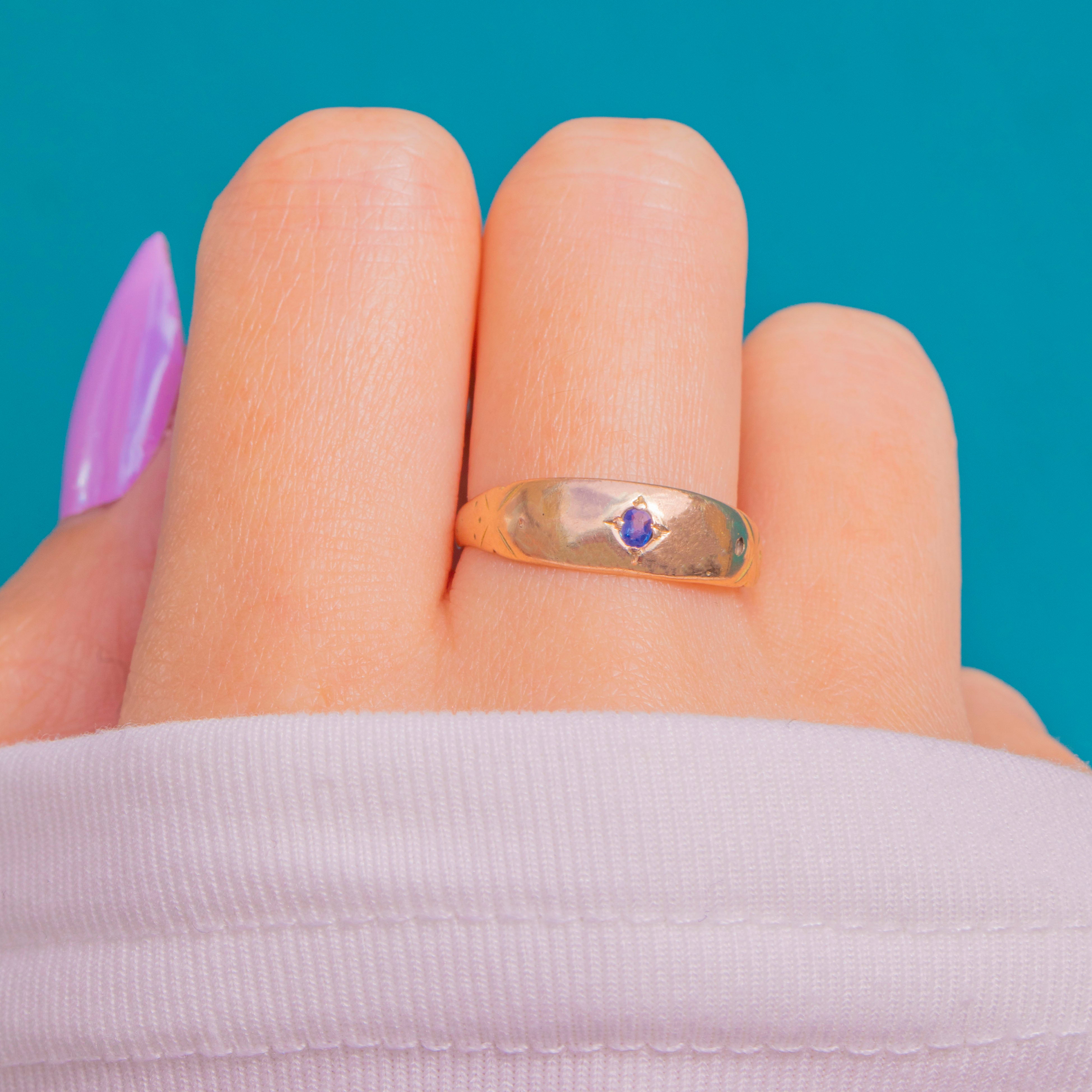 Edwardian期のクラシックなジプシーリング。9カラットゴールドに、深いブルーのサファイアが一粒、繊細な星型の彫刻の中に美しくセットされています。ロー・プロファイルで滑らかな仕上がりは、シルクのように指に馴染み、控えめながらも星空のような輝きを放ちます。
