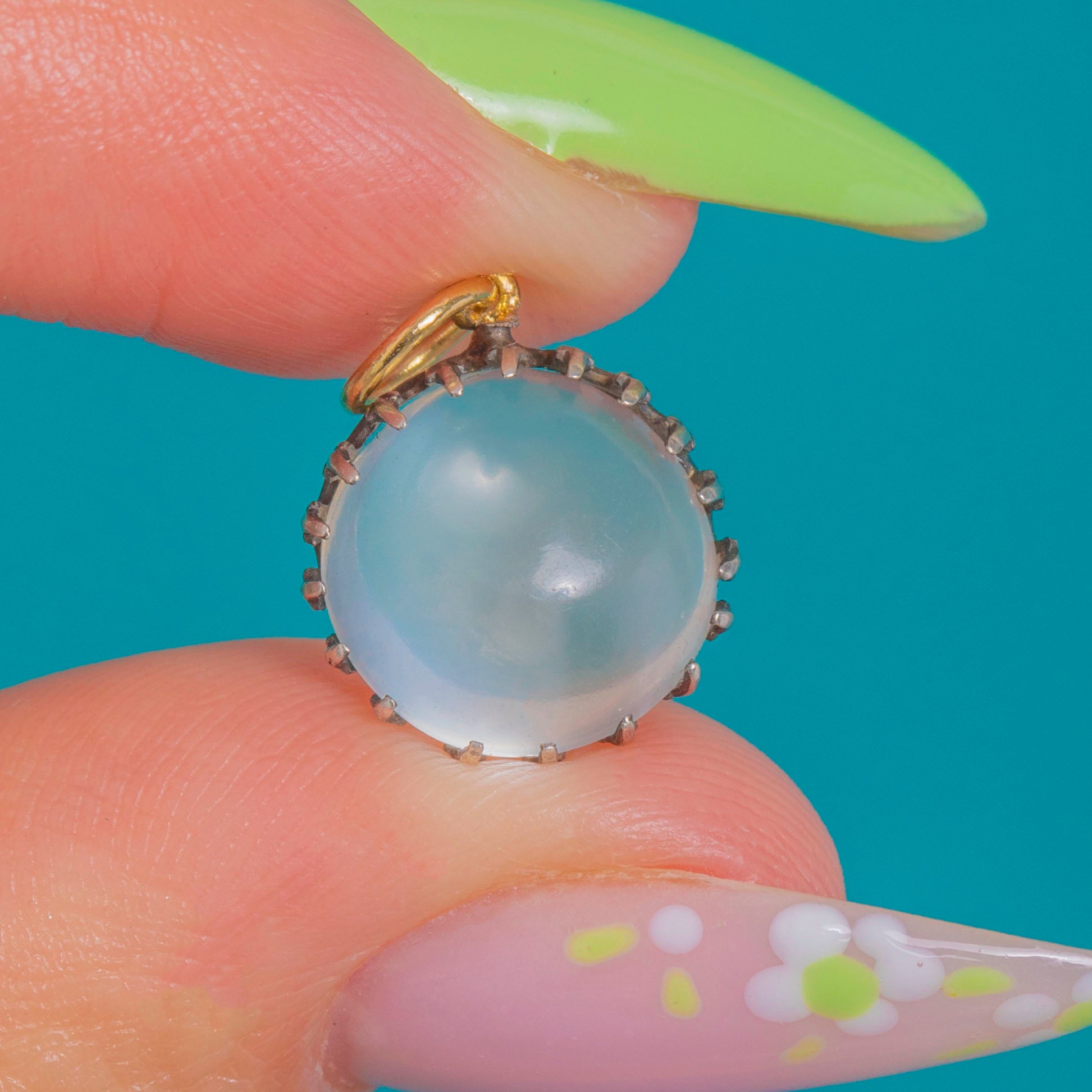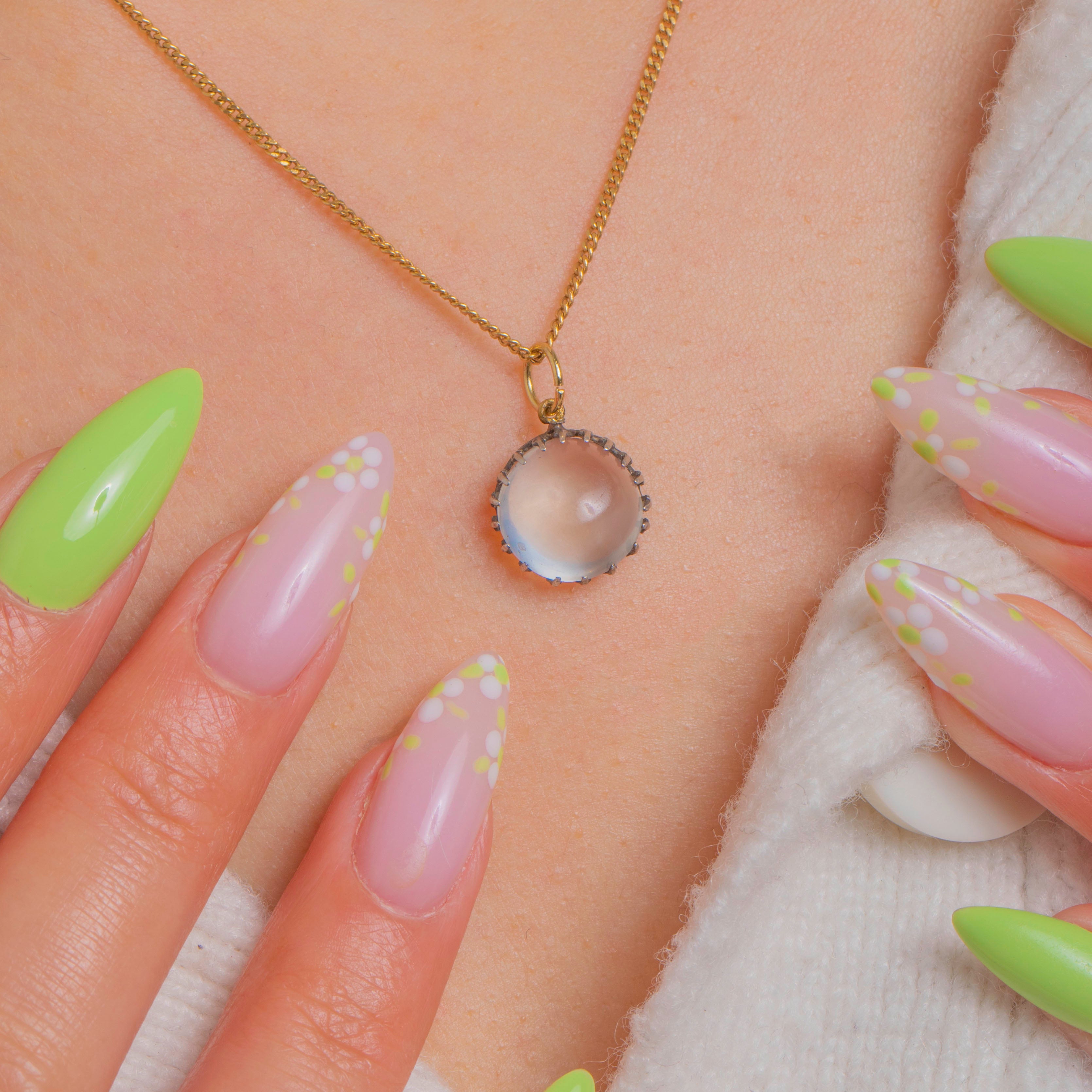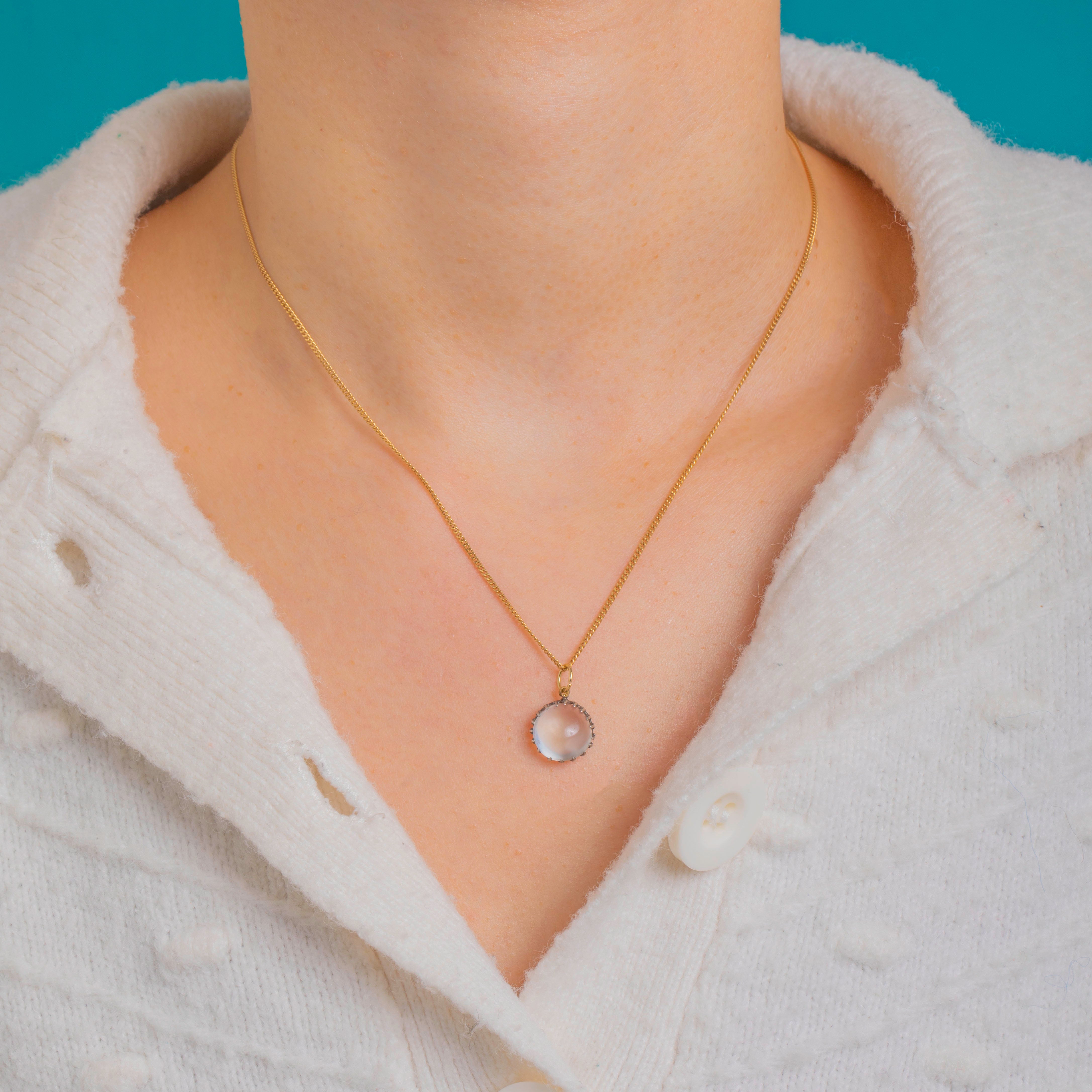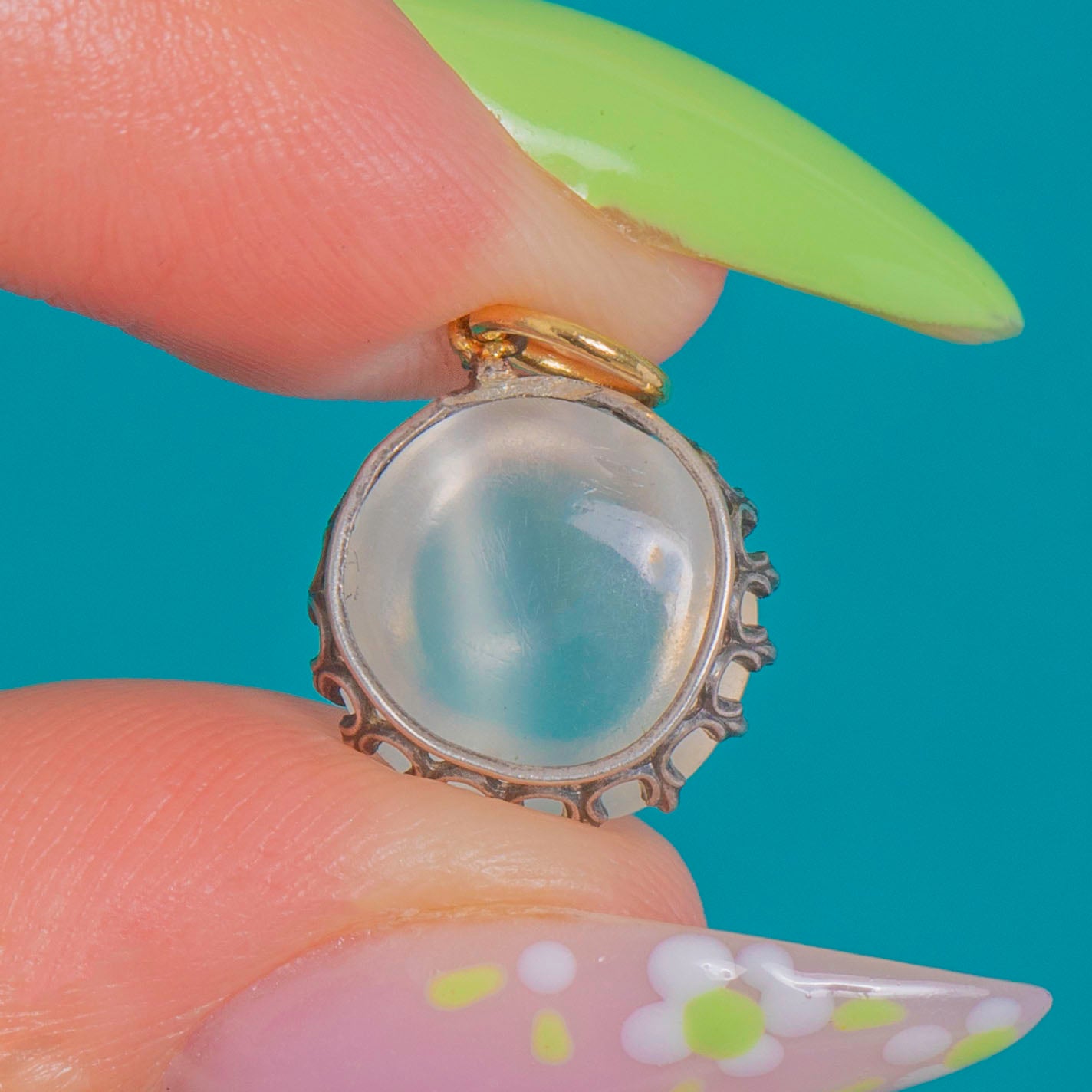 幻想的なEdwardianムーンストーンチャーム。私たちが愛してやまない、神秘的で青みを帯びたアデュラレッセンスが魅力です。高さのあるラウンドカボションは、クラウンスタイルのシルバーコレットに優雅にセットされ、繊細なスカラップ状のギャラリーが石に軽やかな存在感を与えています。9カラットゴールドのジャンプリングが上品なコントラストを添え、お好みのチェーンやチャームブレスレットに簡単にお付けいただけます。