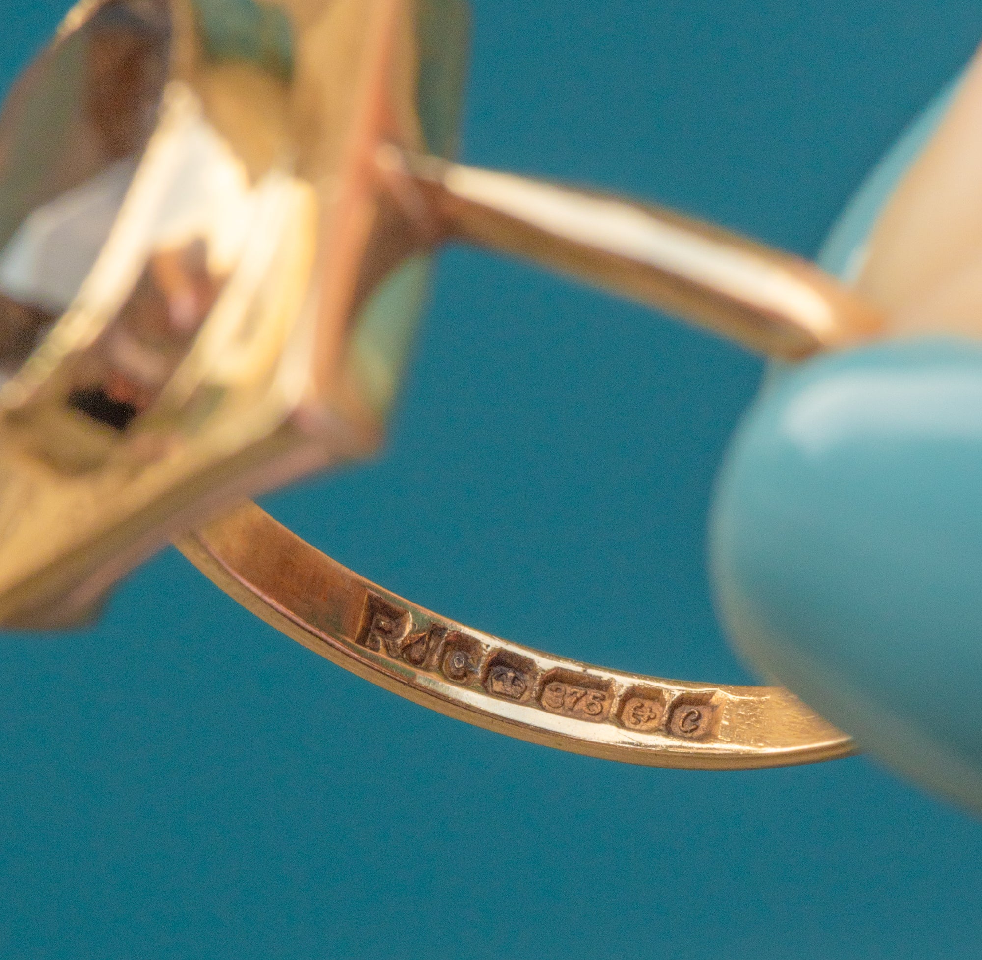 EXCELLENT. This 9ct Gold Smoky Quartz panel ring is in excellent condition. The Gold has an even buttery hue throughout and the hallmarks are fully legible allowing us to accurately date her to 1977. The Smoky Quartz has a crisp set of facets and is securely set, free from chips or abrasions. This fabulous vintage treasure promises many more years of wear and enjoyment!