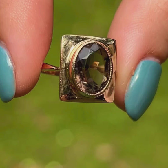 Stand out from the crowd with this striking 9ct Gold Smoky Quartz panel ring! Crafted from buttery 9ct Gold, this vintage delight features a fabulously faceted 1.79ct Smoky Quartz framed by a unique rectangular panel making her a show-stopping piece.