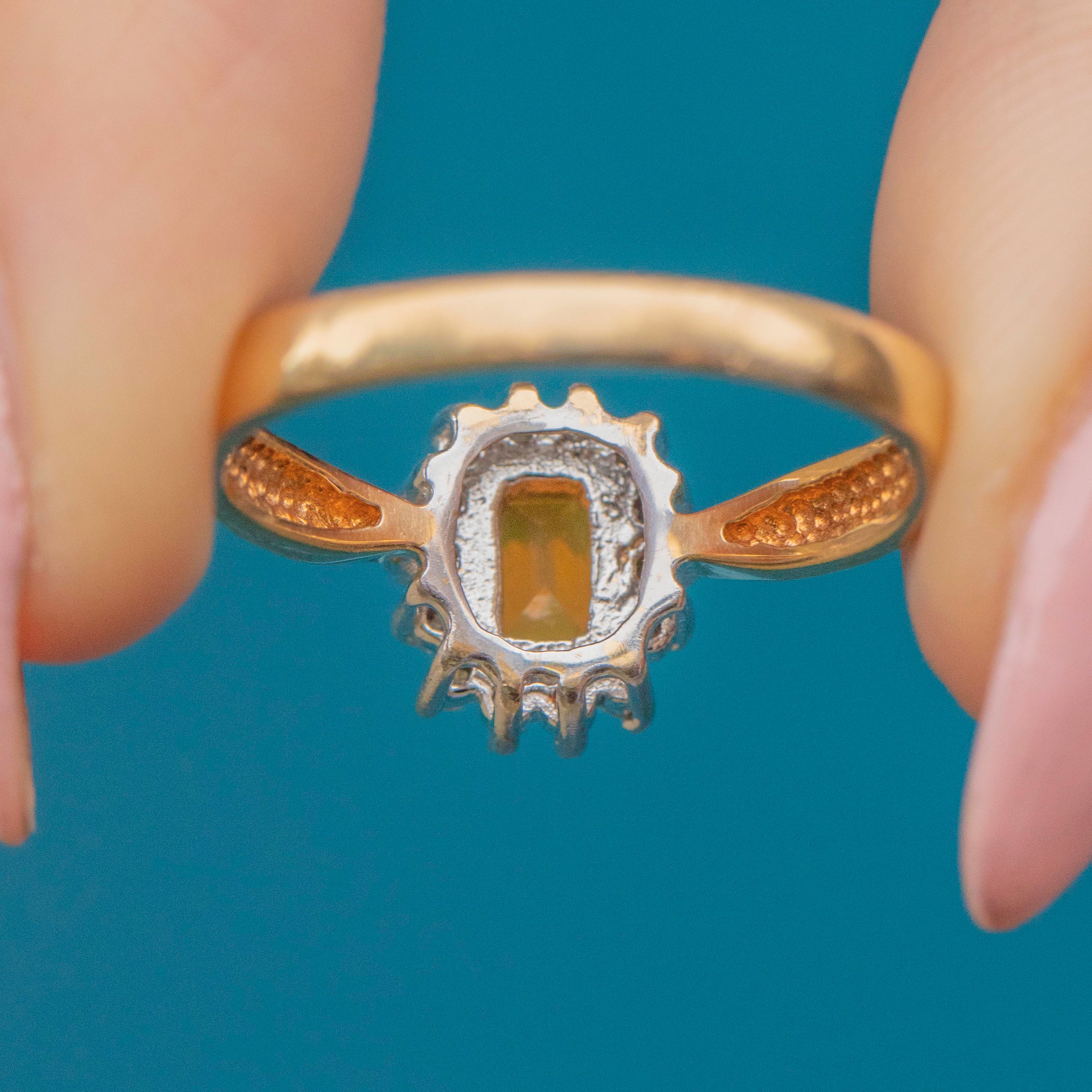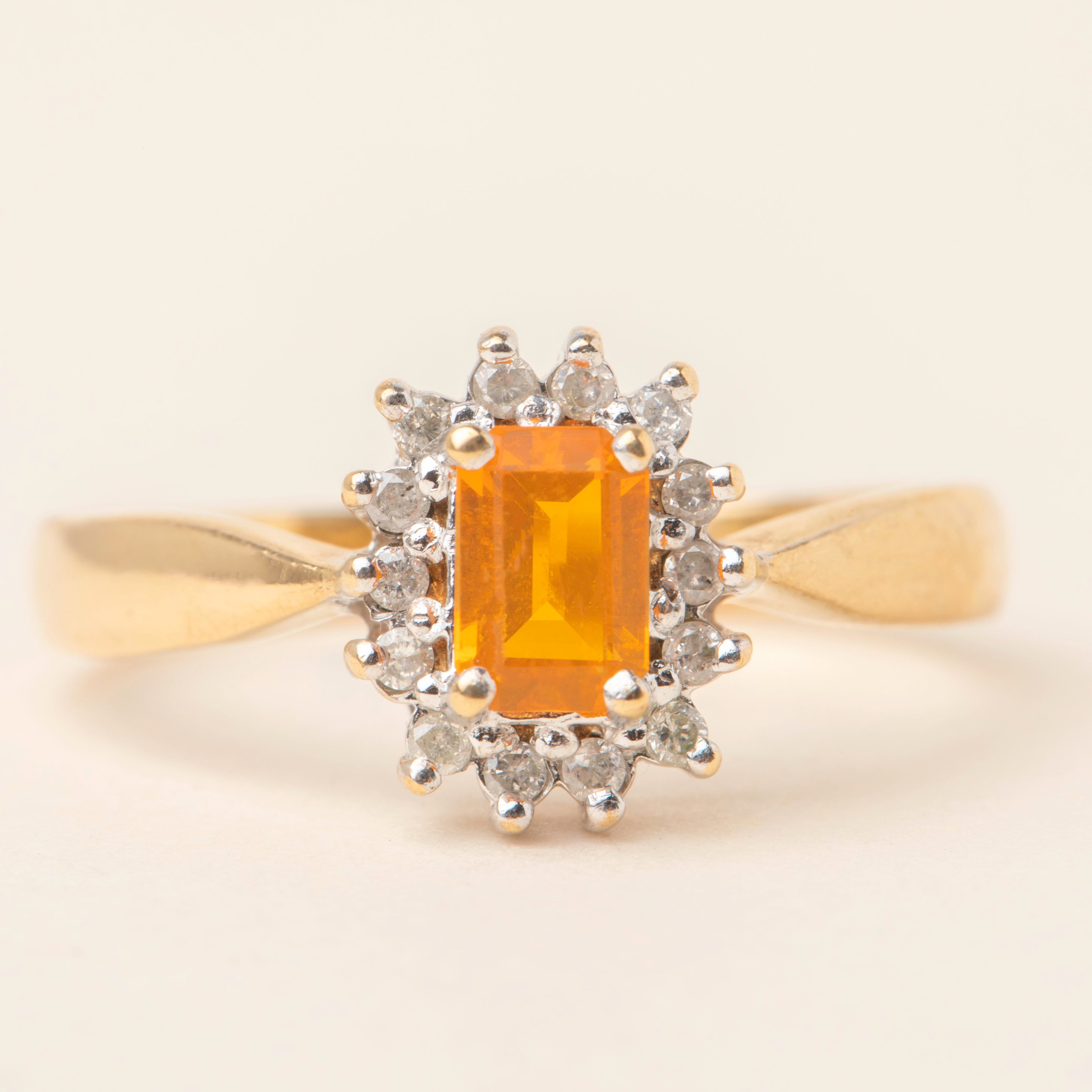 VERY GOOD. This 9ct Gold Spessartine Garnet Diamond cluster ring is in excellent condition. The Garnet has been beautifully cut and the Diamonds sit prettily. The ring band has some surface wear commensurate with age, but when you wear it, it feels smooth and this wear is only visible up close.