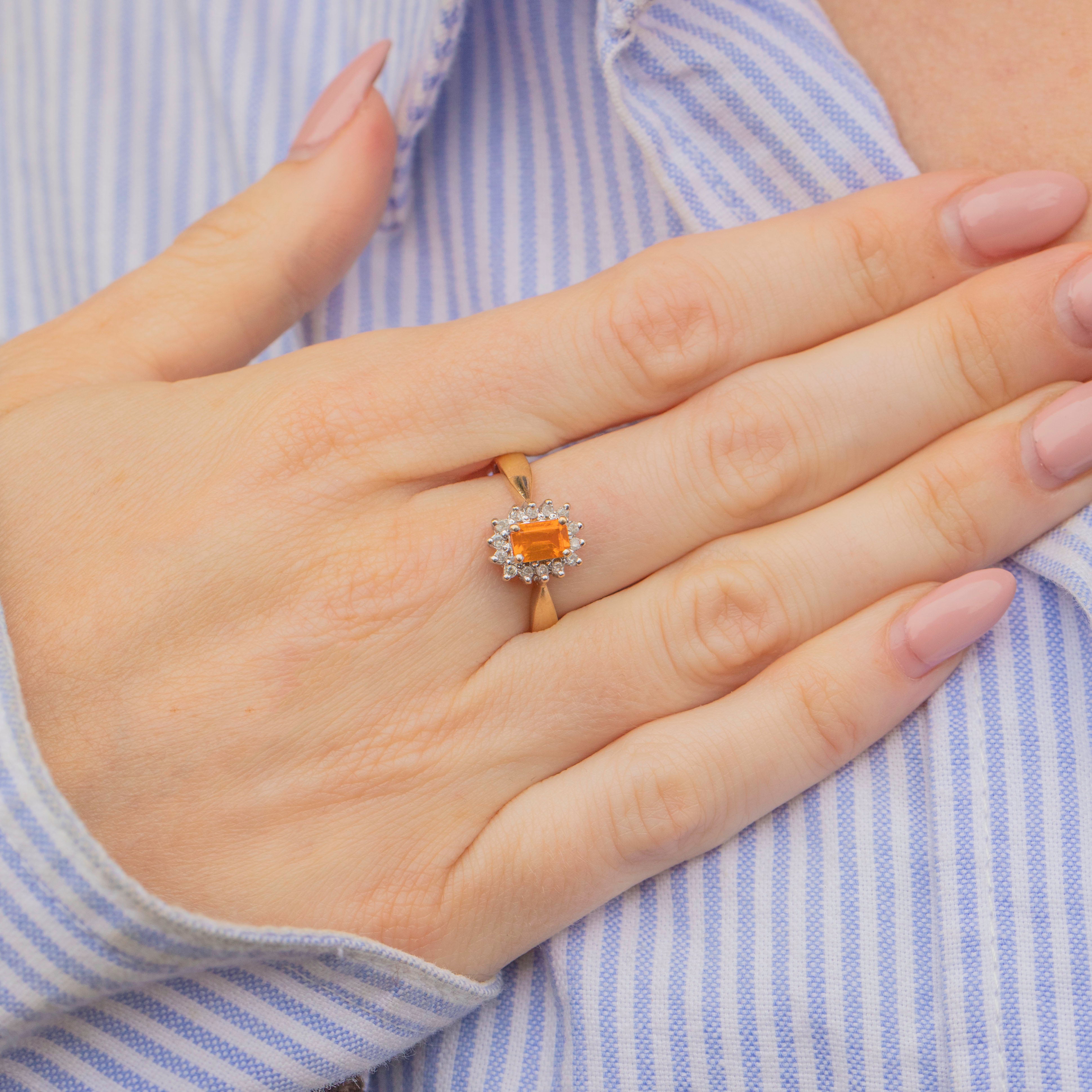 This 9ct Gold Spessartine Garnet Diamond cluster ring is the perfect way to incorporate a pop of colour into your collection, with its fiery Spessartine Garnet at its centre!