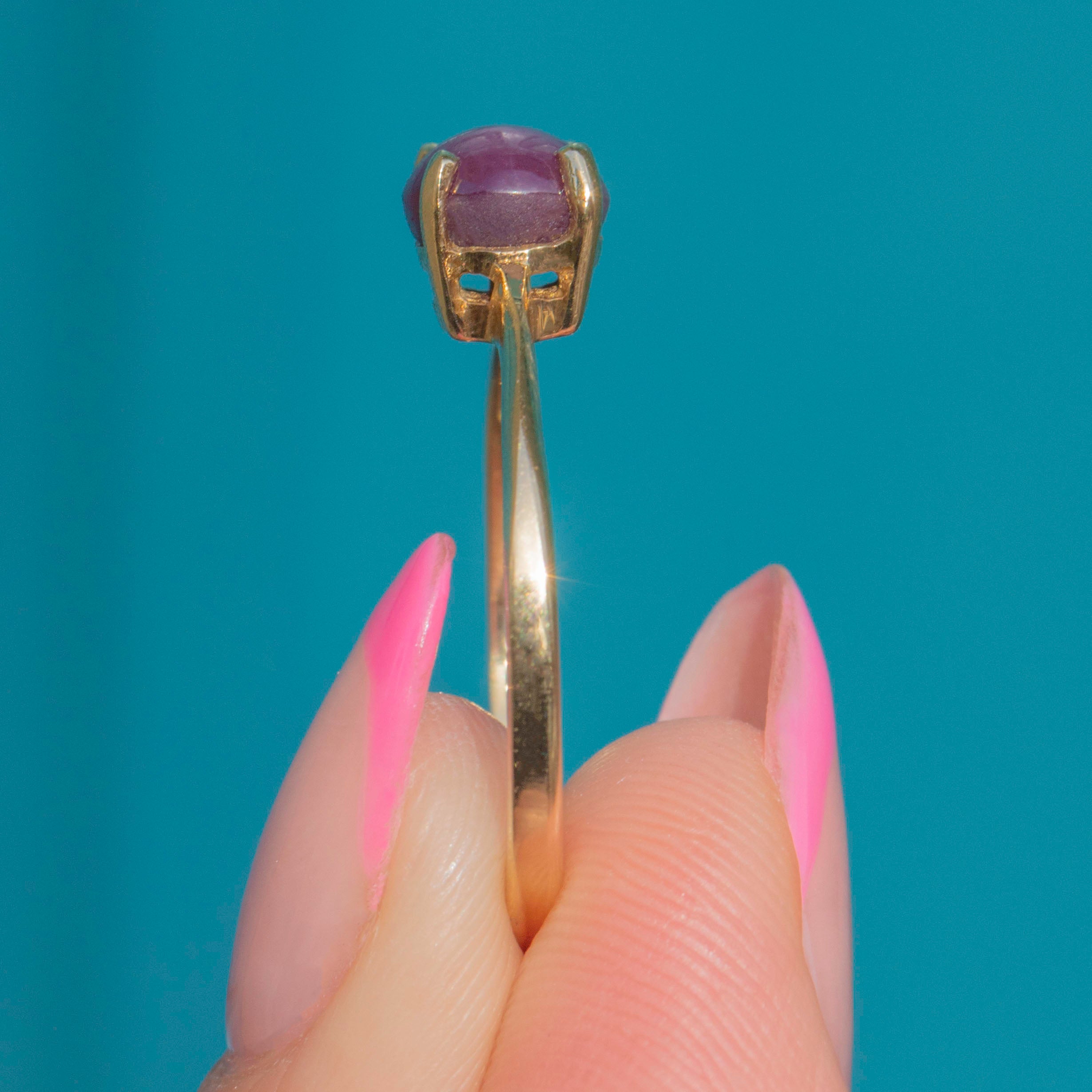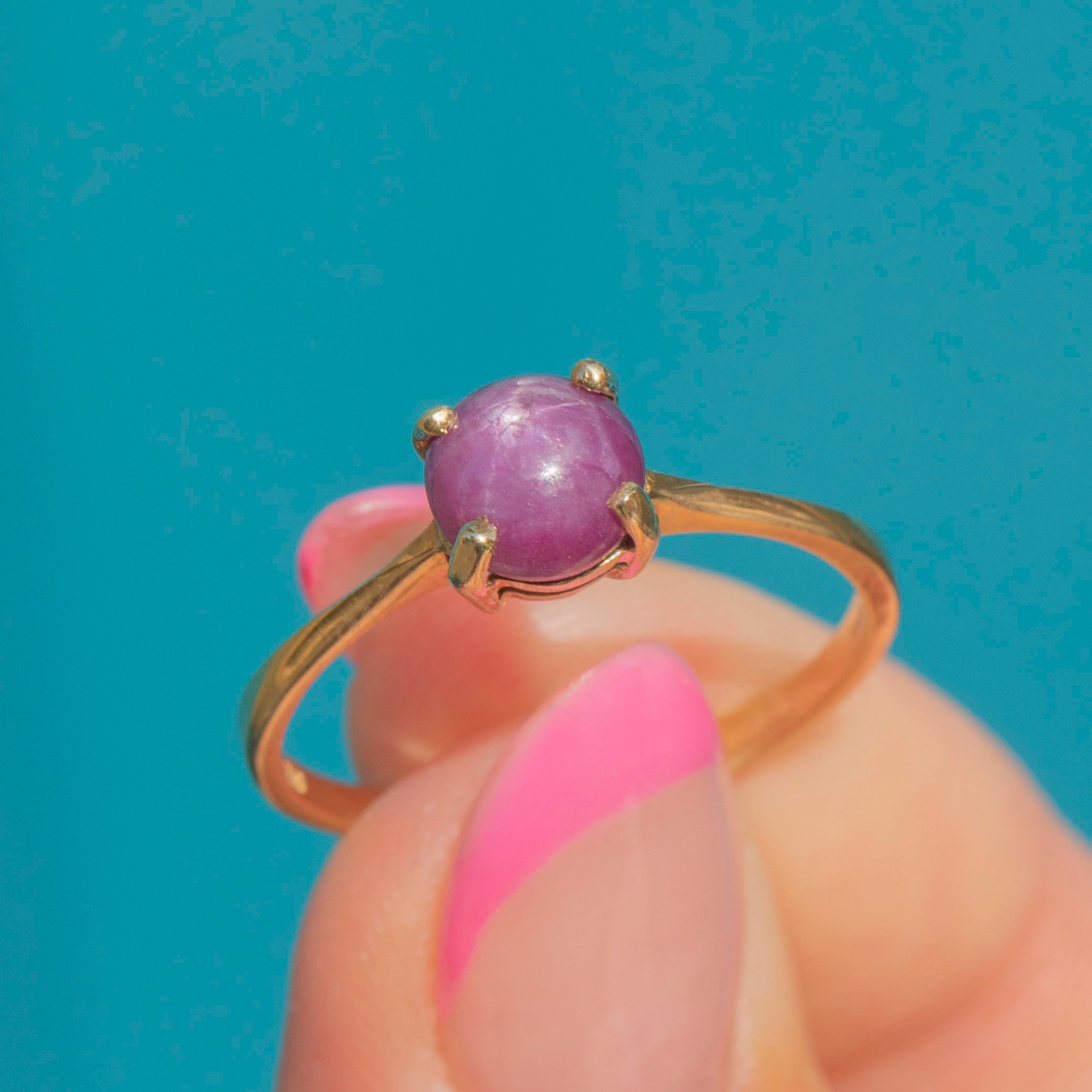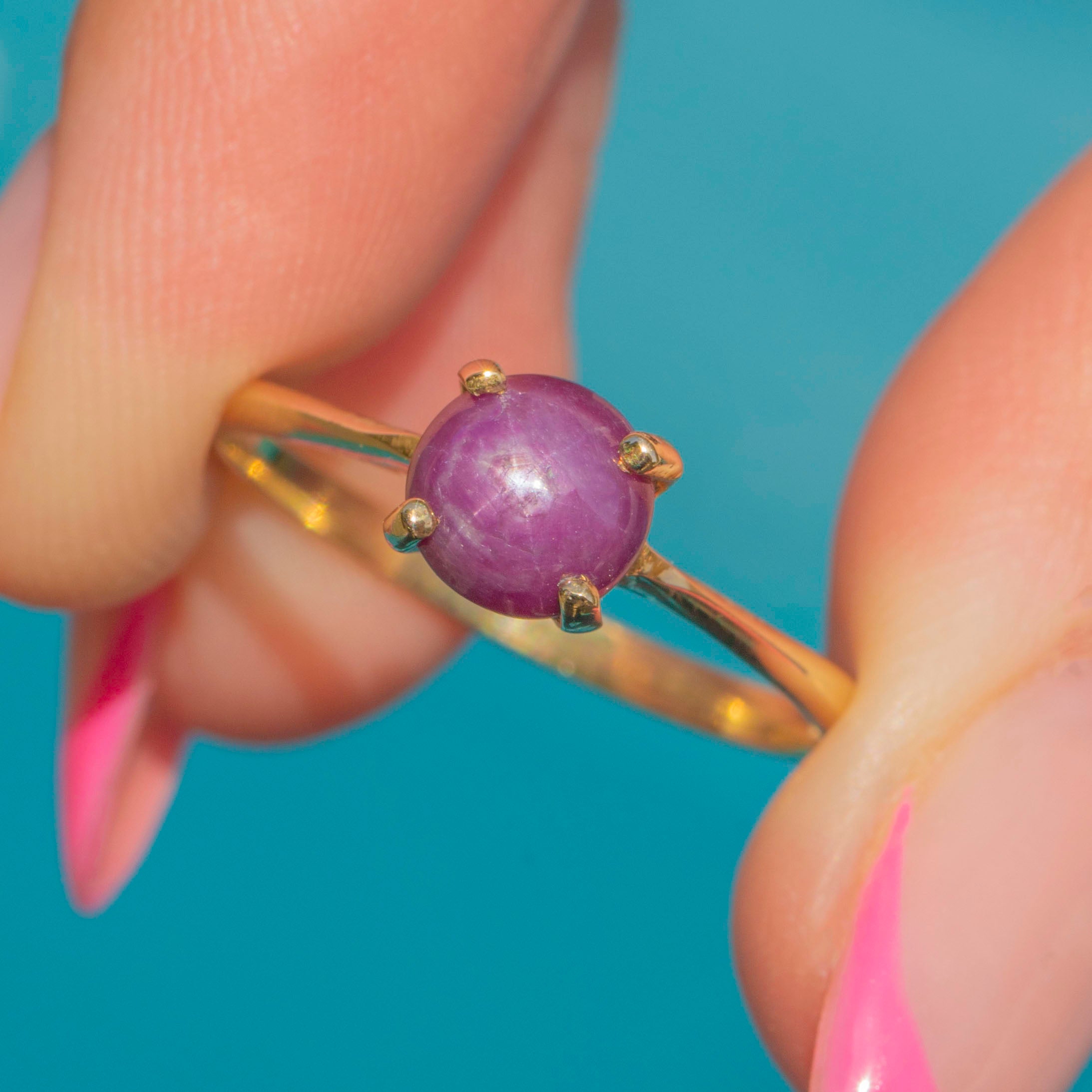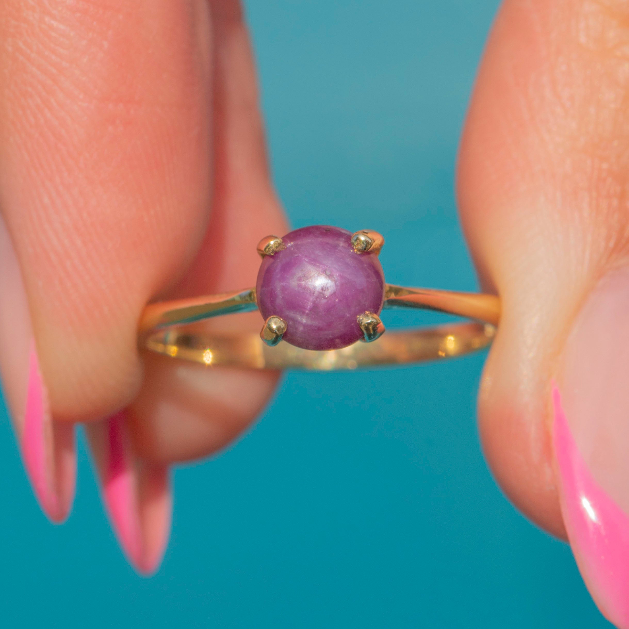 The round Ruby cabochon is displayed within neat claws and held proudly from the finger in a double basket setting. The 9ct Gold band caresses the finger comfortably, with its buttery hue and high-shine polish making this Star Ruby ring a luxurious addition to your collection!