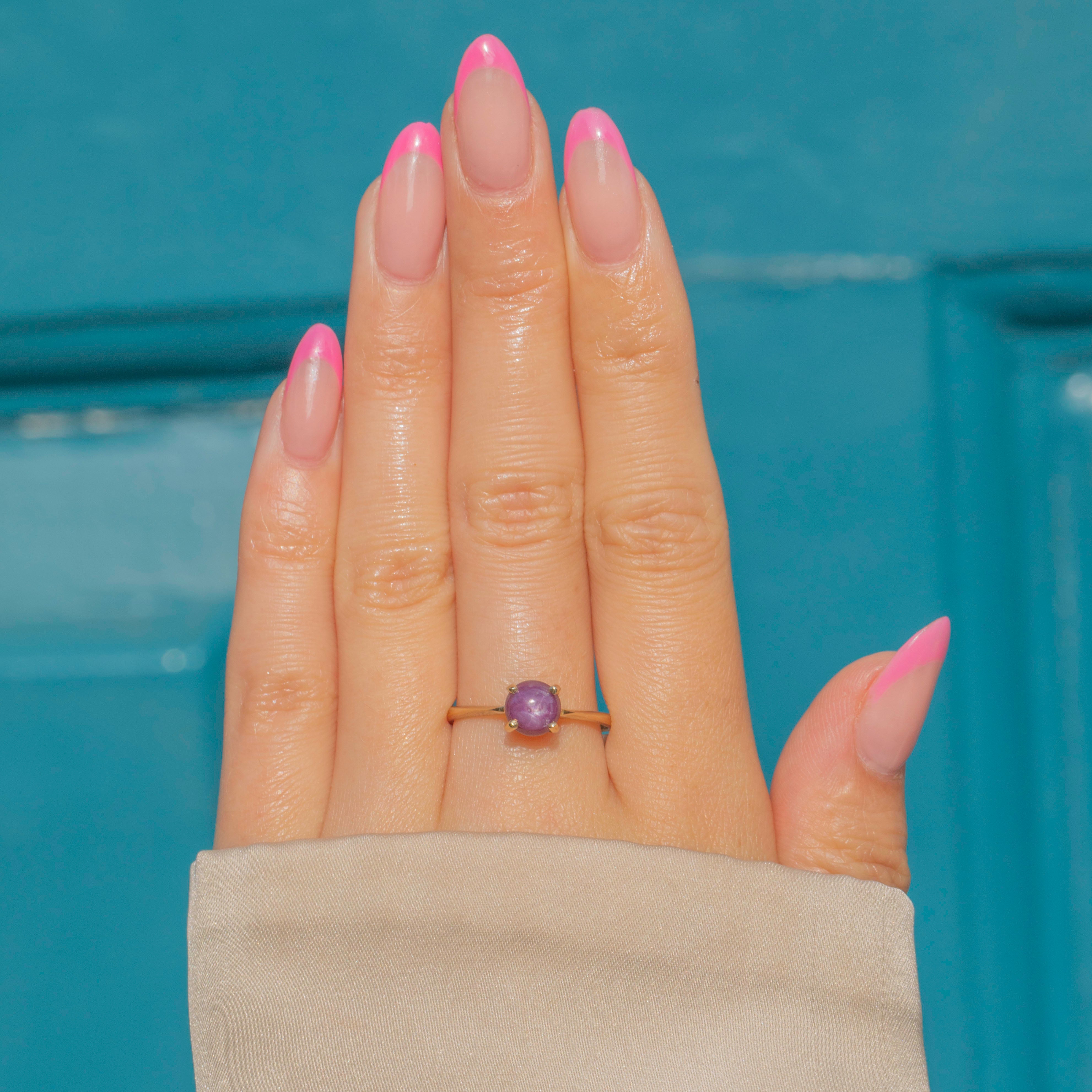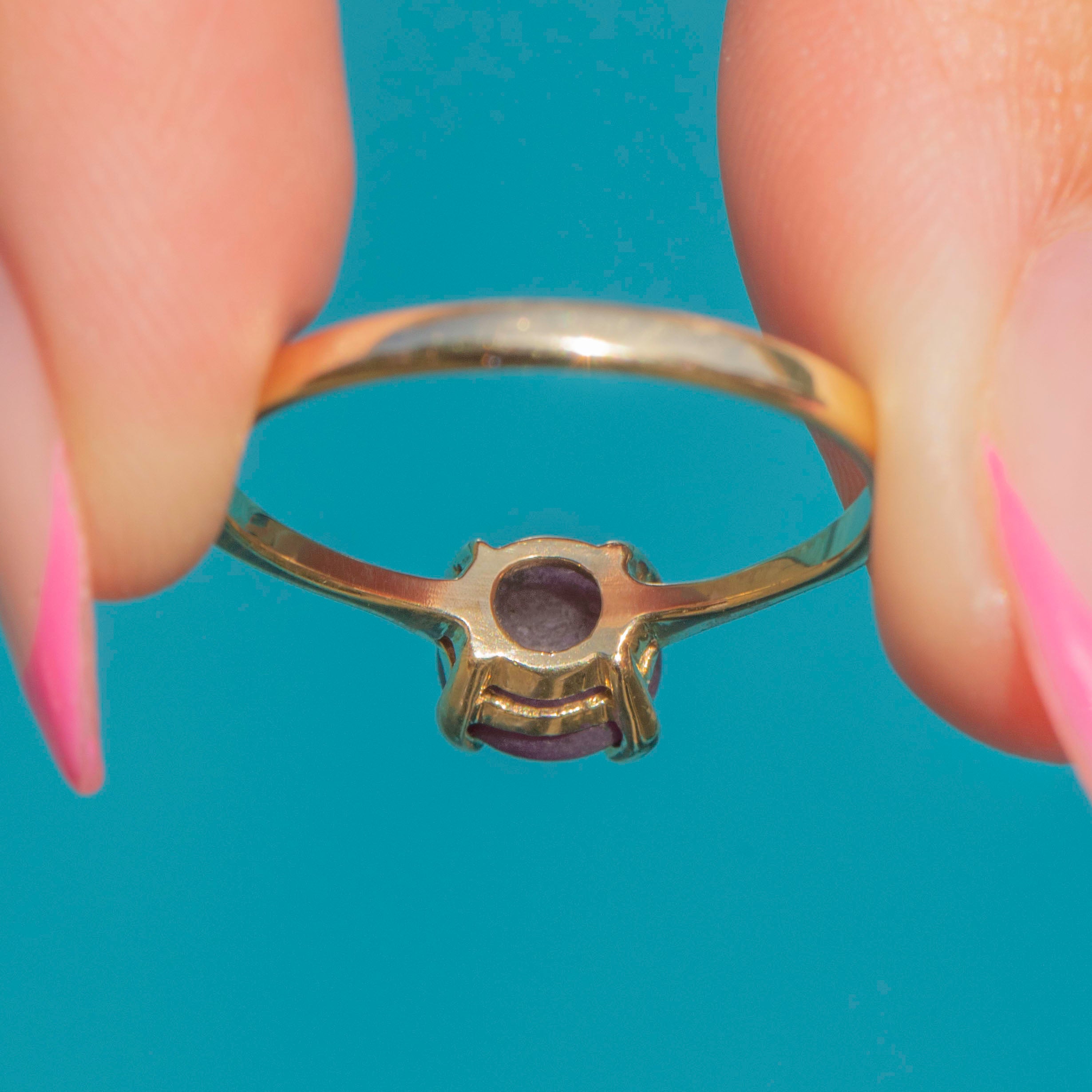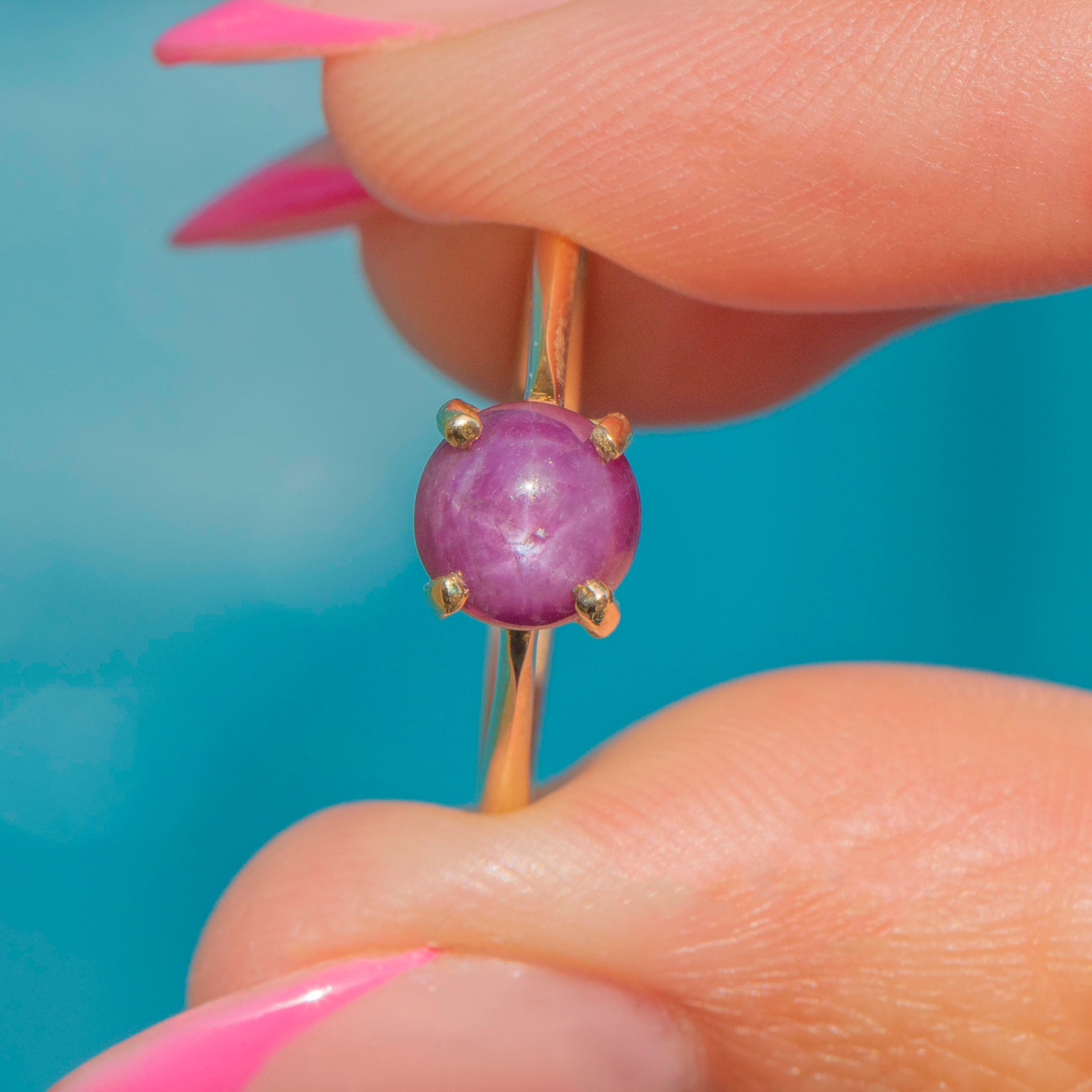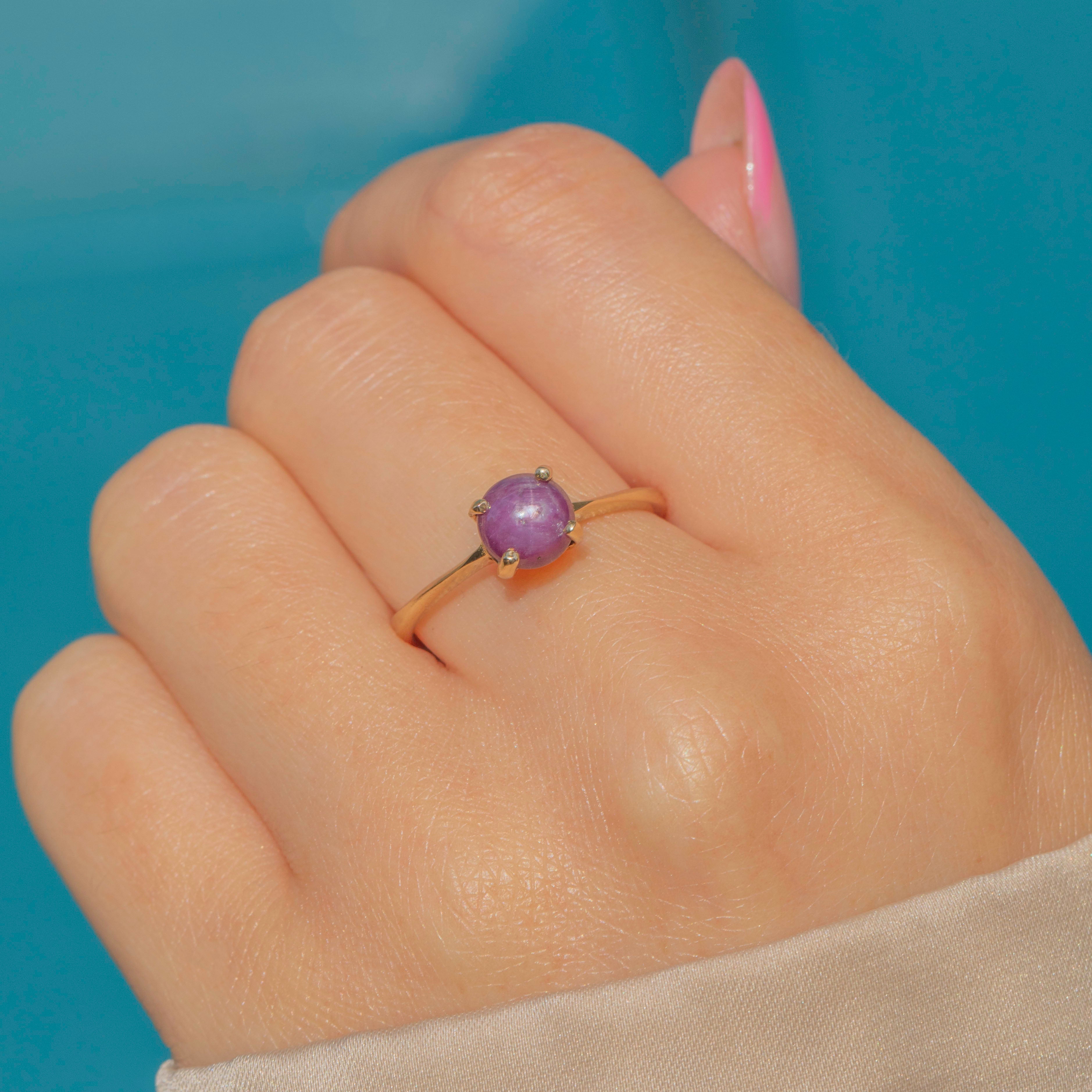 The round Ruby cabochon is displayed within neat claws and held proudly from the finger in a double basket setting. The 9ct Gold band caresses the finger comfortably, with its buttery hue and high-shine polish making this Star Ruby ring a luxurious addition to your collection!