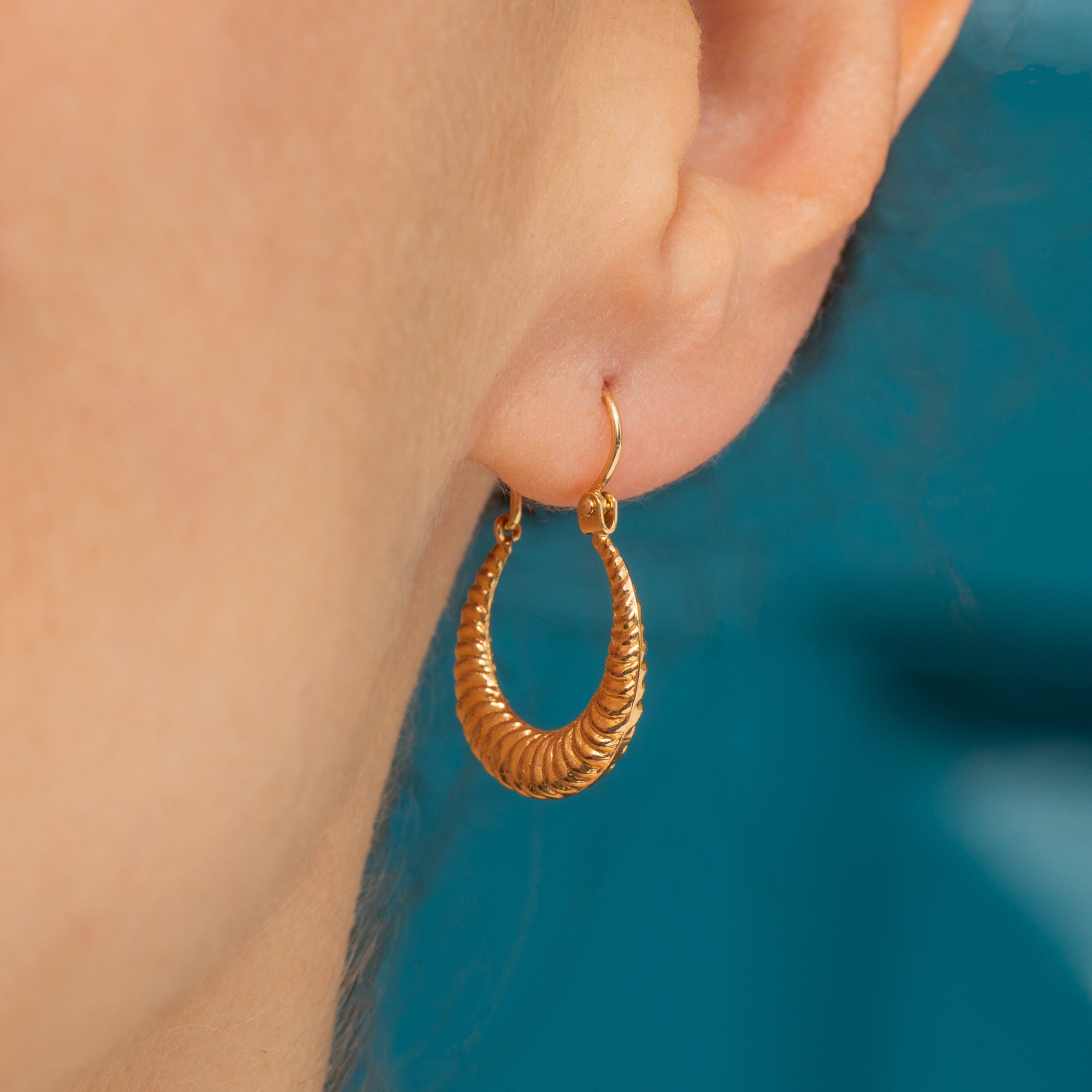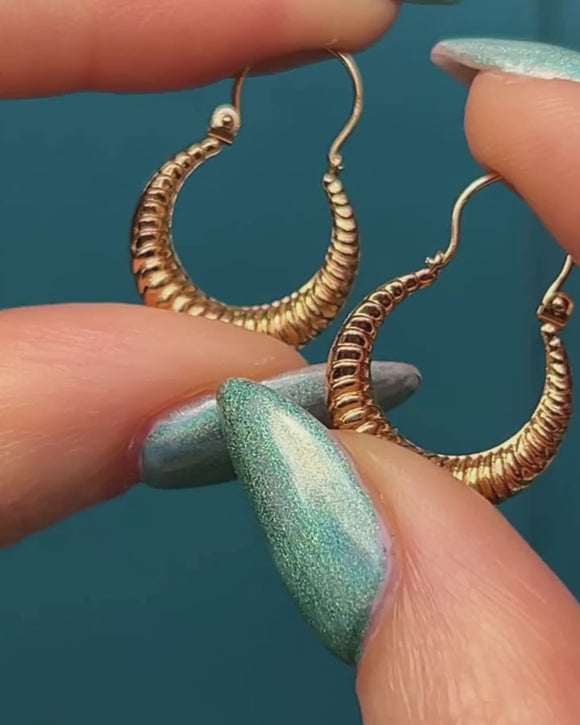 These vintage Gold hoops offer a sublime twist, literally, on a classic Gold hoop, with stunning engraved detailing that alternates in pattern. This pair will see you through from dawn until dusk with ease!