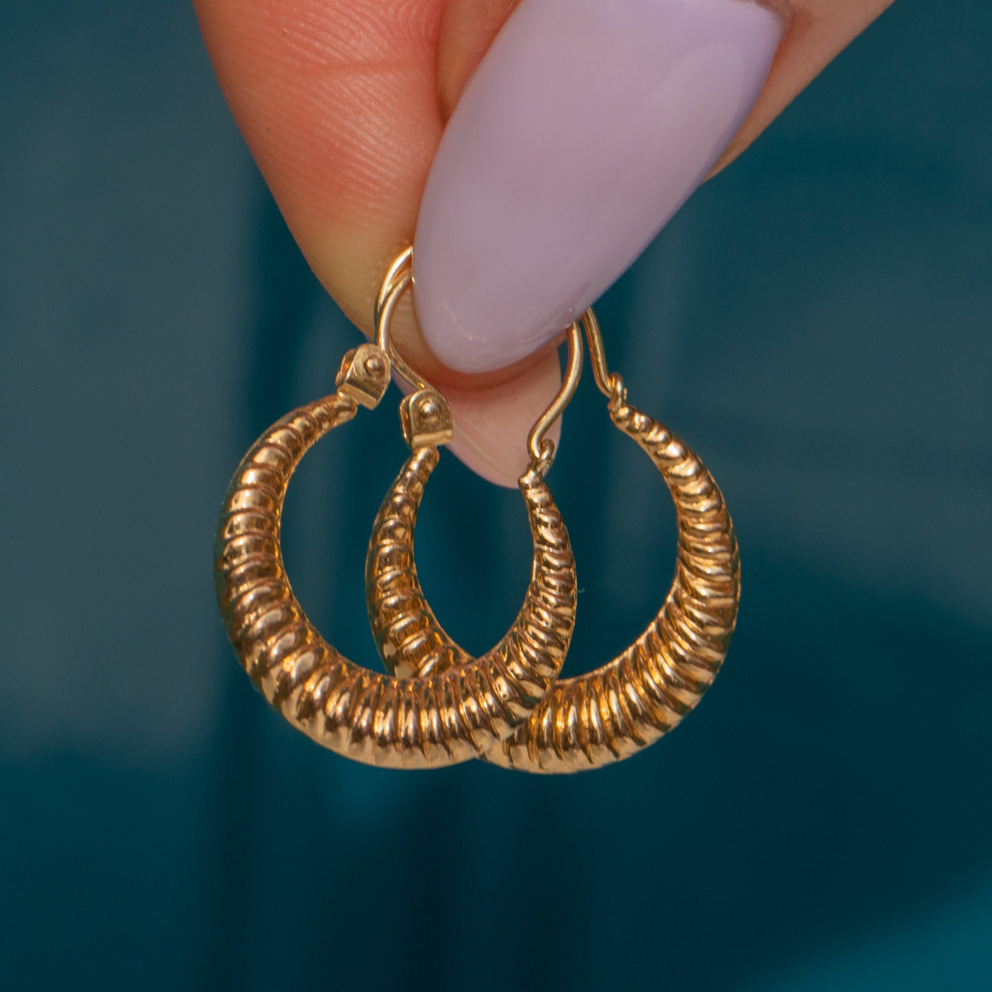 EXCELLENT. These 9ct Gold textured hoop earrings are in excellent condition! The Gold is buttery throughout and the textured details are crisp, with no dings to note. These scrumptious solid Gold hoops will make a fine addition to your collection!