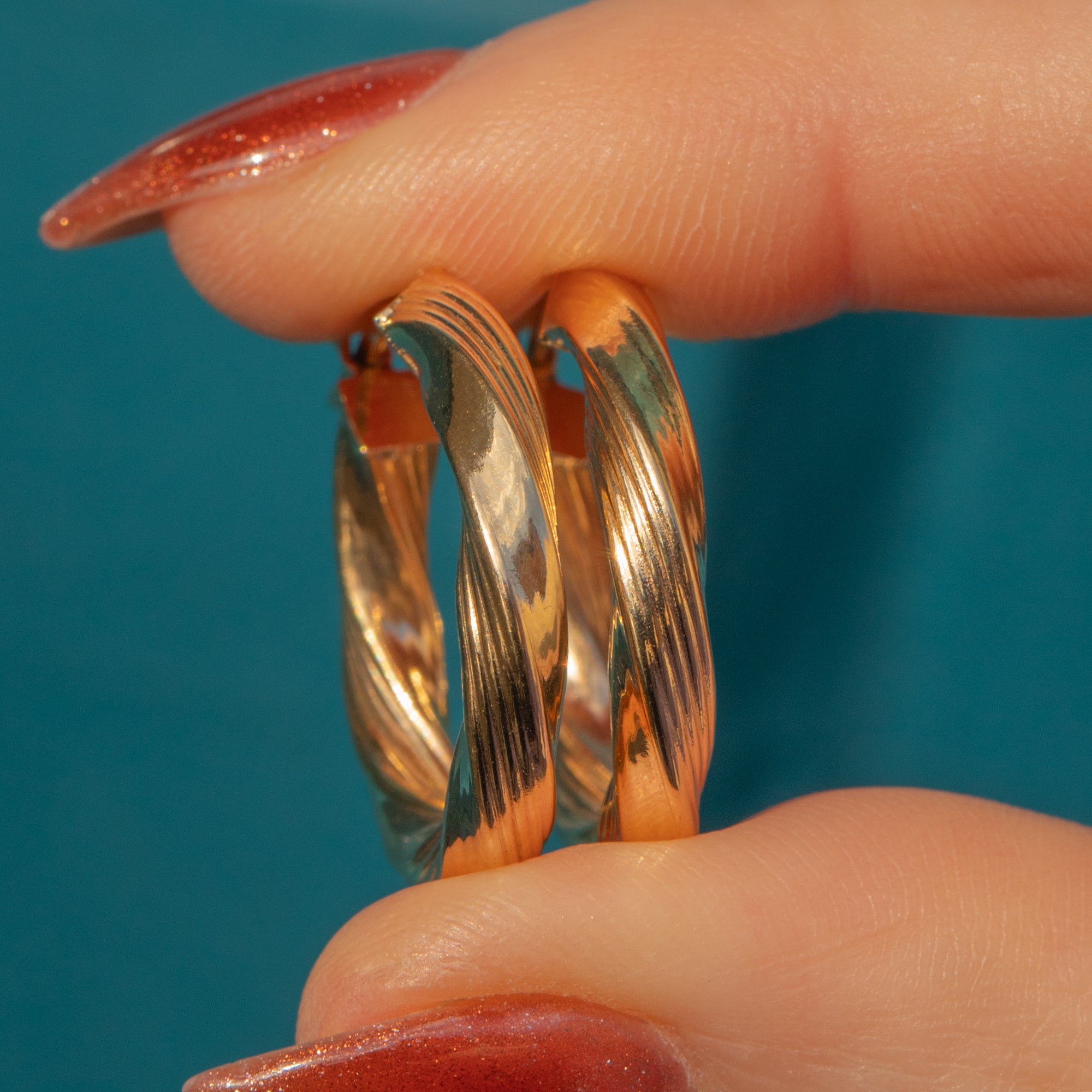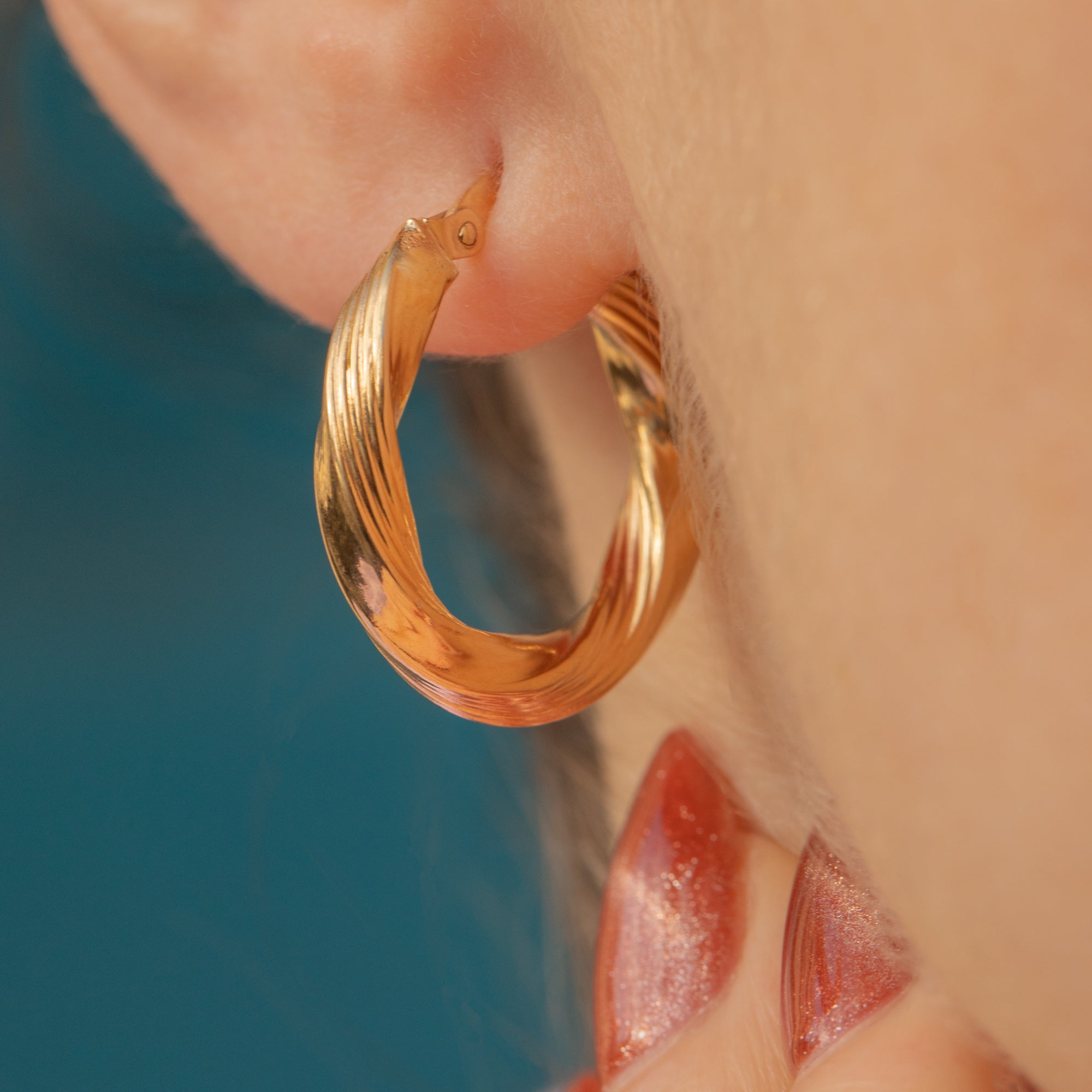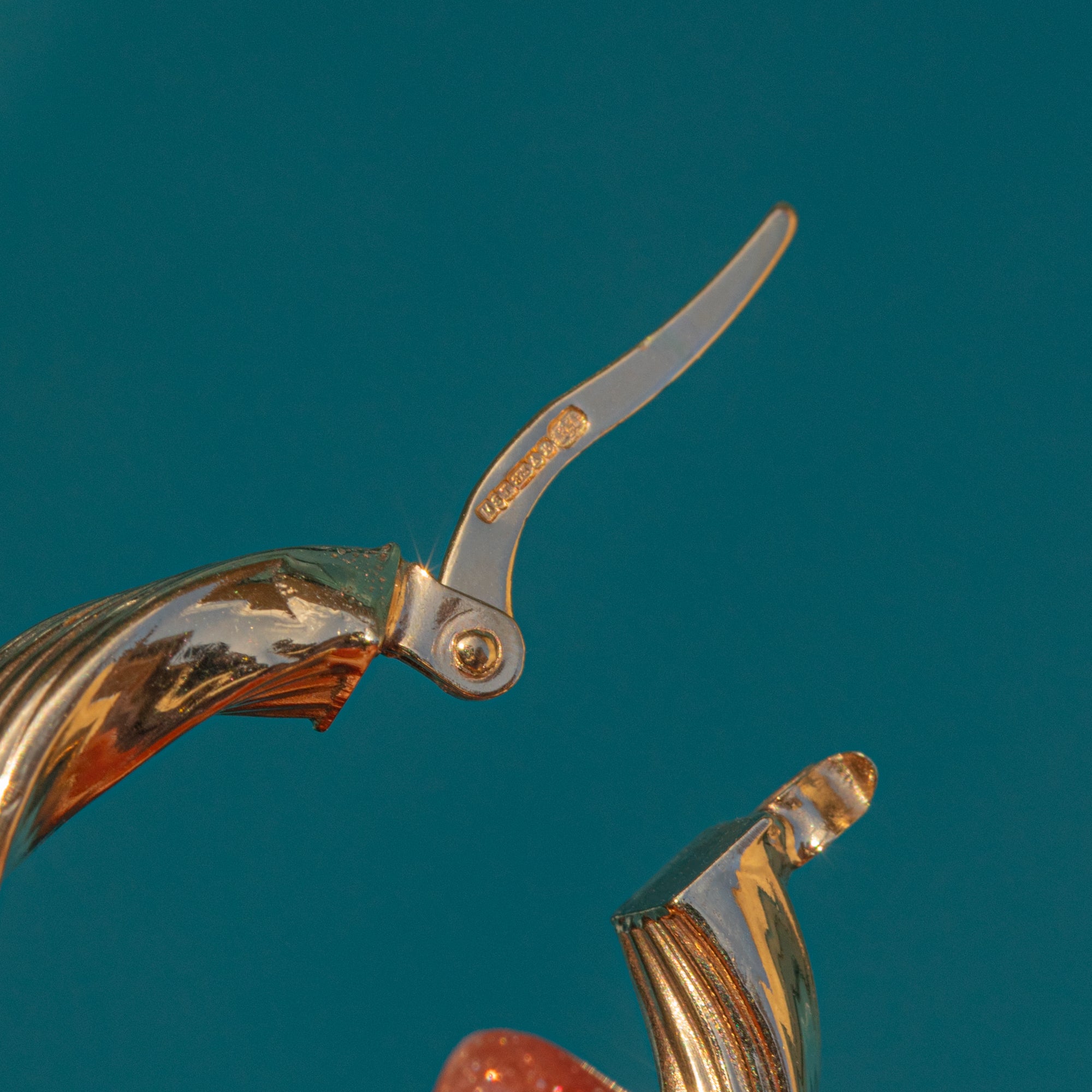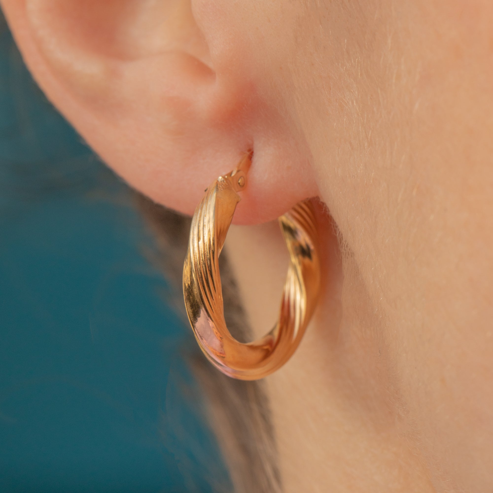A gorgeous pair of 9ct Gold twist hoop earrings to grace your lobes. These vintage hoops are the ultimate everyday earrings, composed of honey-hued 9ct Gold and with a woven, twisted design.