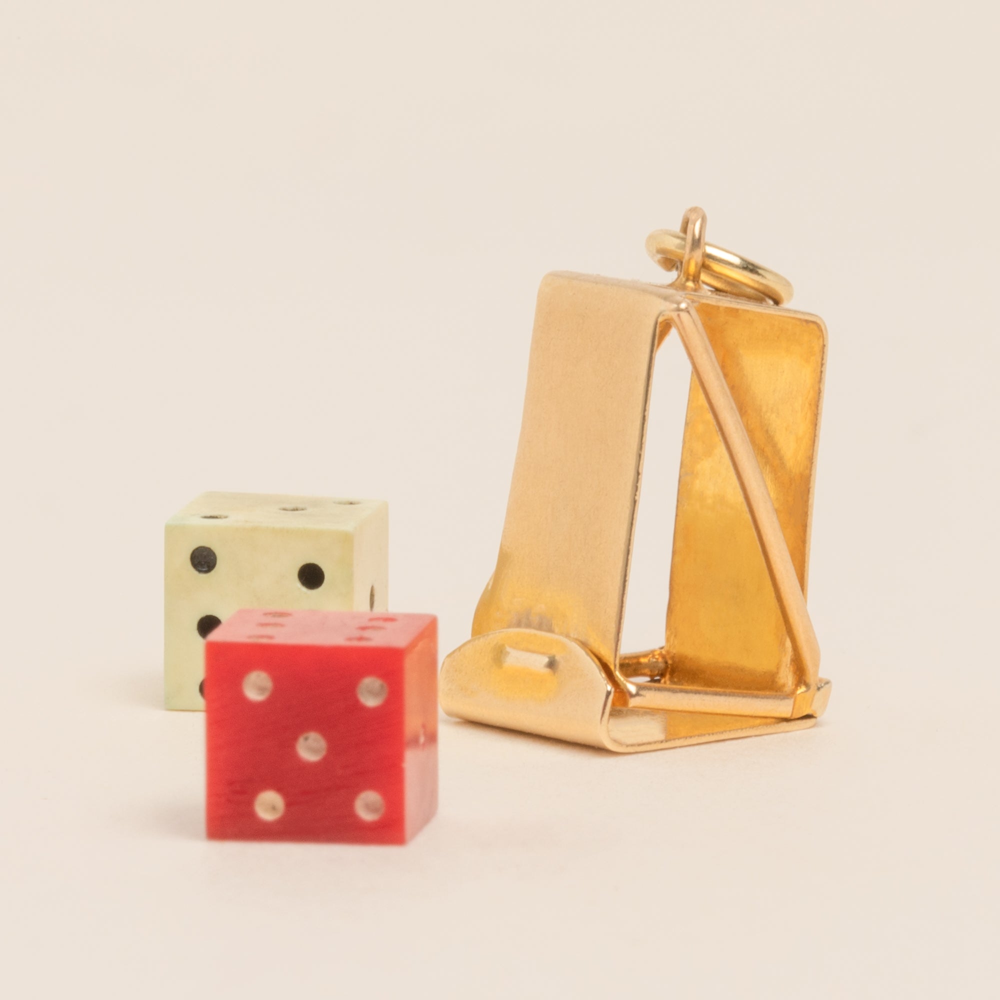 Roll the dice in style with this 9ct Gold two dice holder charm! Combining luck and luxury, her dice holder is formed of solid 9ct Gold, with a buttery hue throughout, homing two dinky dice, one red, one white.