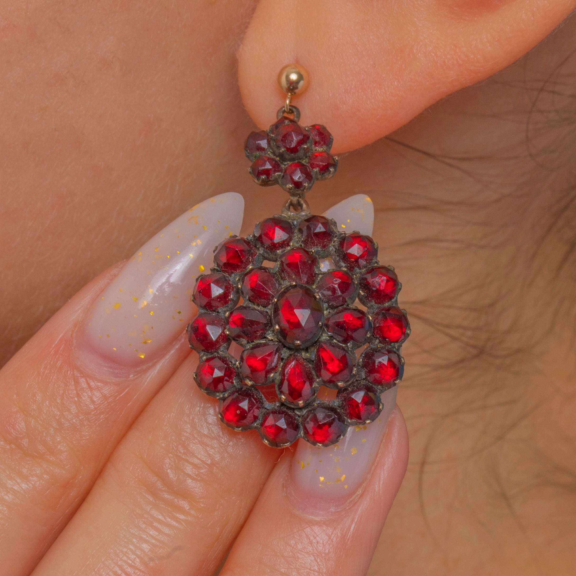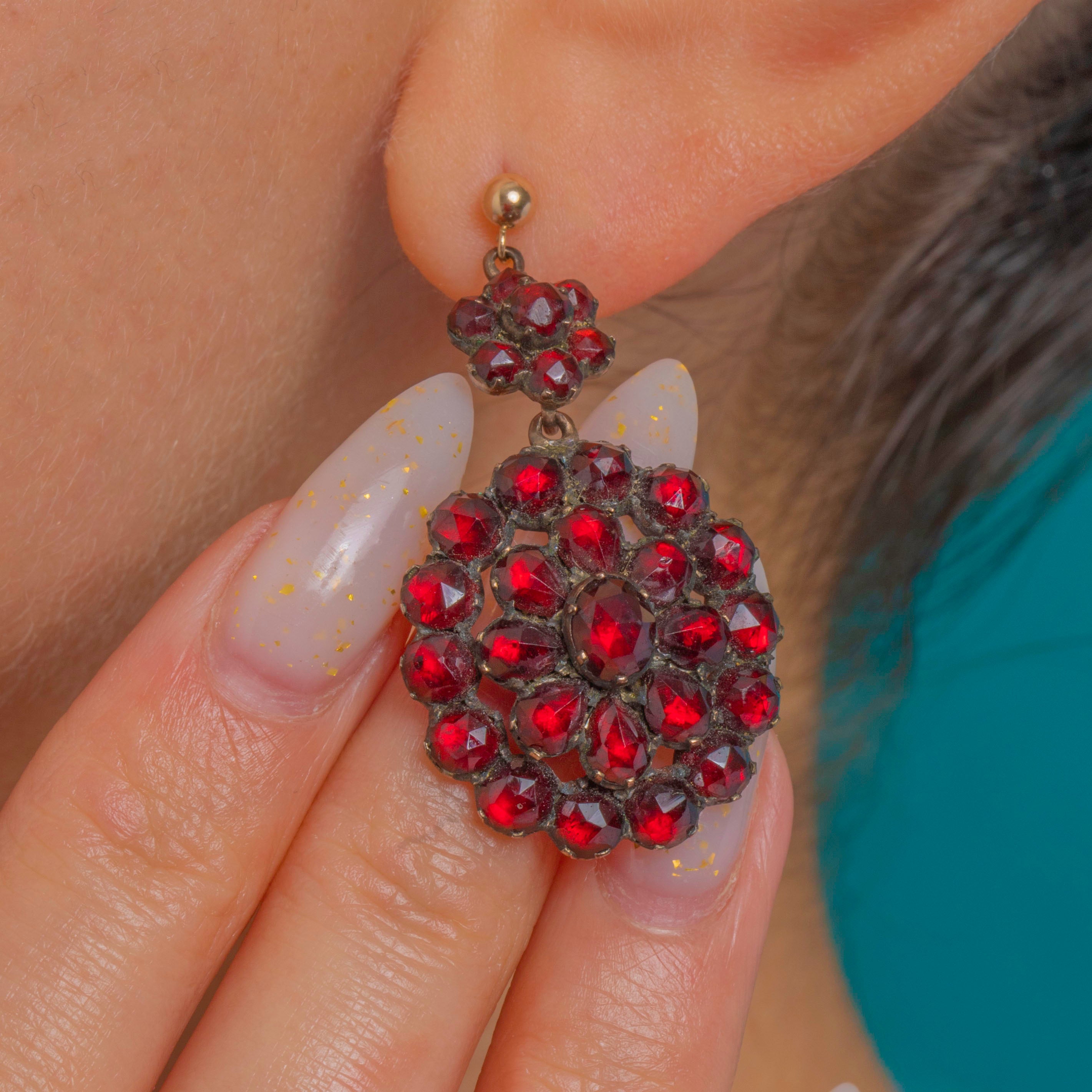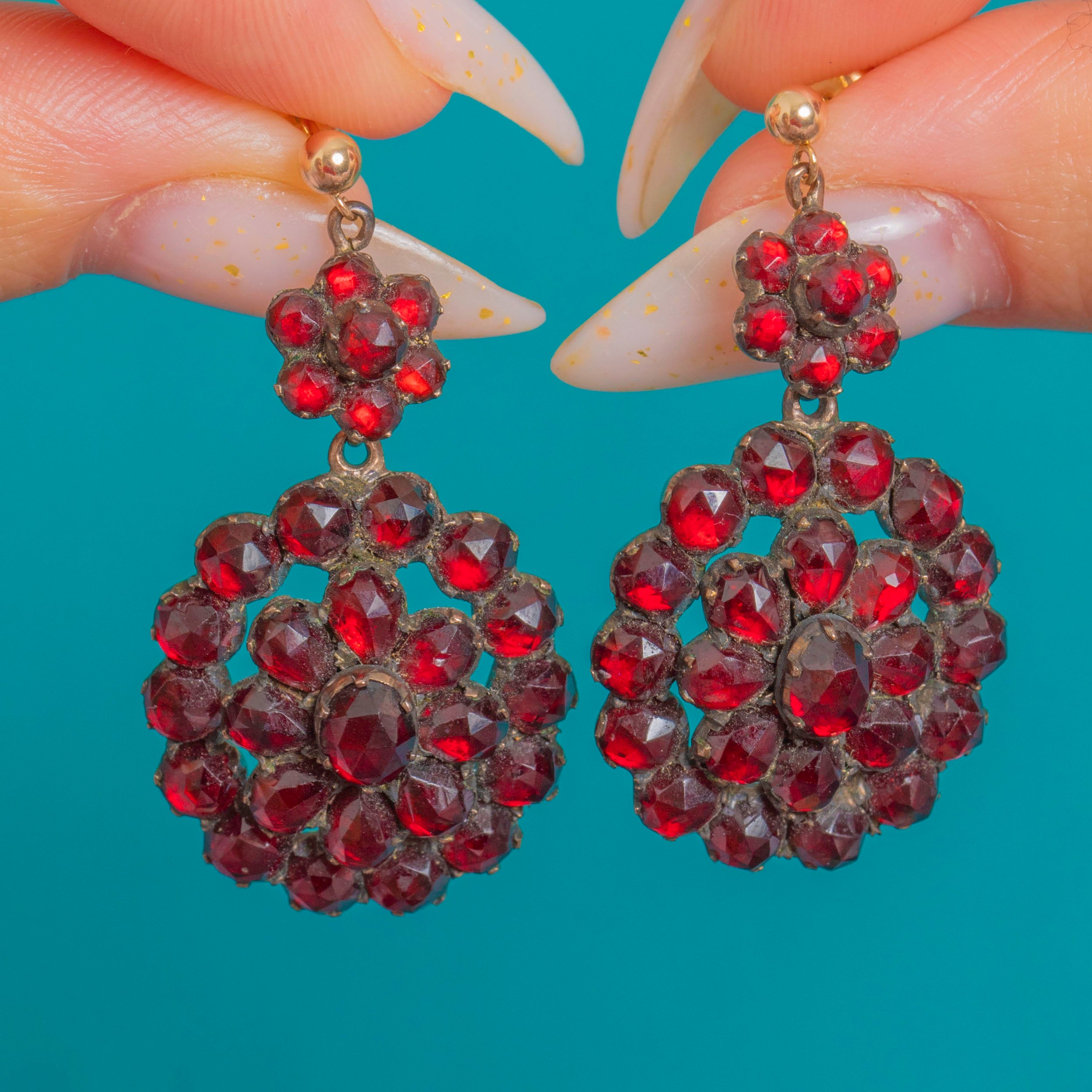 Romantic and richly hued, this Victorian pair of blood-red rose-cut Garnet cluster drops showcase two-tiers of articulated rosettes ablaze with deep red sparkle!!