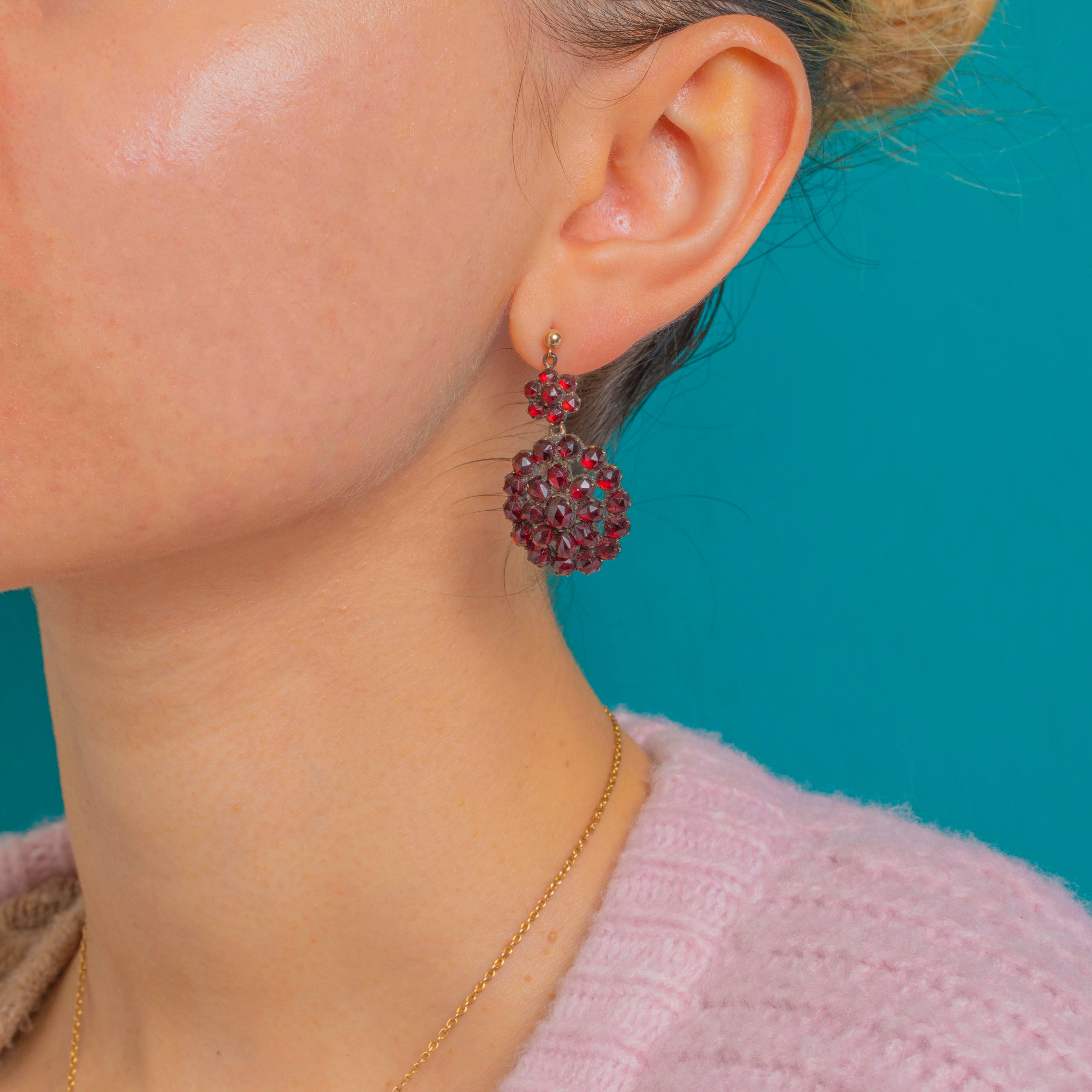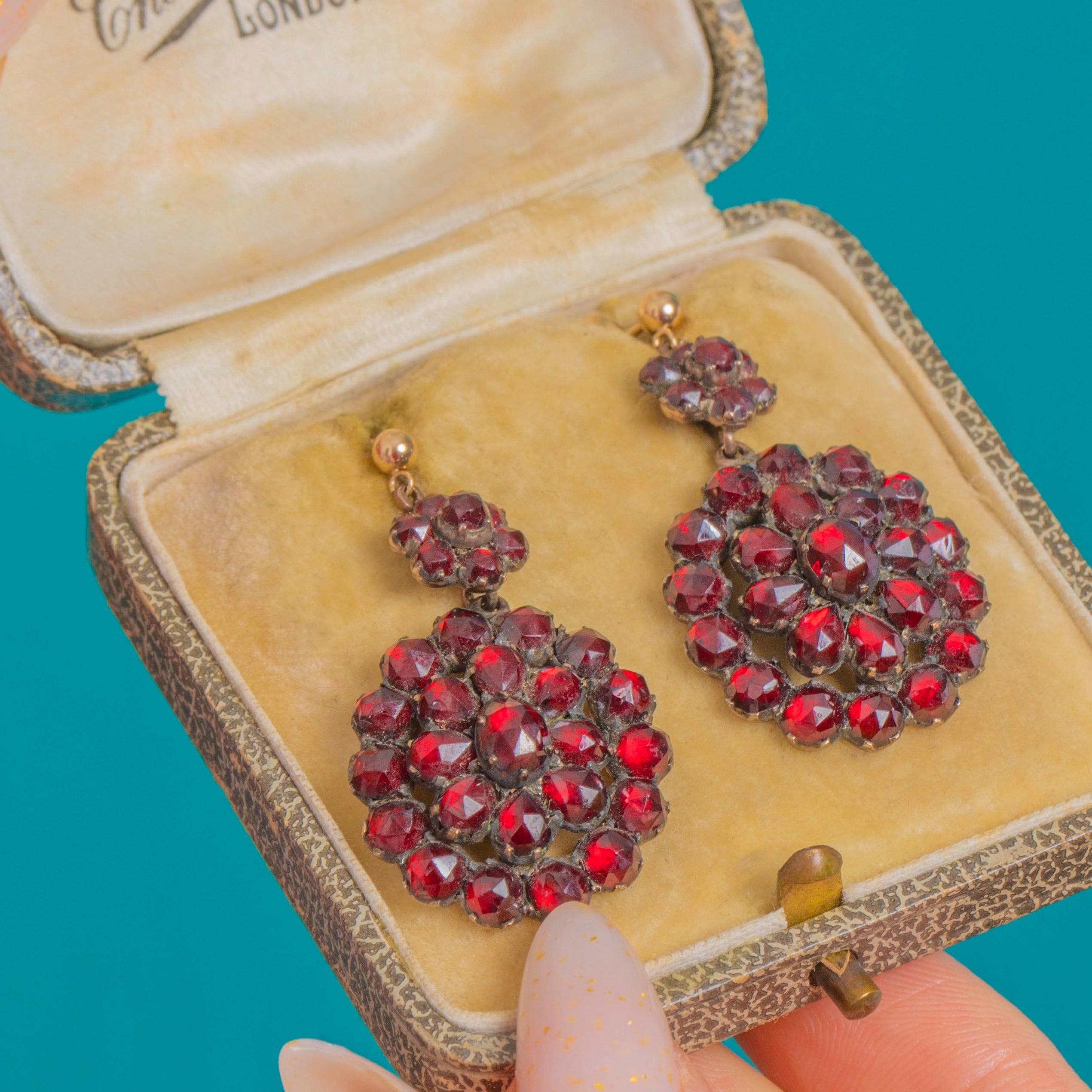 9ct Gold Victorian Rose-Cut Garnet Cluster Earrings, FITTED ANTIQUE BOX