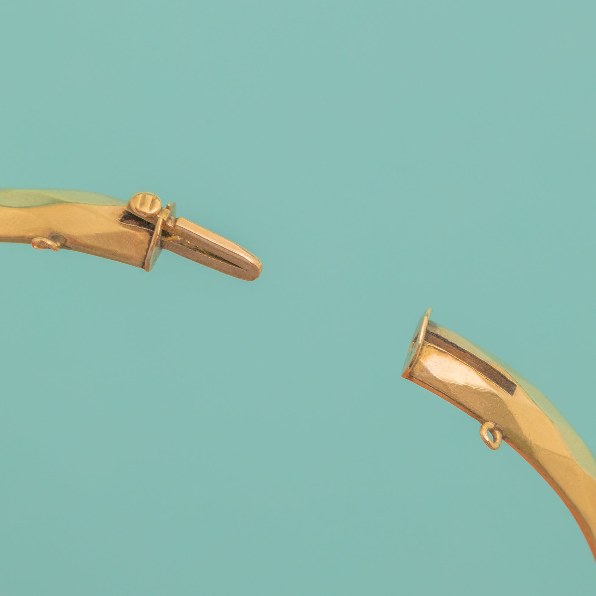 VERY GOOD: This 9ct Rolled Gold faceted bangle is in very good condition! The Gold has a bright and buttery hue with some subtle wear along the edge of the facets, but nothing that detracts from her overall splendour. The bangle closes securely, so you can wear it with utmost confidence!