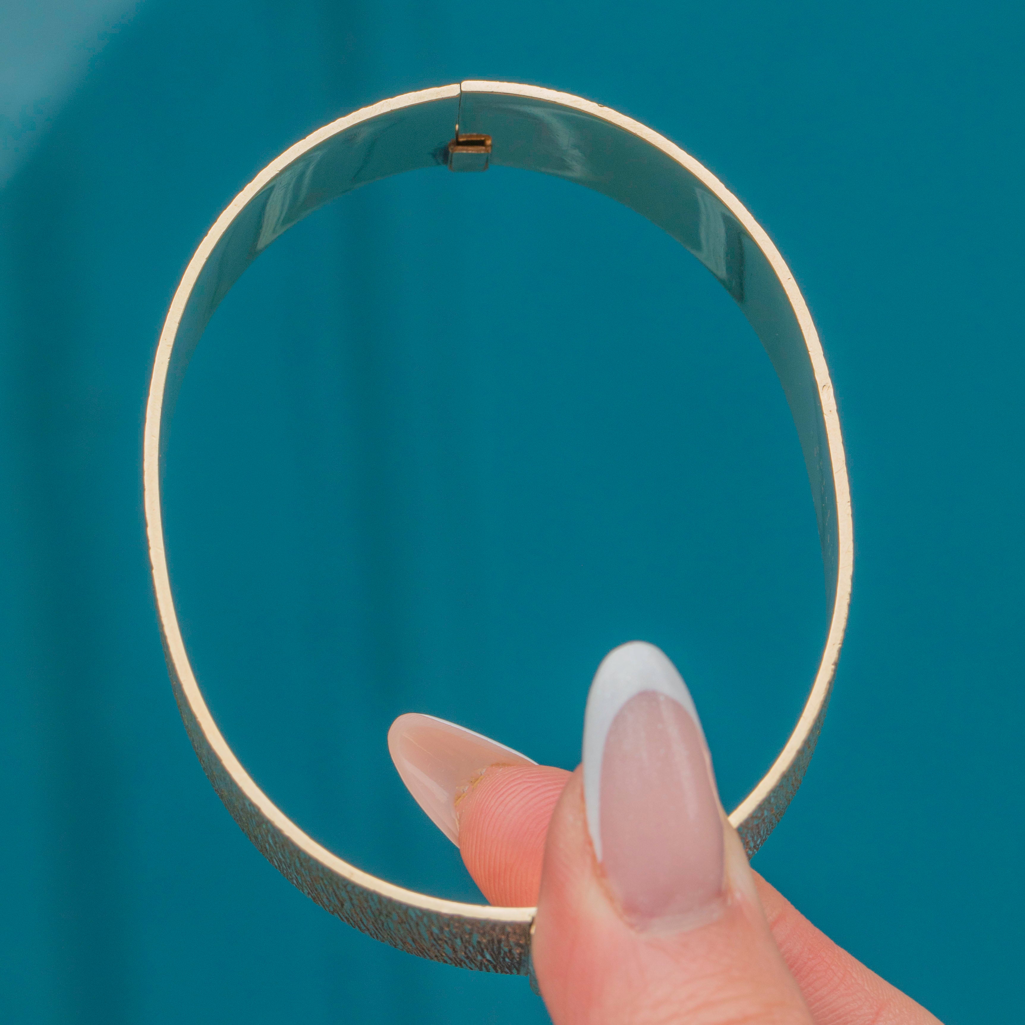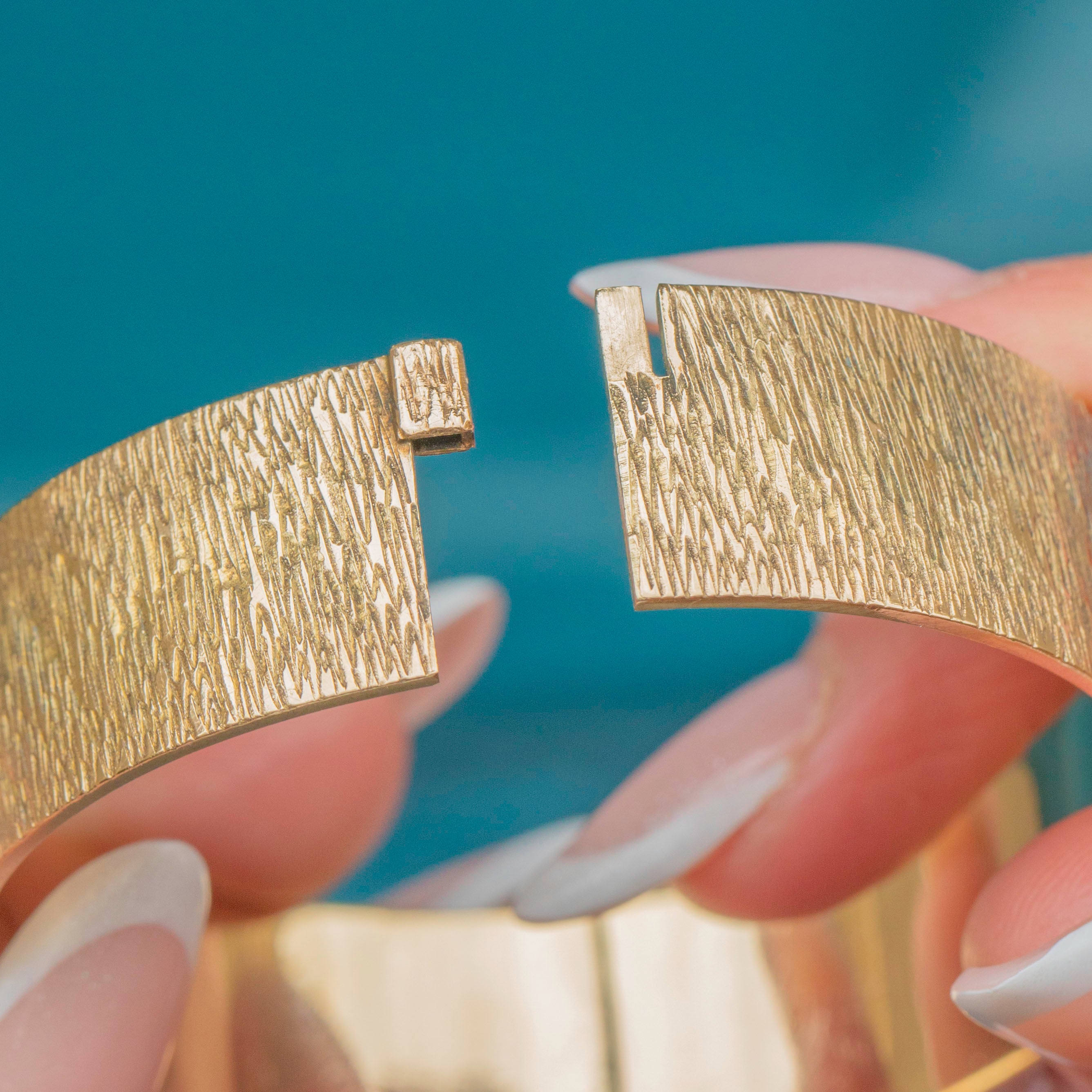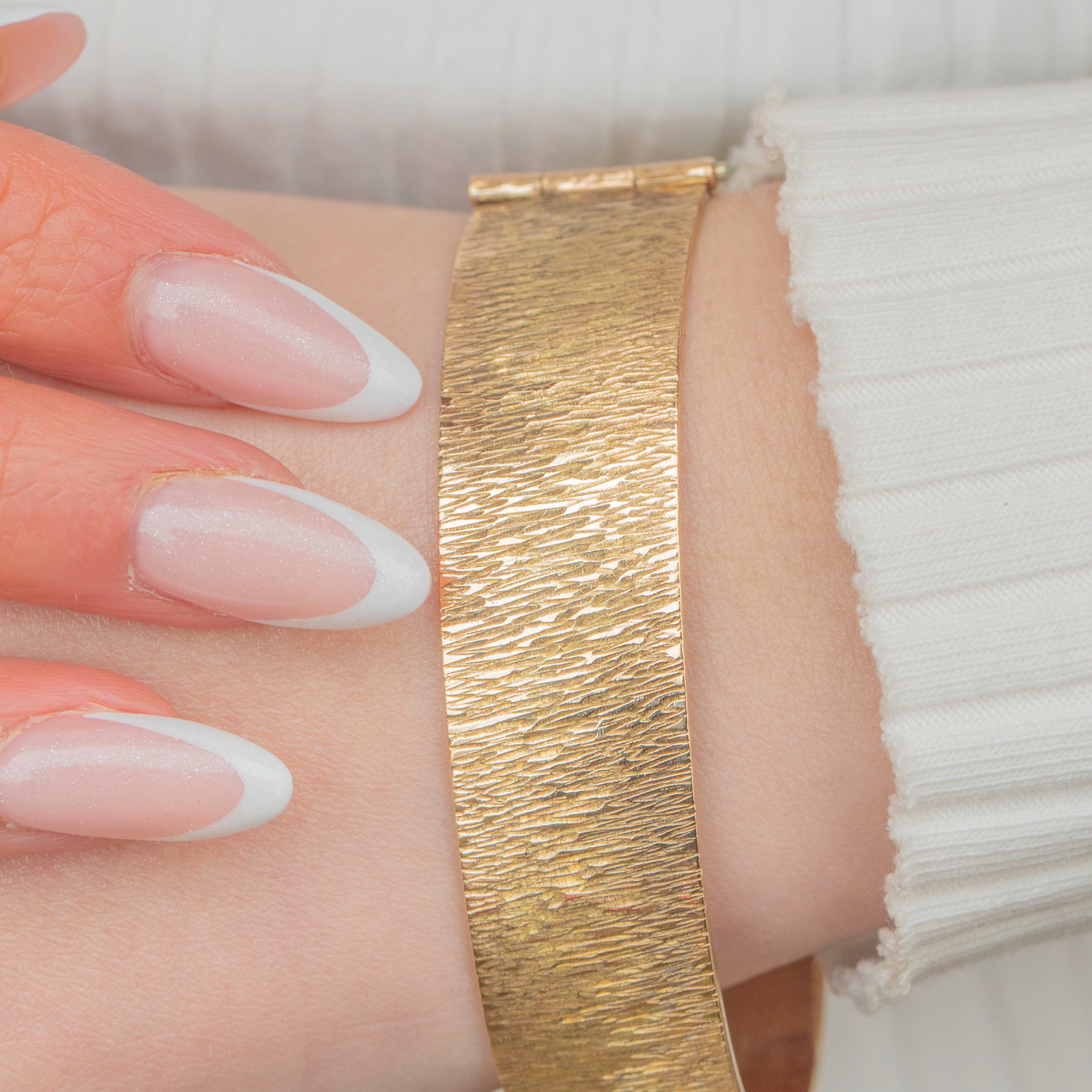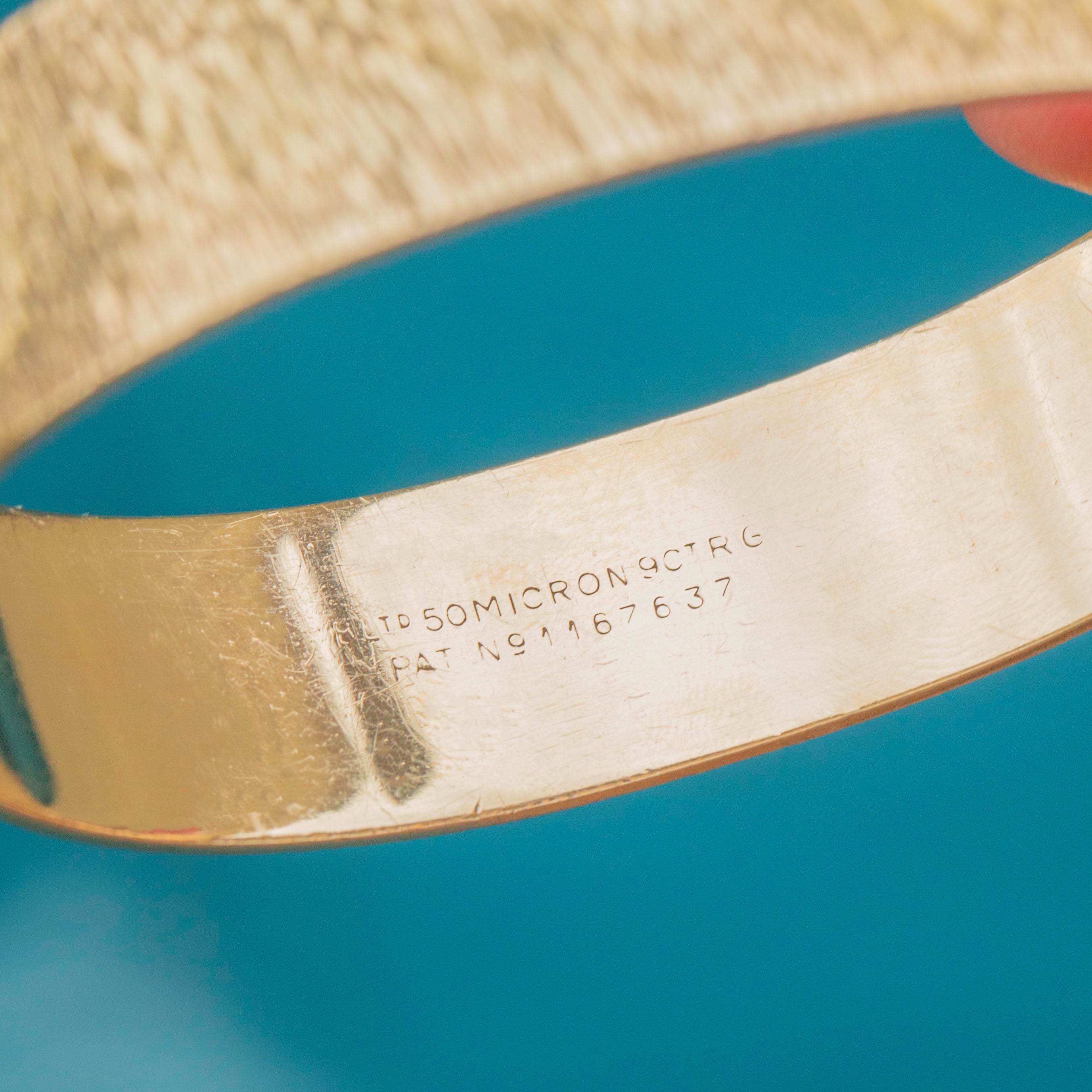 EXCELLENT: This 9ct Rolled Gold textured bangle is in excellent condition. The textured surface has remained defined and the rolled Gold shows no signs of wear. The bangle has kept its form well and closes securely, providing comfortable and confident wear!