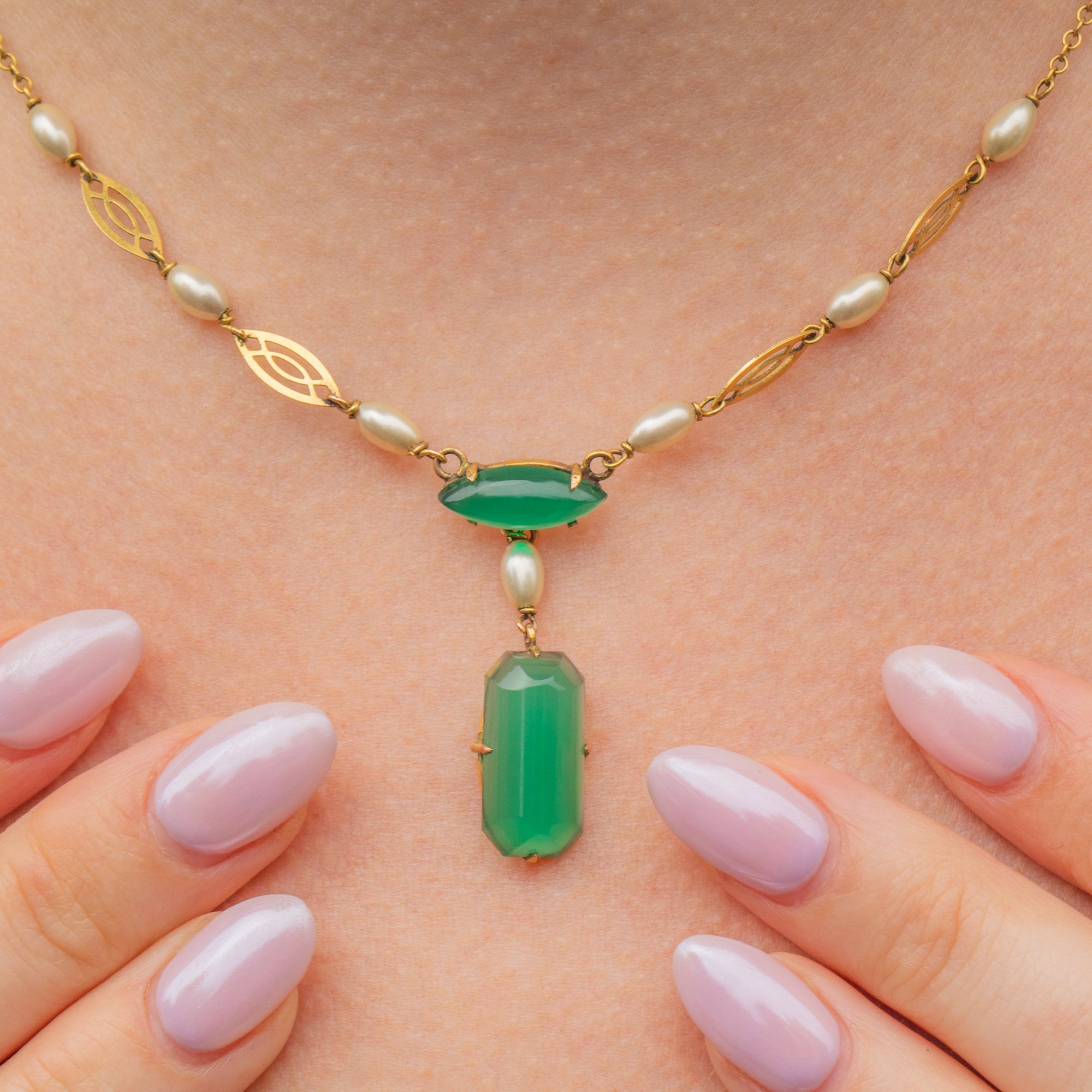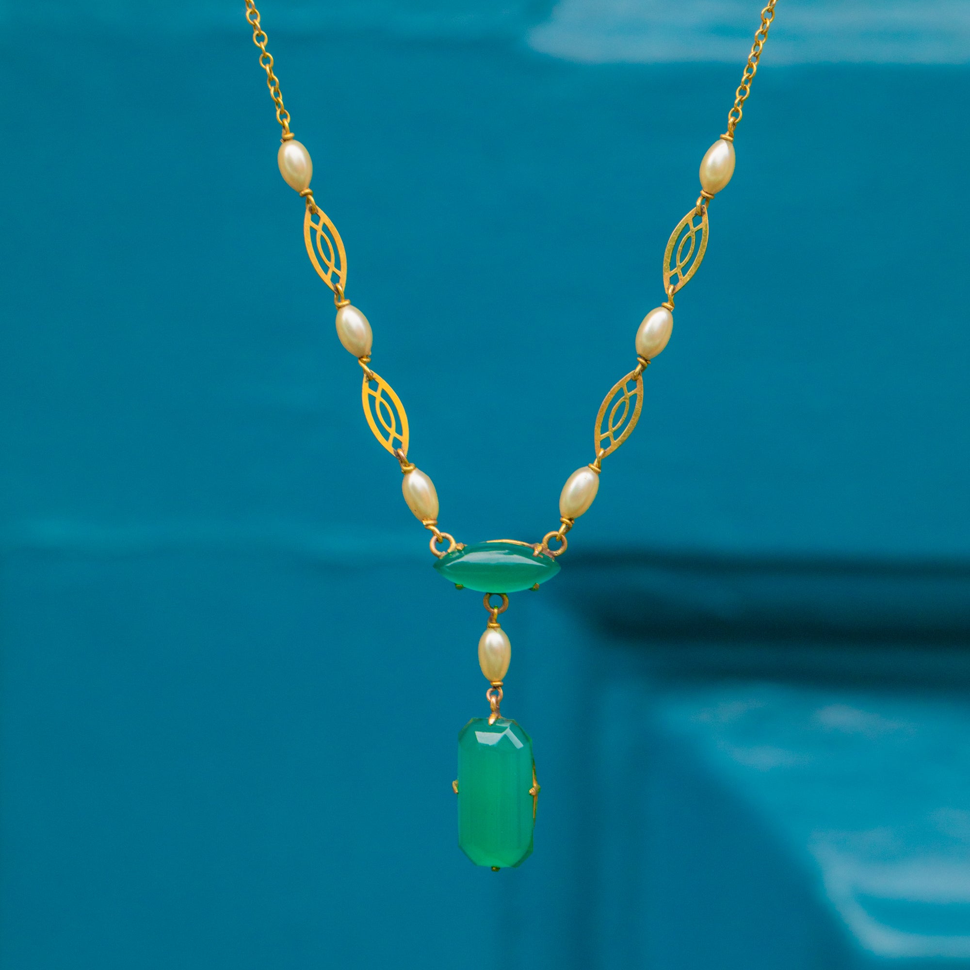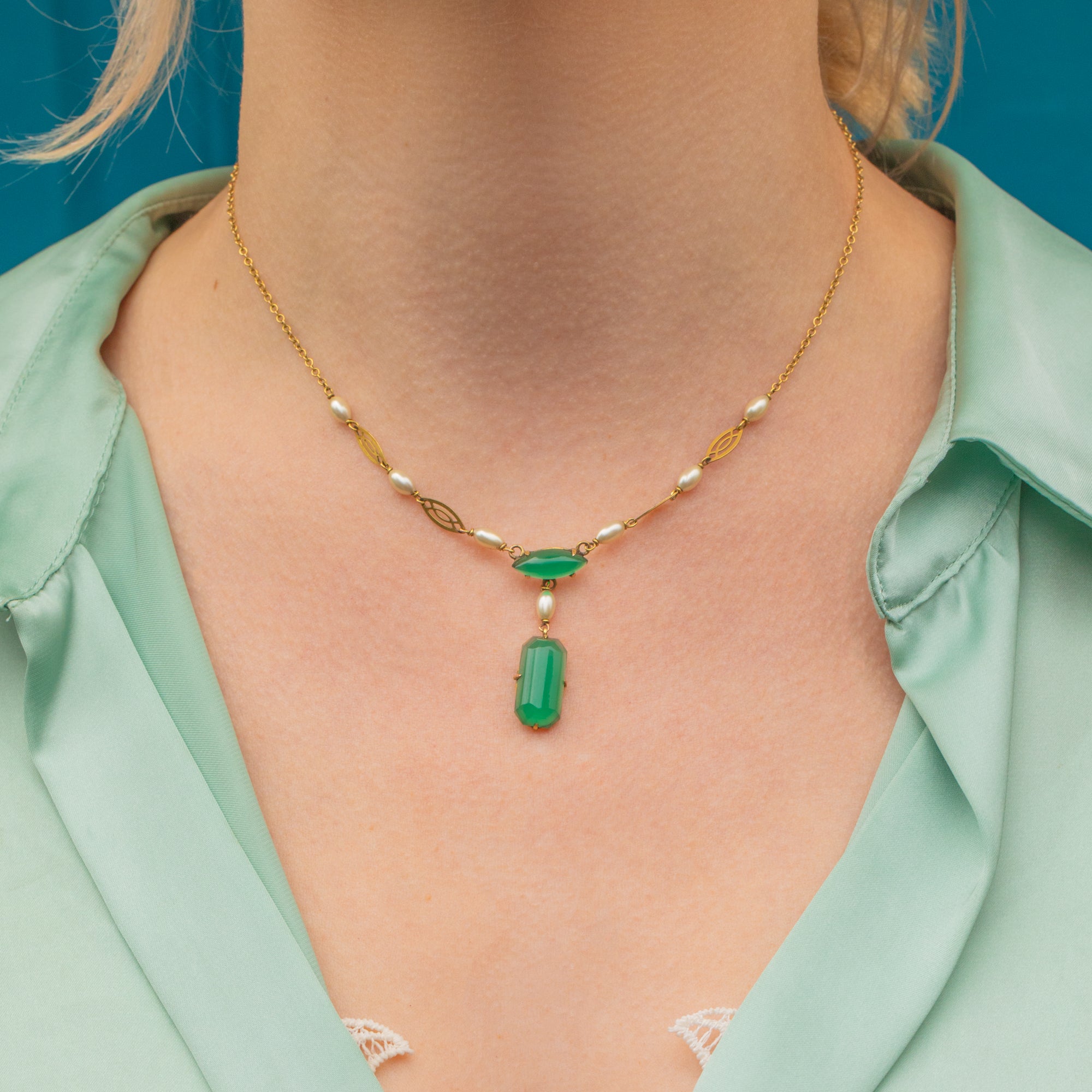 Antique 14ct Gold Chrysoprase Pearl Drop Necklace